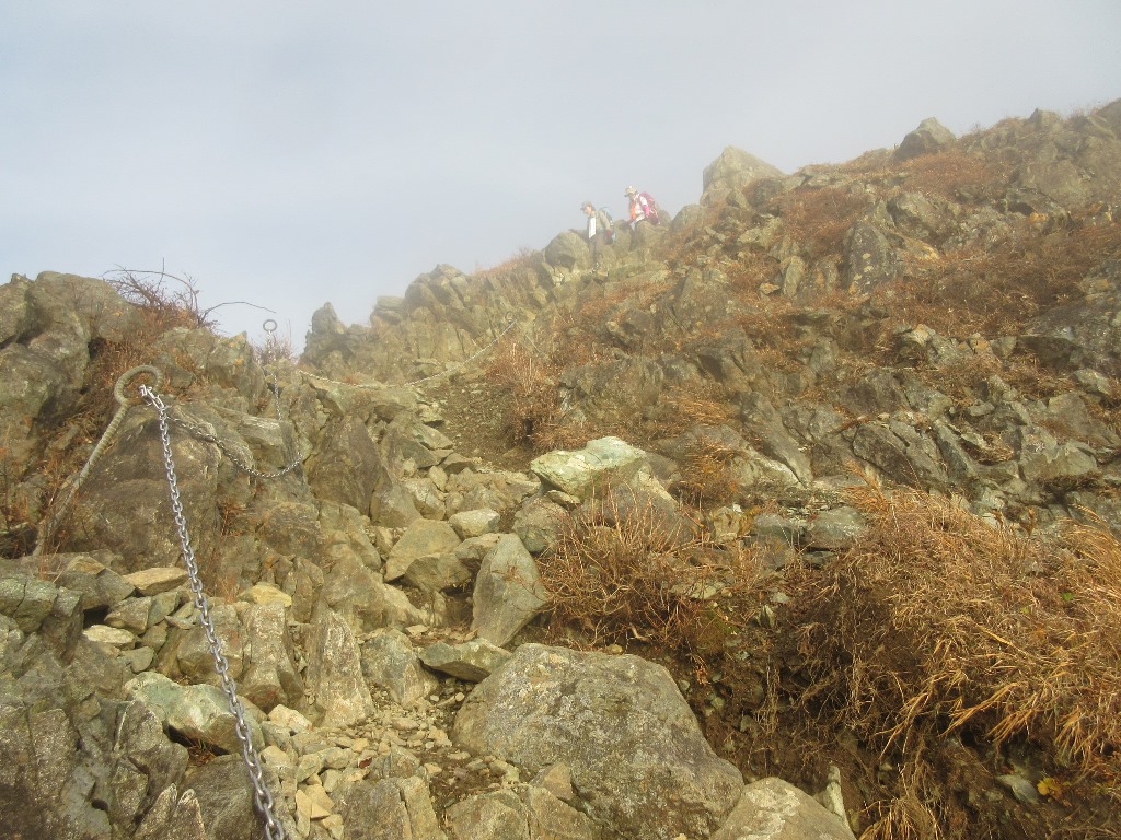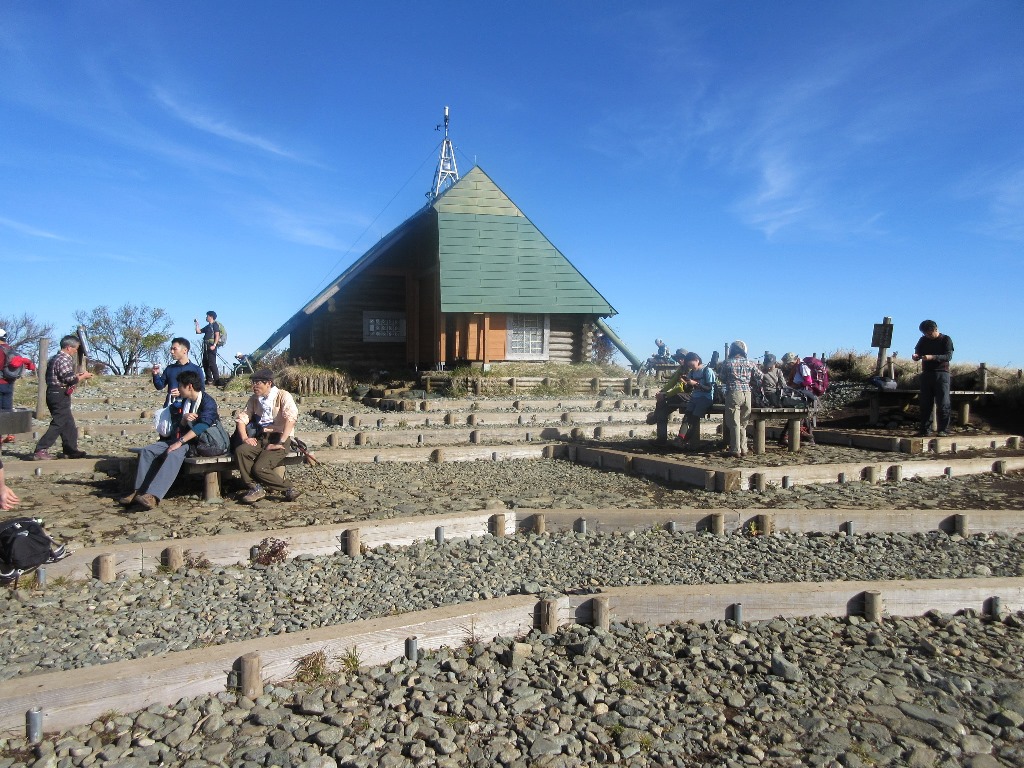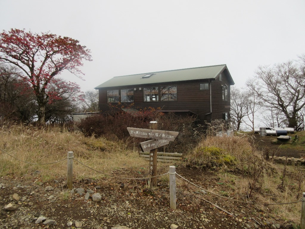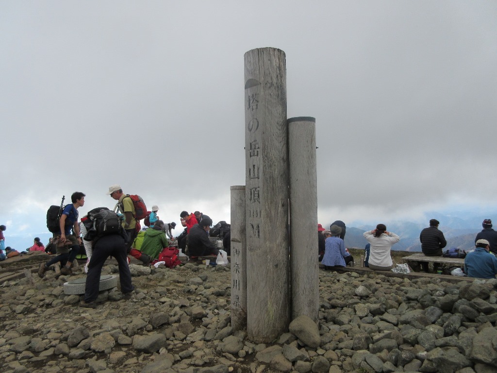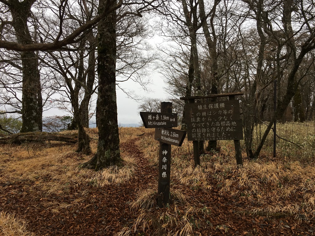 塔ノ岳を出発すると、途端に登山者の数が激減する。その分、のんびり山歩きが楽しめる。ブナ林と植生保護柵の目立つ登山道をアップダウンする。相変わらず木道が続き、この尾根筋は笹原が多い。ガスが沸き始め、富士山は視界から消える。丹沢山(1,567m)まで塔ノ岳から1時間9分の所要時間となる。標識に日本100名山と記していたので、丹沢の最高峰でないが、ここを登れば100名山登頂になるのかな。みやま山荘はひっそりしており、広場には他に5人いるのみだ。ガスのため視界はなく、少し冷えこんできた。蛭ヶ岳まで残り3.4Kmだ。ここから樹林がなくなり、笹原の見通しの良い登山道となる。ただ、ガスのため遠景は霞んで見えず。不動ノ峰、棚沢ノ頭を通り、鬼ヶ岩からの下りの鎖場を過ぎ、上り返すと蛭ヶ岳山荘に着く。