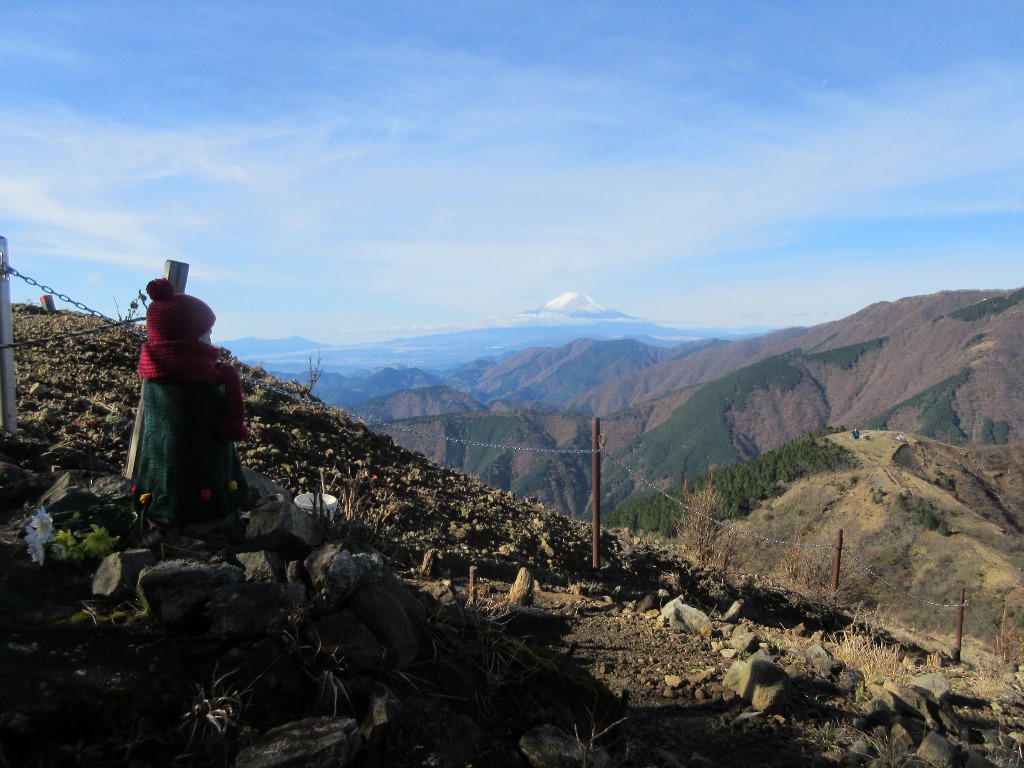 友人宅の最寄り駅本鵠沼から小田急で秦野まで行く。その先はバスの便とヤビツ峠から寺山富士見公衆トイレまで25分程歩くことを考え、タクシ-を利用する。そのため、寺山富士見公衆トイレが8時6分となり、約1時間の時間短縮が出来る。舗装道路を3分程歩き、塔ノ岳まで6.1Kmの標識を右に入る。登山道は木段から始まり、ほゞ登山道全体が木段で整備されている。歩き易い反面、足を踏んばるため力がいる。両サイドはブナ林で覆われている。歩き始めは登山者は少なかったが徐々に増え始め、私たちのペ-スが若干遅いためか、多くの登山者に追い越される。その度に止まるので、ペ-スが乱される。それでも二ノ塔まで1時間8分なので、標準タイムの到着だ。比較的若い登山者が多かったせいか。二ノ塔からは樹林から解放され、360度視界が開ける。昨日の雨で空気が澄み渡り、東方向に東京、神奈川の市街地が俯瞰され、相模湾の江の島の形がはっきり識別出来る。東方向には富士山が大きく聳える。この景色を見ながら、尾根道を20分歩くと三ノ塔(1,205m)に着く。三ノ塔には多くの登山者が休憩して、絶景に見入っている。私たちも、長すぎる休憩を取る。