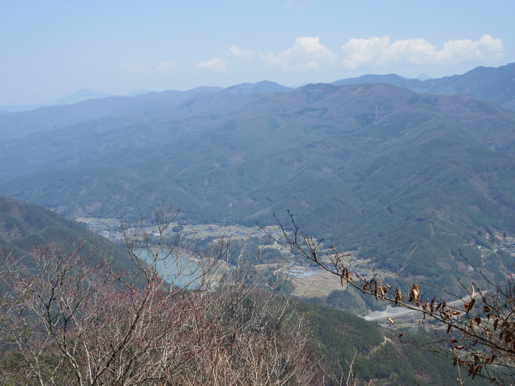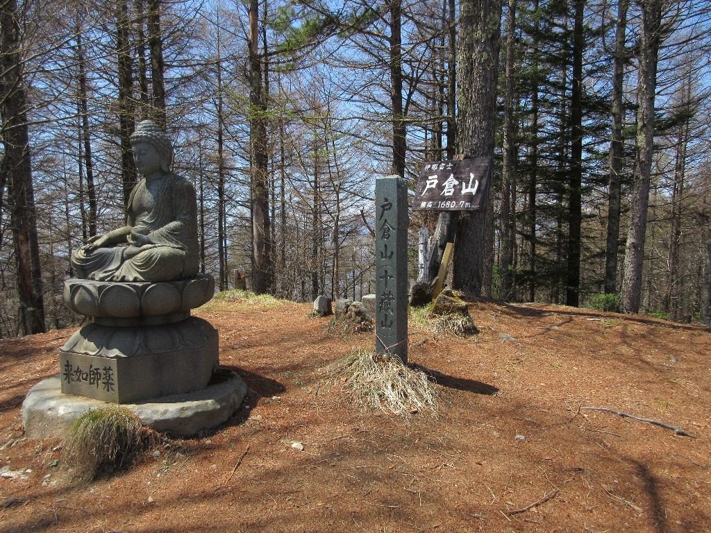 戸倉山西峰に登山口から56分で到達する。頂上には石碑や石祠が祀られ、信仰の山が窺える。ここから白化粧をした中央アルプスの山並みが美しい。その遥か右に、乗鞍岳と北アルプスの山々が垣間見える。別の方向には南アルプスの塩見岳、荒川岳等が良く見通せる。しばらく山の景色に見入り、戸倉山東峰に向かう。戸倉山東峰は西峰程眺めは良くなかったが、仙丈岳が真正面に居座っている。眼下には長谷の美和湖が良く見える。ここには薬師如来の石像と1等三角点がある。2人の駒ヶ根市民の登山者が話していた。私も仲間に加わり、高山植物、木、野鳥の話等で盛り上がる。時間的に早いのでもう一山登ろうと、この近くで良い山がないか尋ねる。飯島町の傘山(からかさやま)と松川町の小八郎岳を推奨される。いずれも南アルプスの眺めがすばらしく、比較的簡単に登れるという。30分以上話し込んで、下山開始する。下りは歩き易い登山道ということもあり、30分強で登山口に着く。次の登山を傘山と決め、登山口の御嶽神社に向かう。飯島役場によって、傘山のコ-ス案内資料をもらう等していると、意外に時間を取り、結局登ることを諦める。中途半端な時間となり、帰りは安曇野まで一般道で帰る。