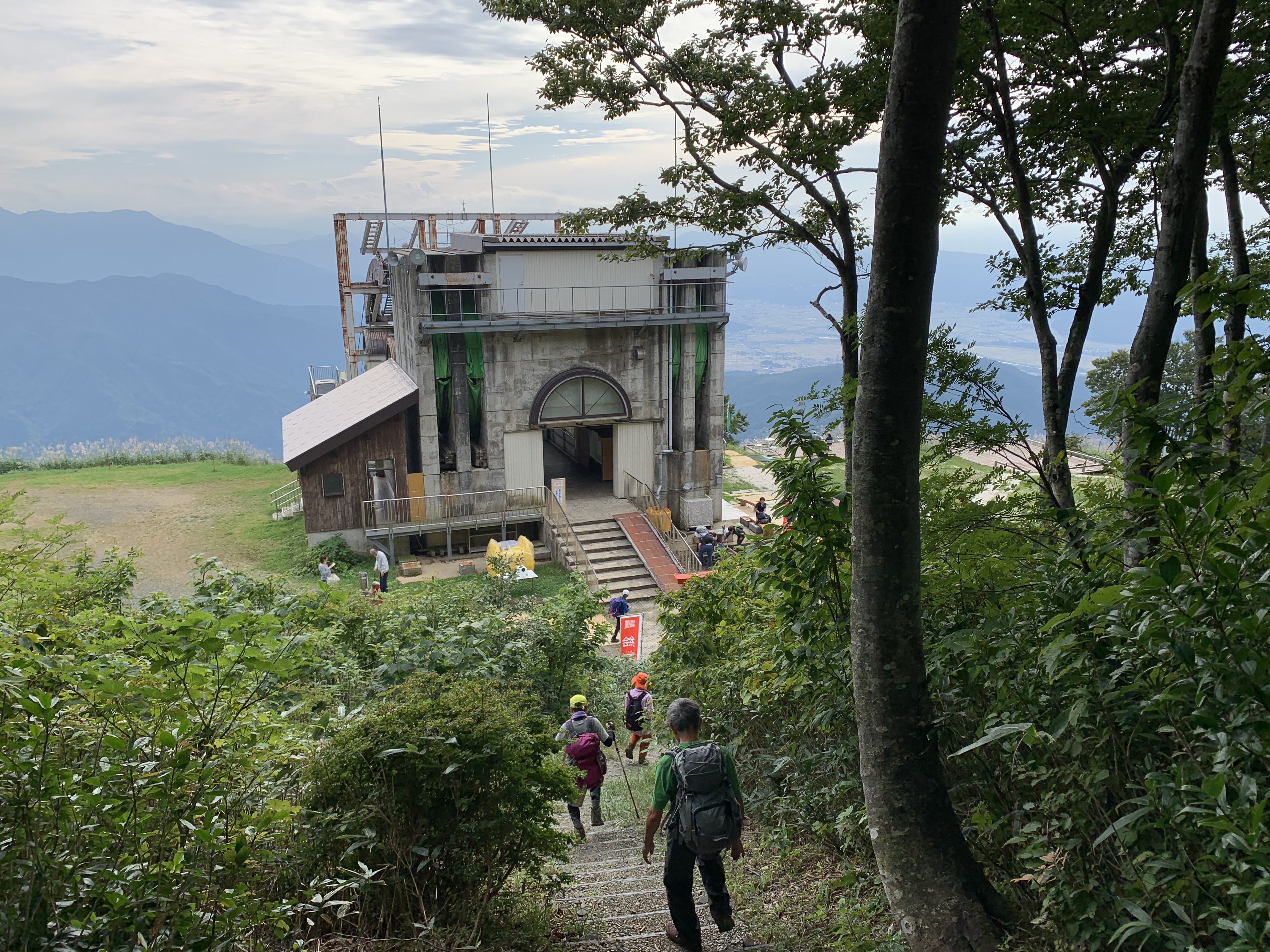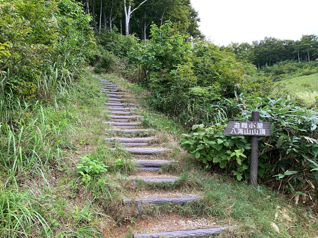 大倉口コ-ス出会い付近から足がつりそうになり、大幅にペ-スダウンする。避難小屋横から木段を下り、無事八海山ロープウェ-山頂駅に帰着する。