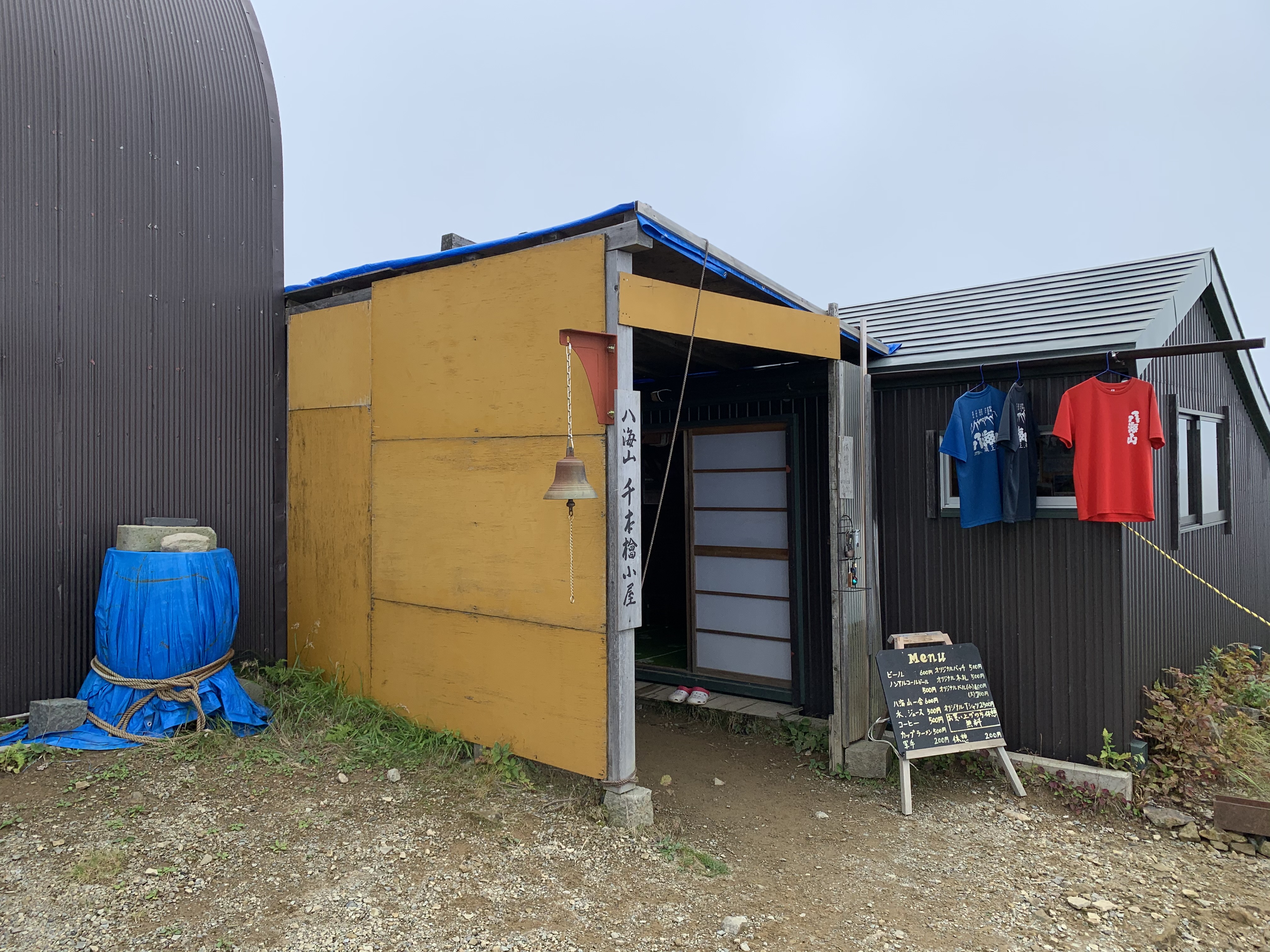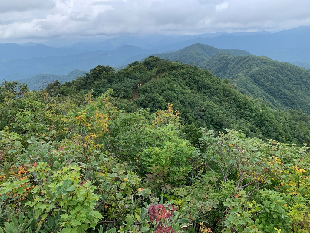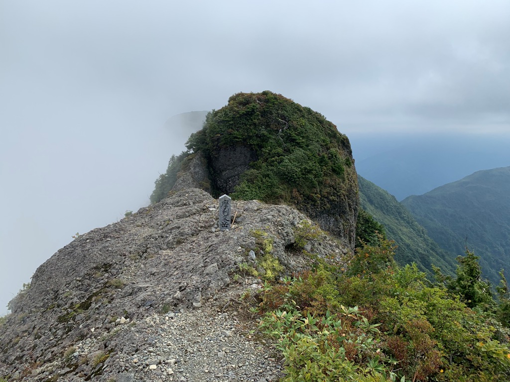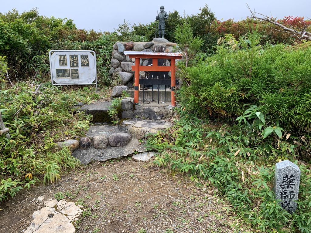 ここから視界が開けてくるので気分的に癒される。秡川の所にこれから急坂の案内がある。前方が開け、曇っているが魚沼市街が見通せる。7合目を過ぎ、鎖場を登りきると8合目の薬師岳山頂に立つ。薬師岳には鳥居と石像がある。鐘が設置され、時々その音が聞こえる。そこから千本檜小屋が、八ツ峰地蔵岳下に張り付いている。