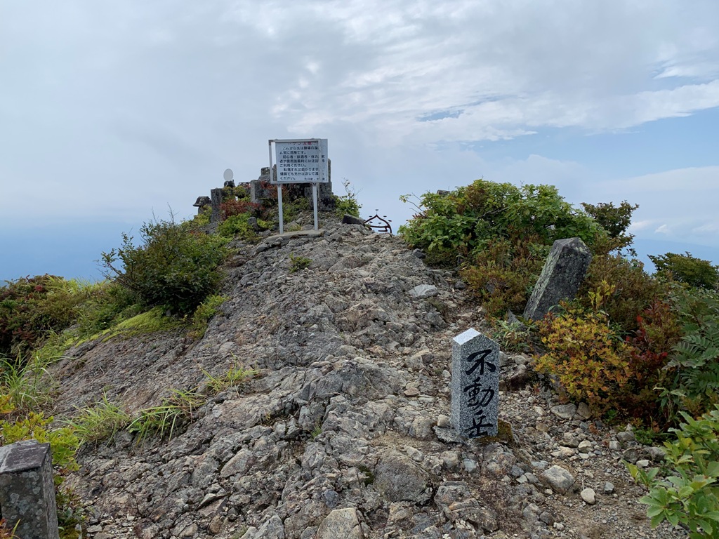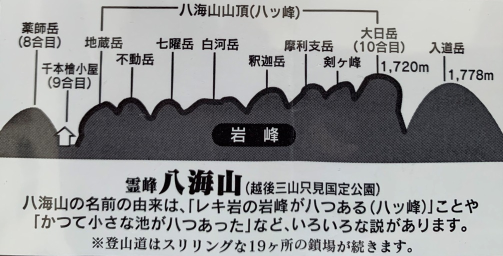八海山ロープウェ-山麓駅_376m➠ Map (9:40 5分) ⇒ 八海山ロープウェ-山頂駅__1,147m(9:45-9:51 1分) ⇒ 登山口(9:52 24分) ⇒ 4合半出会(10:16 37分) ⇒ 女人堂(10:53 28分) ⇒ 7合目(11:21 23分) ⇒ 薬師岳_1,653.8m(11:44 8分) ⇒ 4本檜小屋(11:52 19分) ⇒ 不動岳(12:11 27分) ⇒ 摩利支天岳(12:38 9分) ⇒ 大日岳_1,720m(12:47)