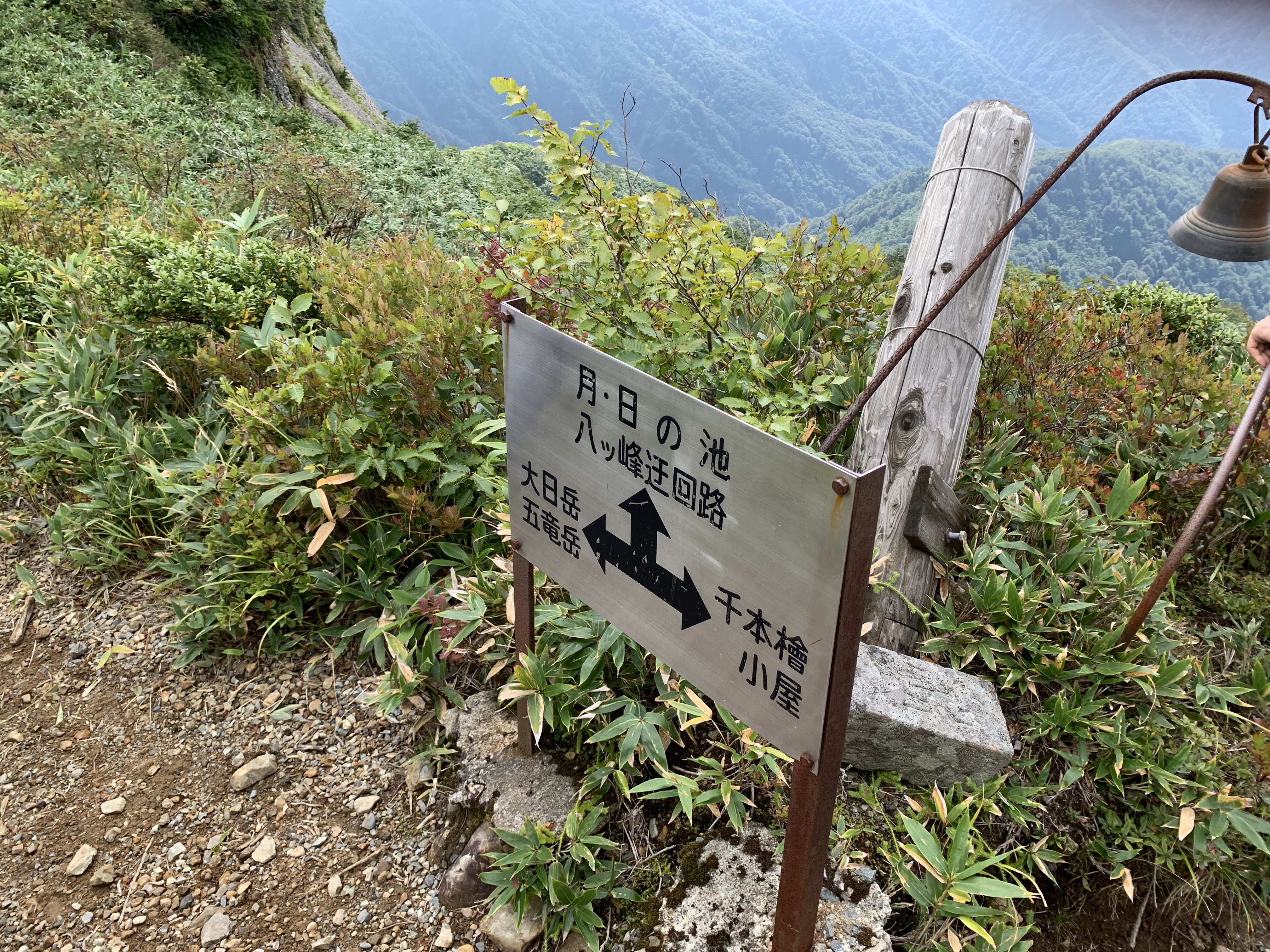 少し下り、鞍部からひと登りすると、9合目の千本檜小屋に着く。ここで小休止し、リュックを置いて地蔵岳を目指す。第1峰地蔵岳はルンゼを登り切った左にあるが、帰路に寄ることにして、右側に進み不動岳に行く。外人が風があるにもかかわらず、器用にドロンを飛ばしていた。連れ二人は、明日の登山を考えてここで引返す。数十年前に八ツ峰を縦走したが、記憶が薄れているので、私一人大日岳に向かう。直ぐに段差のある2本の鎖(7m,10m)を下る。下りきると岩稜沿いに、ゆるやかな起伏を経て第3峰七曜岳、そこから岸壁に沿って斜めに上がり第4峰白河岳(21mの横鎖)に達する。第5峰釈迦岳までに大きな落ち込み(7m)があるが、鎖に慣れたためか恐怖感はない。釈迦岳から鞍部へ下って(5m)、月・日の池八ツ峰迂回路分岐に出る。