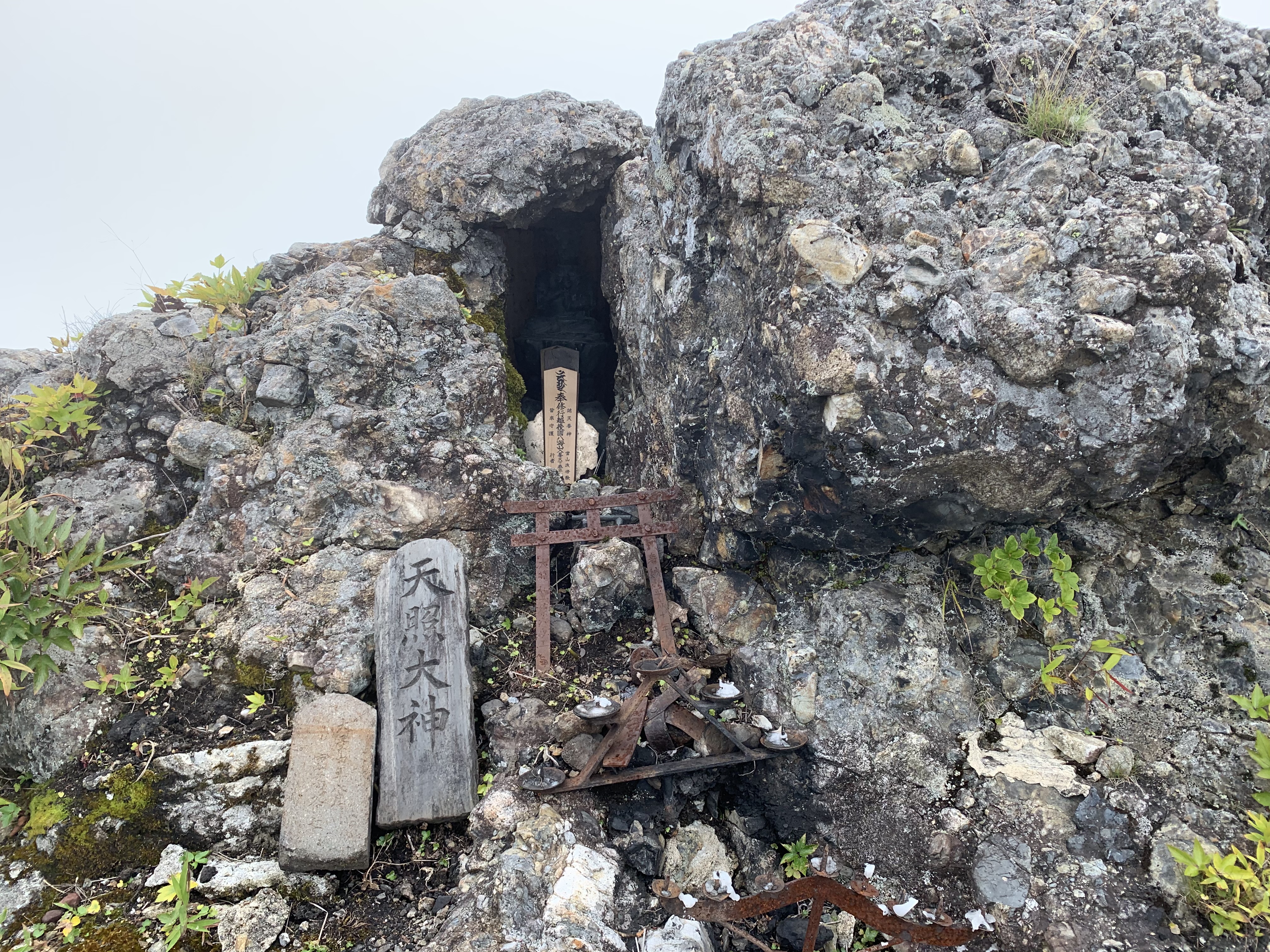 アルミ梯子(4m)と鎖(8m)を登り第6峰摩利支天へ攀じ登る。第7峰剣ヶ峰は東側を巻き、アルミ梯子(2m)の上の鎖(12m)を直登すると、第8峰大日岳の如来像が目に入る。岩の隙間に天照大神が祀られていた。はっきり言って、鎖の連続で経路をよく覚えていない。地蔵岳の段差と大日岳取りつきの梯子と直登の鎖しか印象になく、ひたすら鎖を横に這っていったように感じた。
