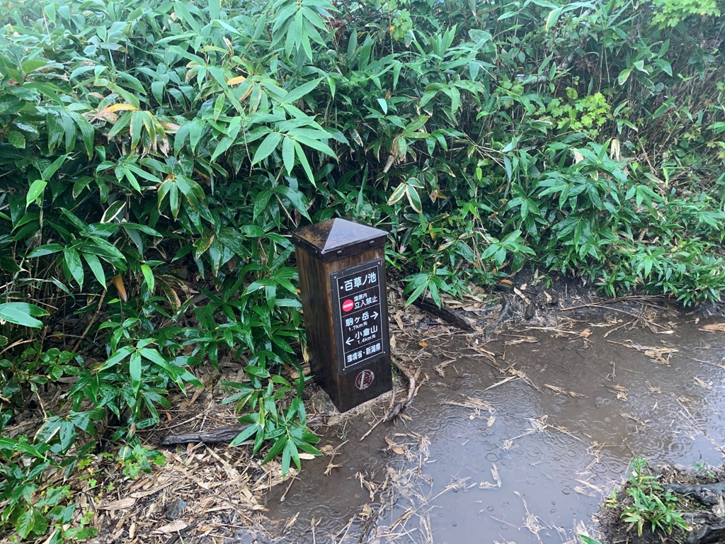 小倉山で雨対策をして、滑り易いぬかるみの登山道をひたすら前に歩を進める。百草ノ池に小倉山から44分で着く。道標に駒ヶ岳1.7km、小倉山1.4kmの表示がある。この間大勢の登山客に追越されるが、2kmを1時間ペ-スなので、決して遅くないペ-スだと思う。ガスで視界が悪く、モチベ-ションが下がる。20分程進むと、岩場が表われ非常に歩きづらい。雨は増々強くなり、手はかじかんできた。