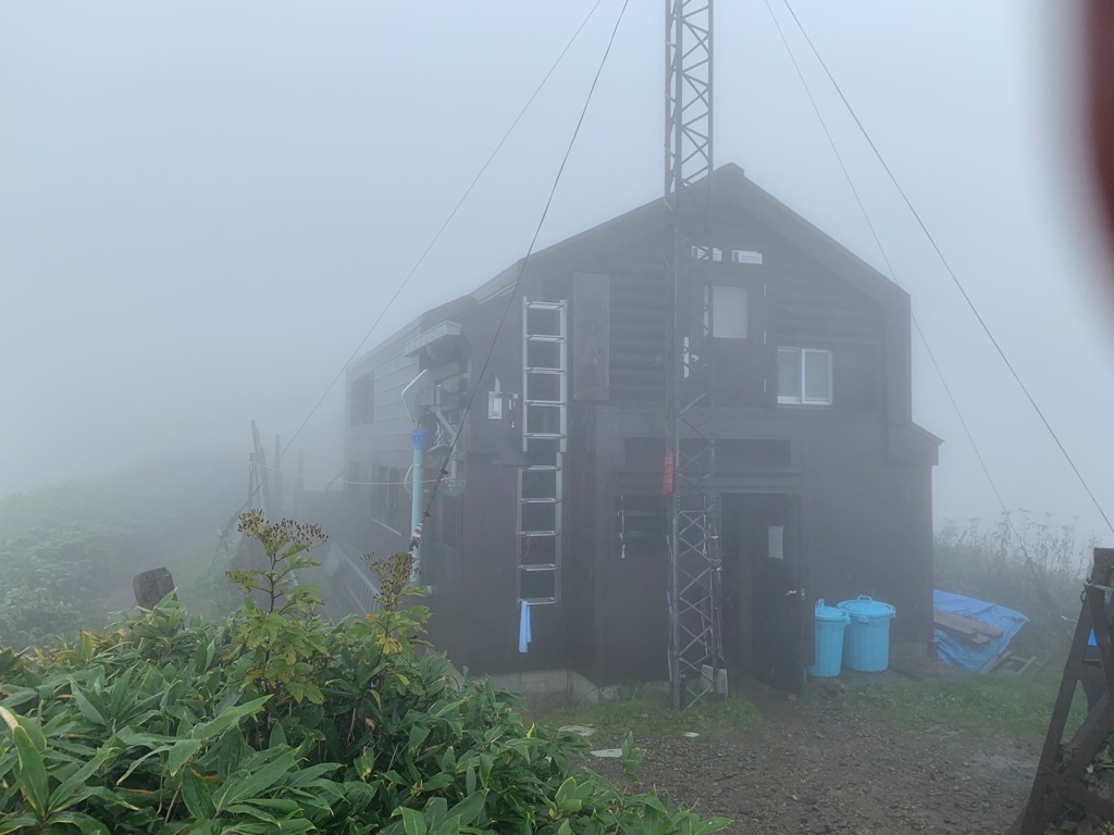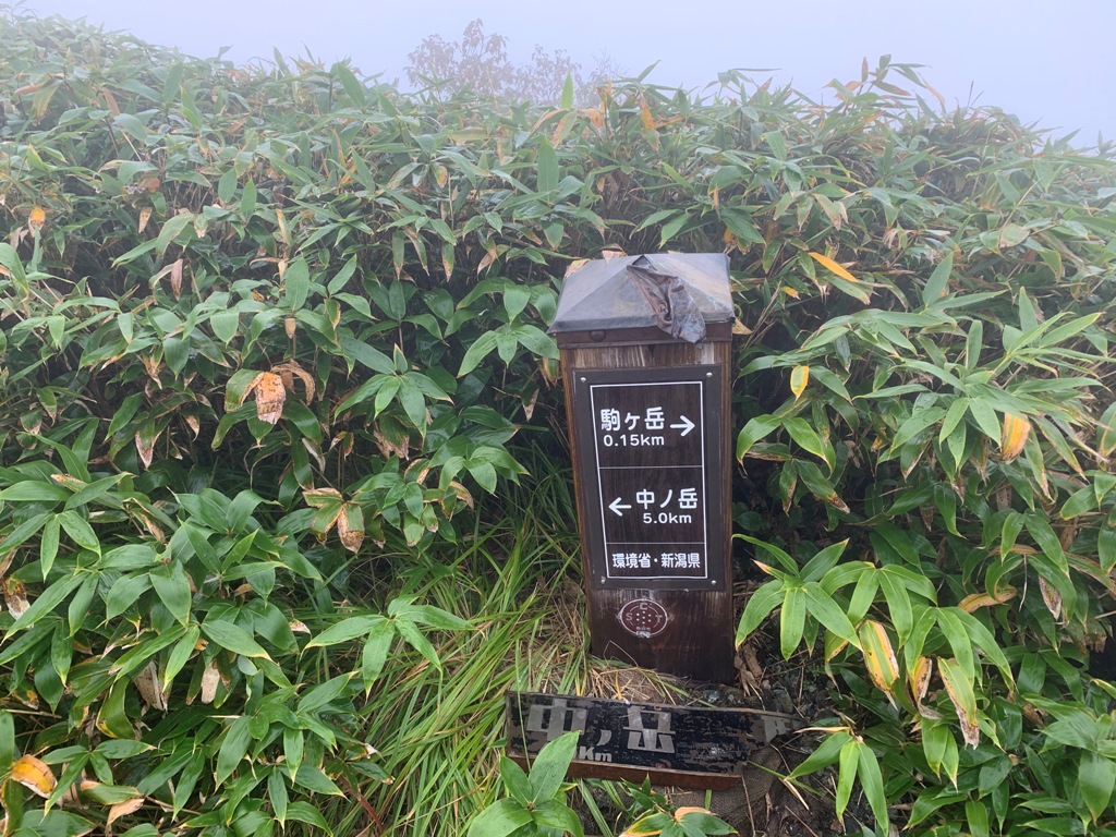 前駒からなだらかになり、最後の急な岩場を登り、9時55分に駒の小屋に辿り着く。2時間弱なのでコ-スタイムより早かったが、追越されるばかりだった。一息つくことなく、山頂に向かう。中ノ岳分岐を右に折れ、20分程で駒ヶ岳山頂に着くが、四方ガスの中だ。幸いに、雨はうそのように止む。