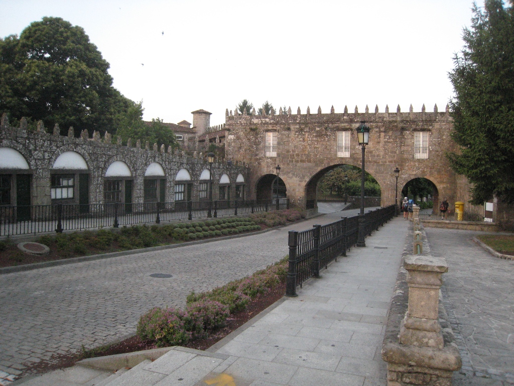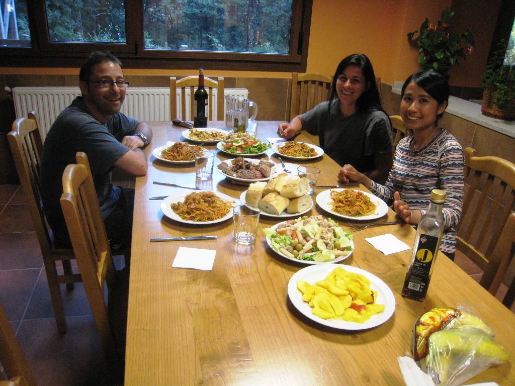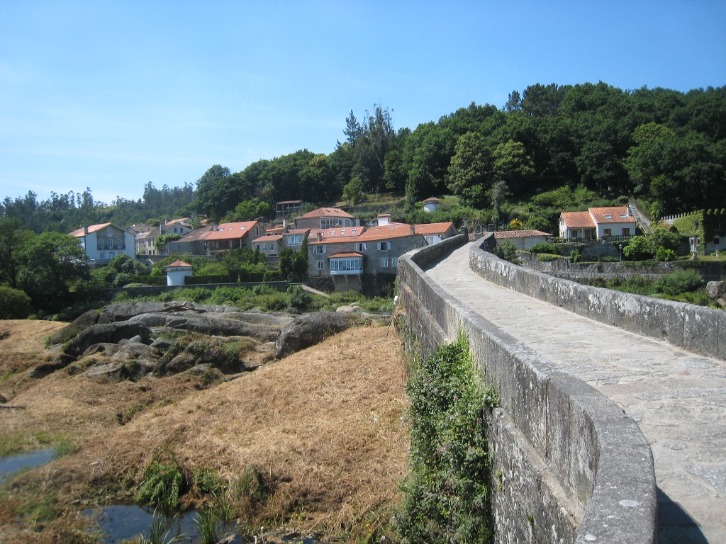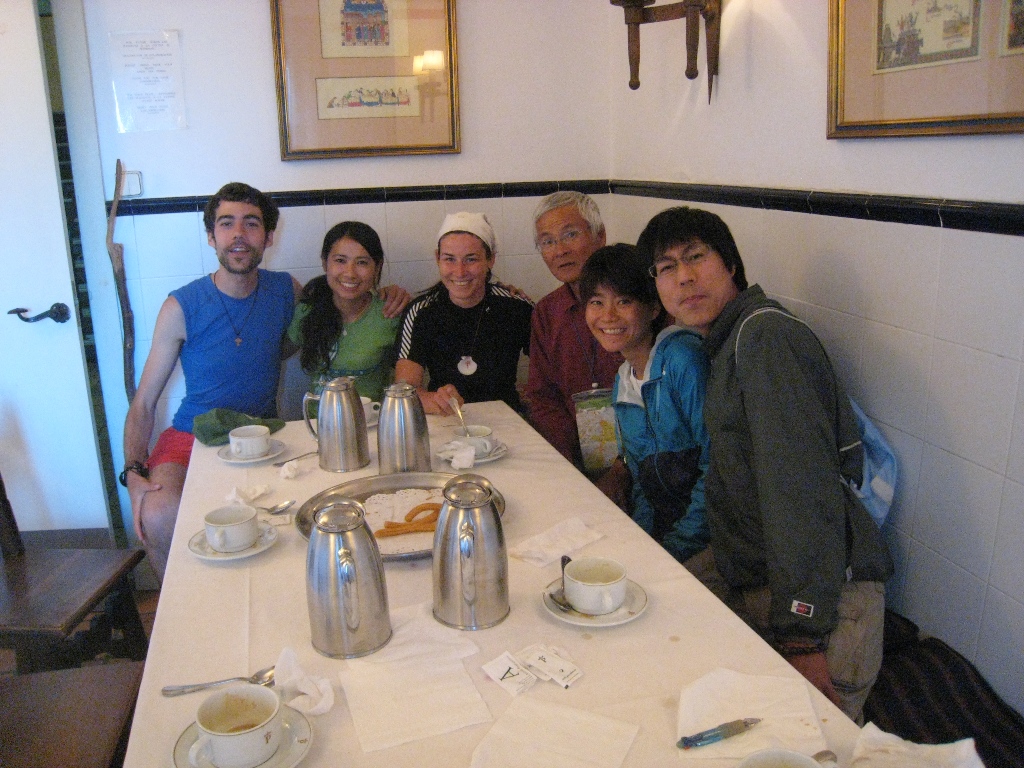 I decided to go to Fisterra for 3 days as planned.Depart Albergue at 8:30m.I see a strange Spanish cesar with whom I ate yesterday in front of a prestigious parador。I wait so that I don't meet, but since I don't move, I have no choice but to say hello.I meet a couple from Nagoya there.Parador serves breakfast to pilgrims, so the eight attendees are a treat.The bread was very delicious.Take a commemorative photo and break up with the Japanese couple there.The number of Spanish people will increase by one, and it will be a pilgrimage of four people.The departure of Santiago de Compostela is significantly delayed, at 10:30 m.This route is lined with mountain roads and feels more like a pilgrimage route.It's hot anyway.The pilgrimage signpost seems to indicate the remaining distance to Fisterra, and it was a halfway number such as 85.827 Km.At 16:15, you will pass the fine Pontemaceira (Stone bridge) over the Tambre River in Ponte maceira.Stop at the Bar near the remaining distance of 5km.Anyway, the beer is good.Depart there at 15:50.At 17:15, we arrive at the municipal Albergue San José (12€) in Negreira.The building was new and comfortable.I went to a nearby supermarket, procured ingredients, and started self catering (12 €) with 4 people from around 9 o'clock.Salad, macaroni and meat dishes were lined up, making it luxurious meal.The Spanish Sezarl played an active part here.June 29, 2010 (Tue.) Sunny