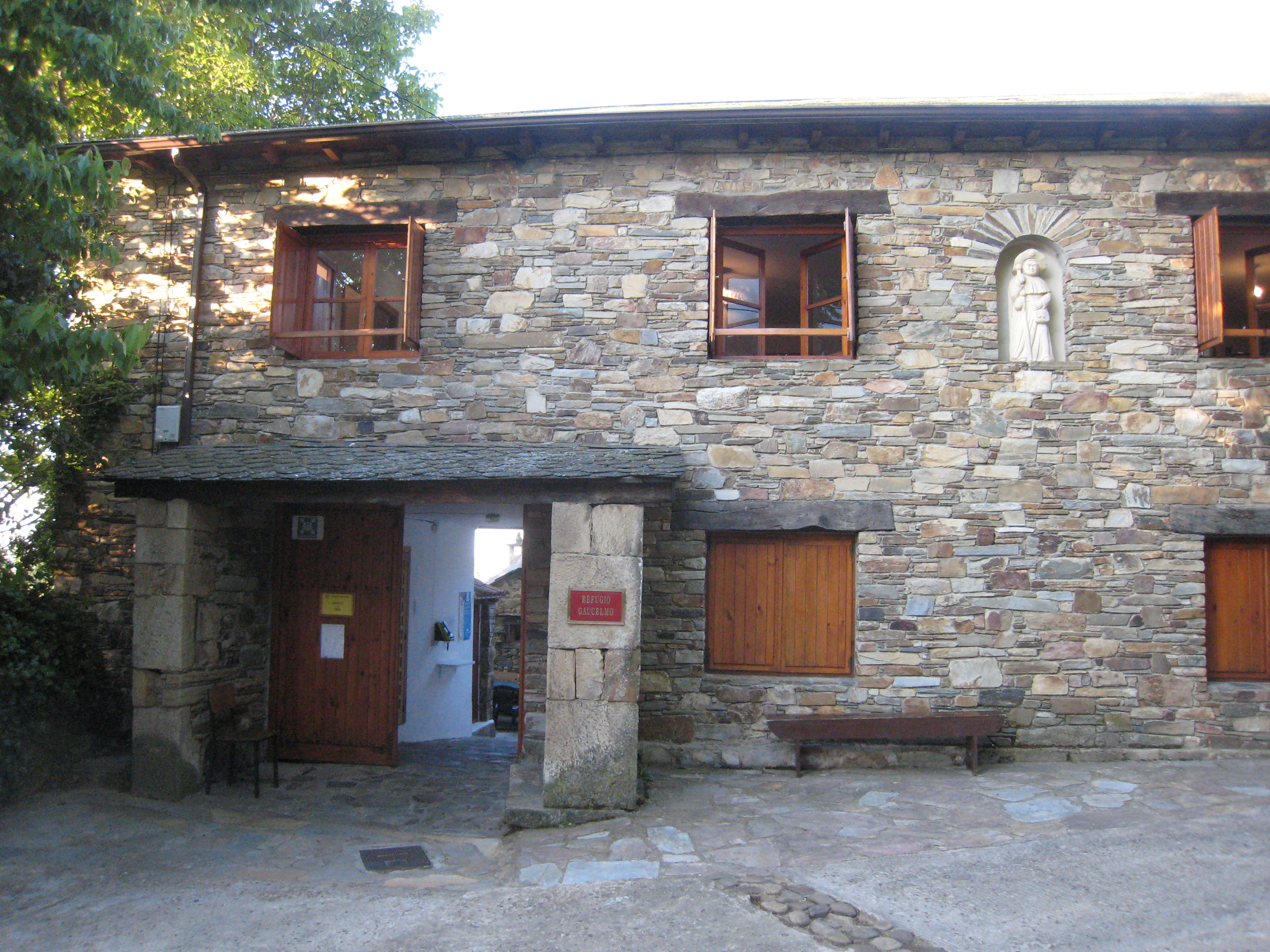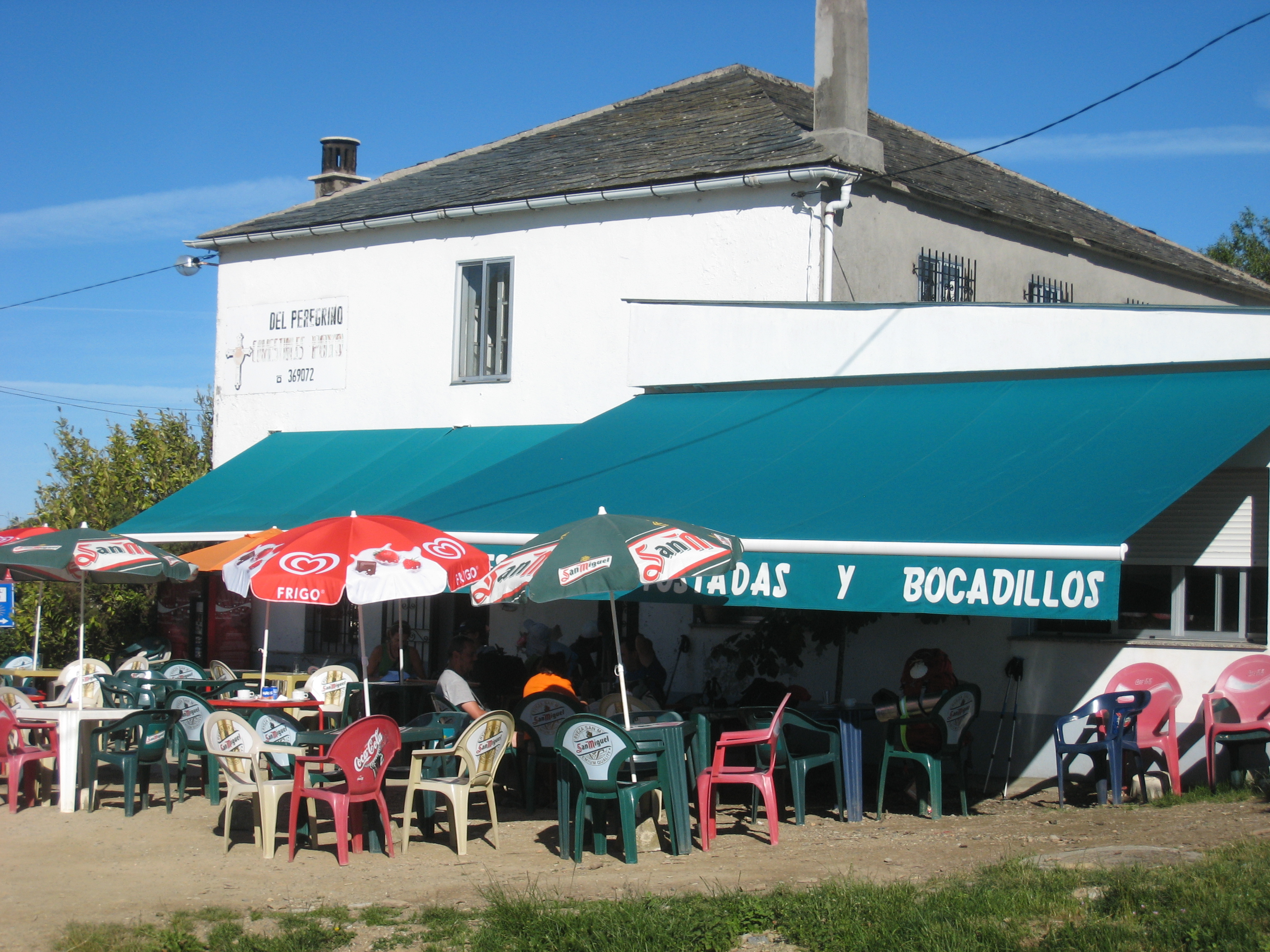 今日は長丁場で、しかも単調な巡礼路だ。Mirador da Brea(バル)付近にサンチャゴまで100Kmの落書き激しい道標があった。予定地Ferreiros(フレロス)はアルベルゲが1軒しかないので先を急ぐ。最後の登り坂では巡礼路が通行止めになっていて、迂回路であるぬかるみの急坂を登ることになった。自転車が四苦八苦して手押ししていた。パンク修理していた自転車の集団を尻目にアルベルゲに先着した。しかし、案の定満室だった。聞くと、2Km程行ったところにHostalがあるというので、気を取り直して再出発する。ところが幸いなことに100M程下ったところに、Restaurante O Mirallos(Bar兼アルベルゲ)があり安堵した。17時30分を過ぎていた。寄付ということで5€を払い、荷を下す。夕食(10€)はそこで摂った。夜、付近の住人が集まり、焚火を囲んで祭りらしきもので賑わっていた。Iglesia de Santa María de Ferreiros(教会)が火の灯りと月の明りで照らしだされていた。結局このアルベルゲも満室近くになった。シャワーは水しか出ず、騒がしい夜となり、5€は払い過ぎた感がする。2010年6月24日(木) 晴