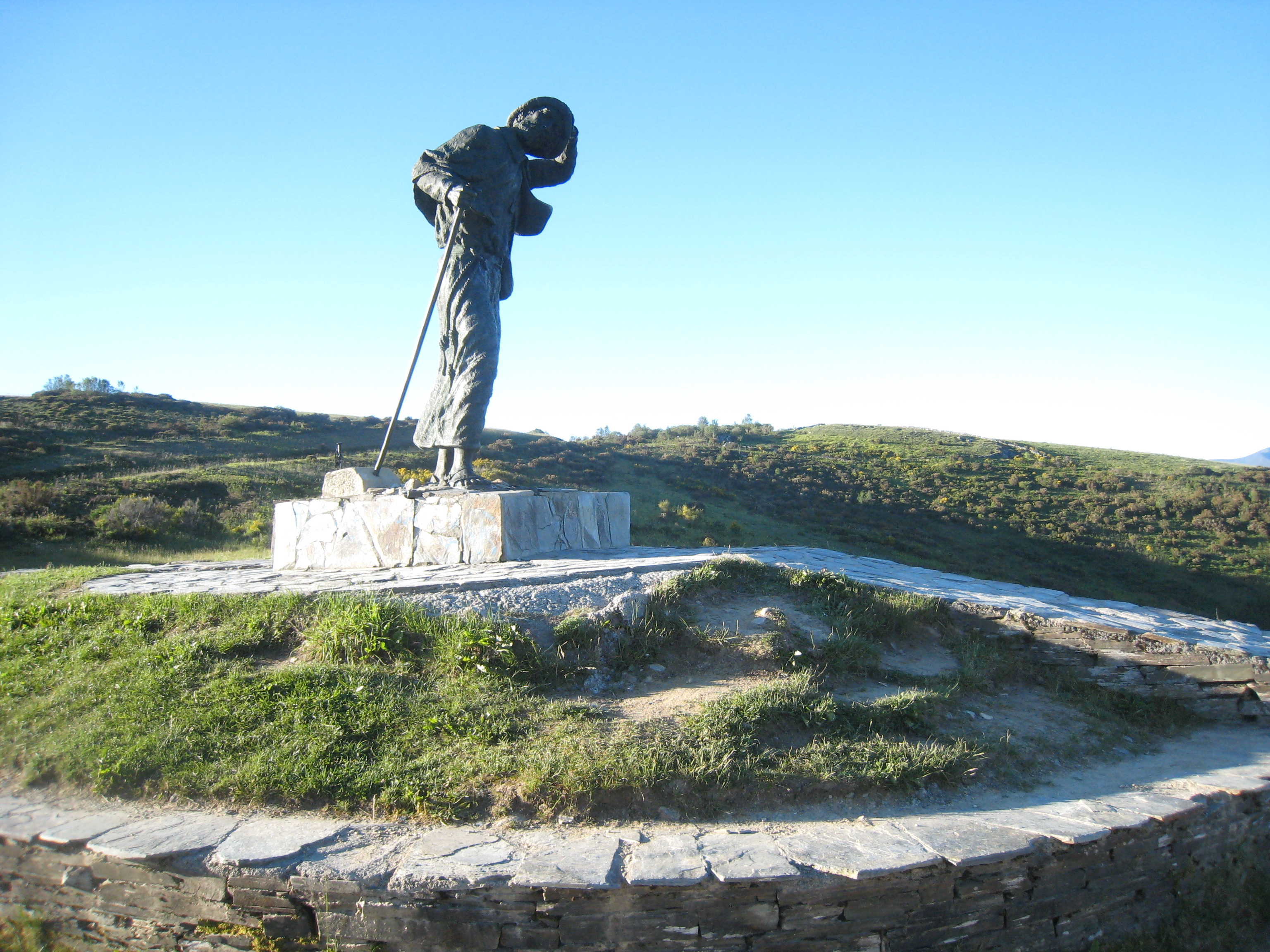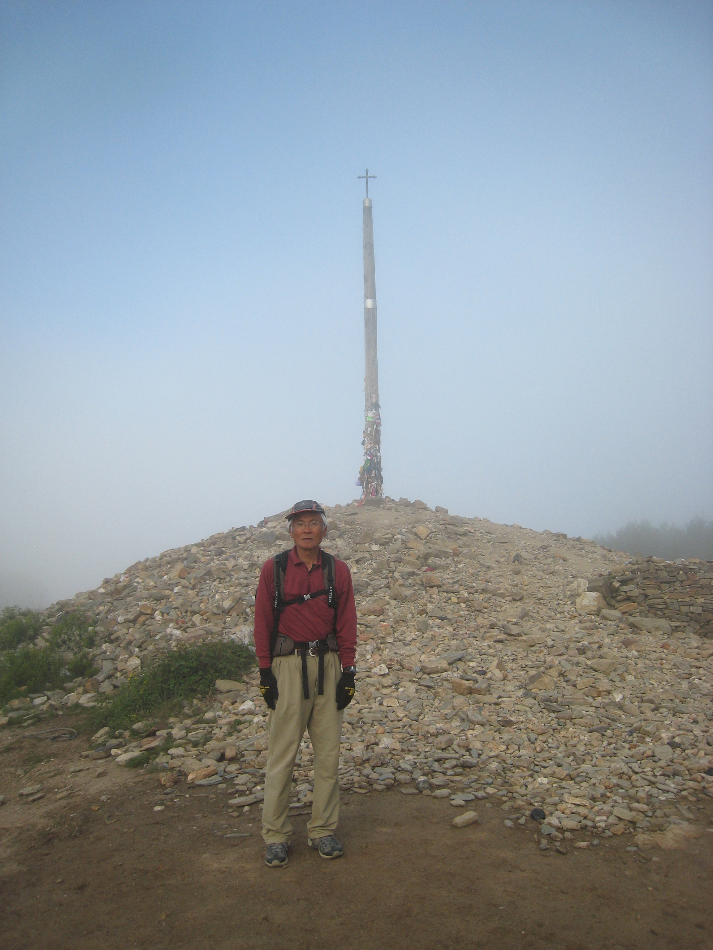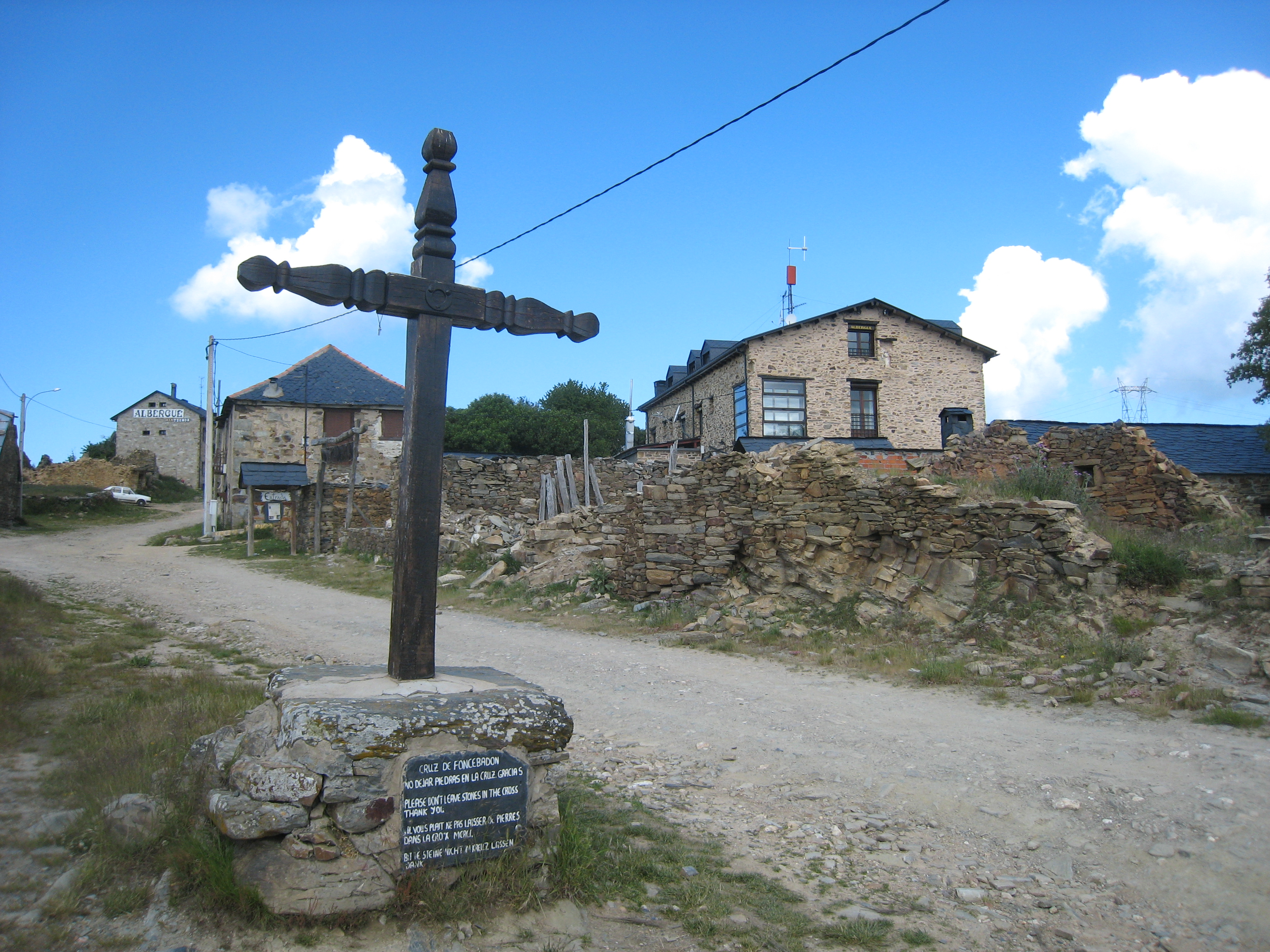 霧の中を7時30分に出発する。遠くの山並みに風車が数多く見渡せた。今日は二人に付かず離れずの山越えの歩きだった。8時10分頃、イラゴ山頂(1,504M)のCruz de Ferro「掟の十字架」に着く。十字架が霧の中で幻想的に霞んで浮かんでいる。ペルーのおばさんに写真を撮ってもらう。その先にサンチャゴまで222Kmと表示した、非常に目立つ土産物店があった。ここからMolinaseca(モリナセカ)まで、標高差900M強の山下りだ。
