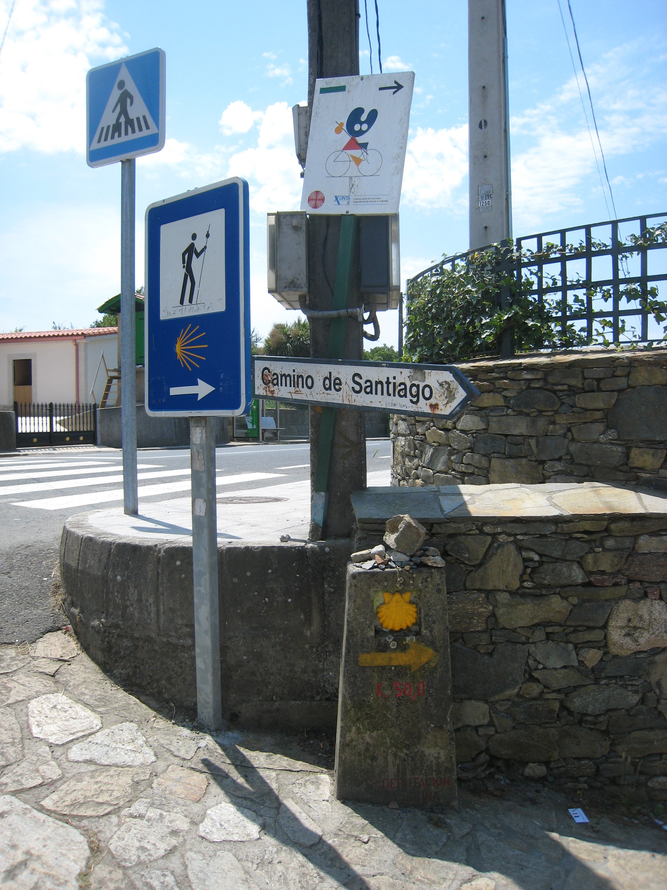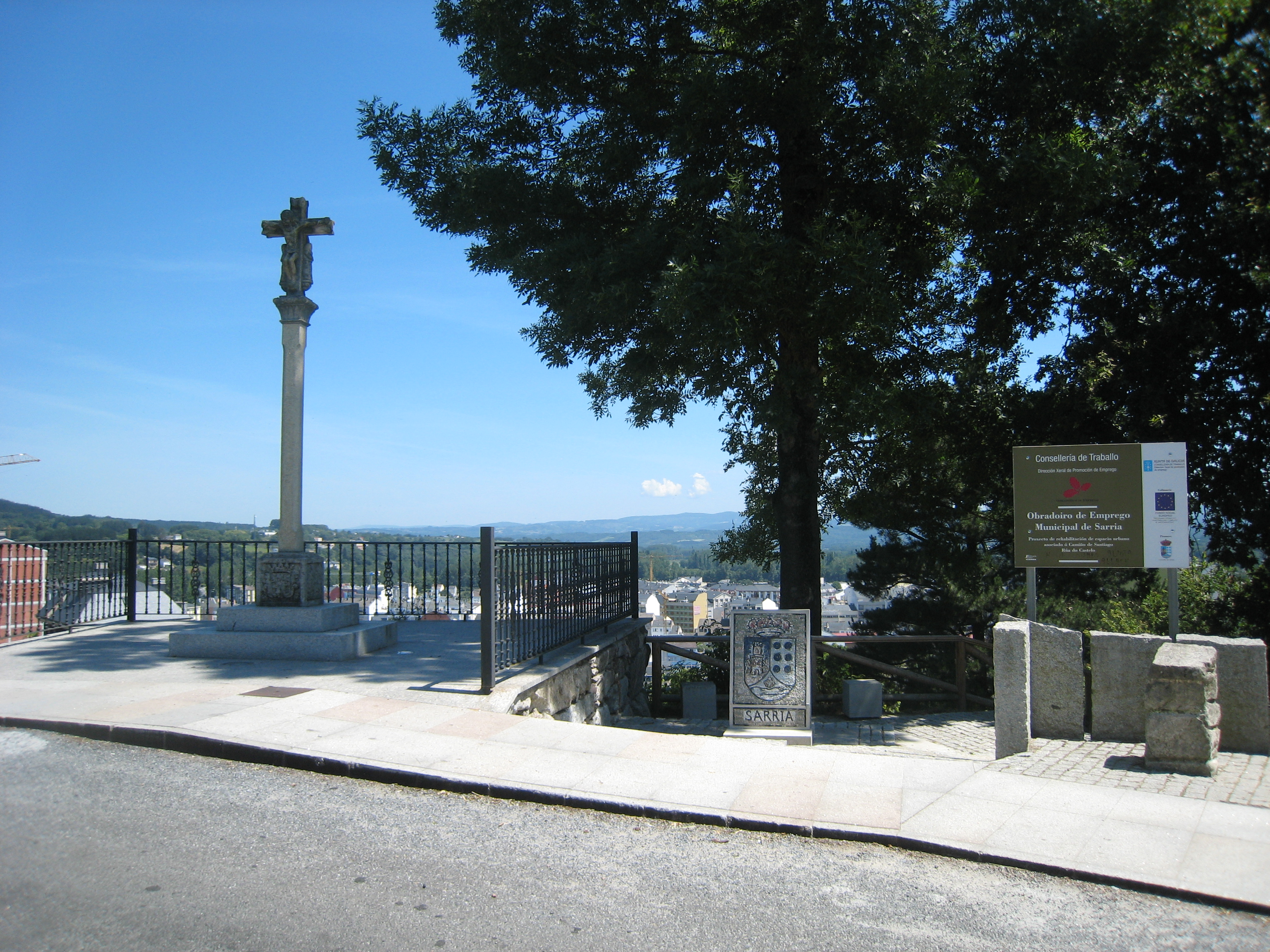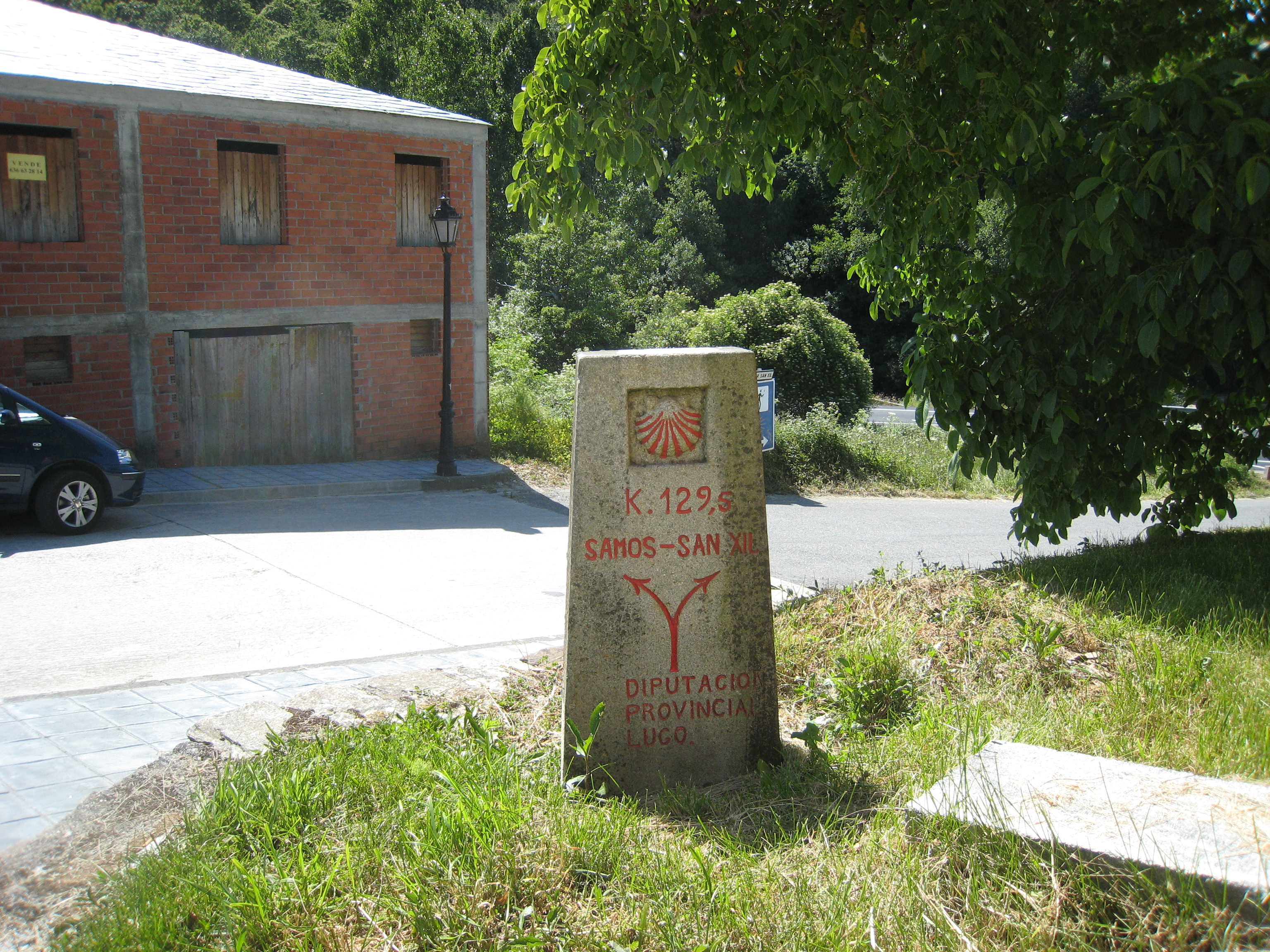 7時40分に出発する。昨日下見した分岐点の道標に着く。今回は2ル-トの内、楽な右方向のSan(サン) Xil(クスイル)経由とした。もう一方のコースには、有名なSamos(サモス)修道院がある。少しアップダウンのある山道を、少しの休憩のみで11時50分にSarria(サリア)に着く。さっそく町入口付近のBarで昼食を摂る。Sarria(サリア)からスタートするとSantiago(サンチャゴ)から108Kmなので、歩いて巡礼証明書がもらえる最短区間である。そのこともあって、巡礼者が急に増えた気がする。Concello de Sarria(市役所)からSarria Schriftzug / Sarria Nametagの角を曲りSarria Peregrino(観光案内所)に行く。そこには十字架のモニュメントがあり眺めが良い。そこからConvento da Mercé(教会)に寄り、Ponte da Áspera(石橋)を渡り郊外に出る。