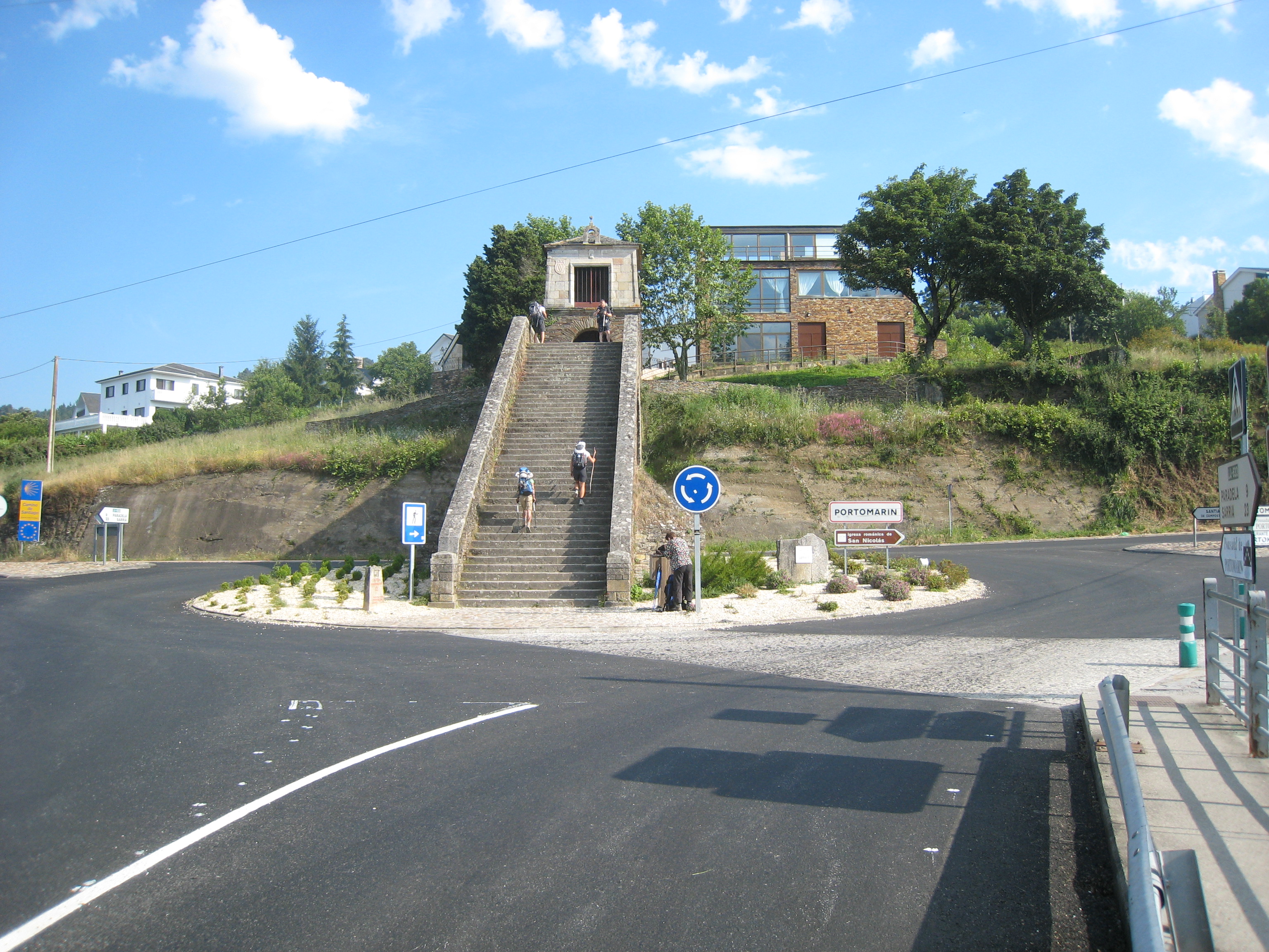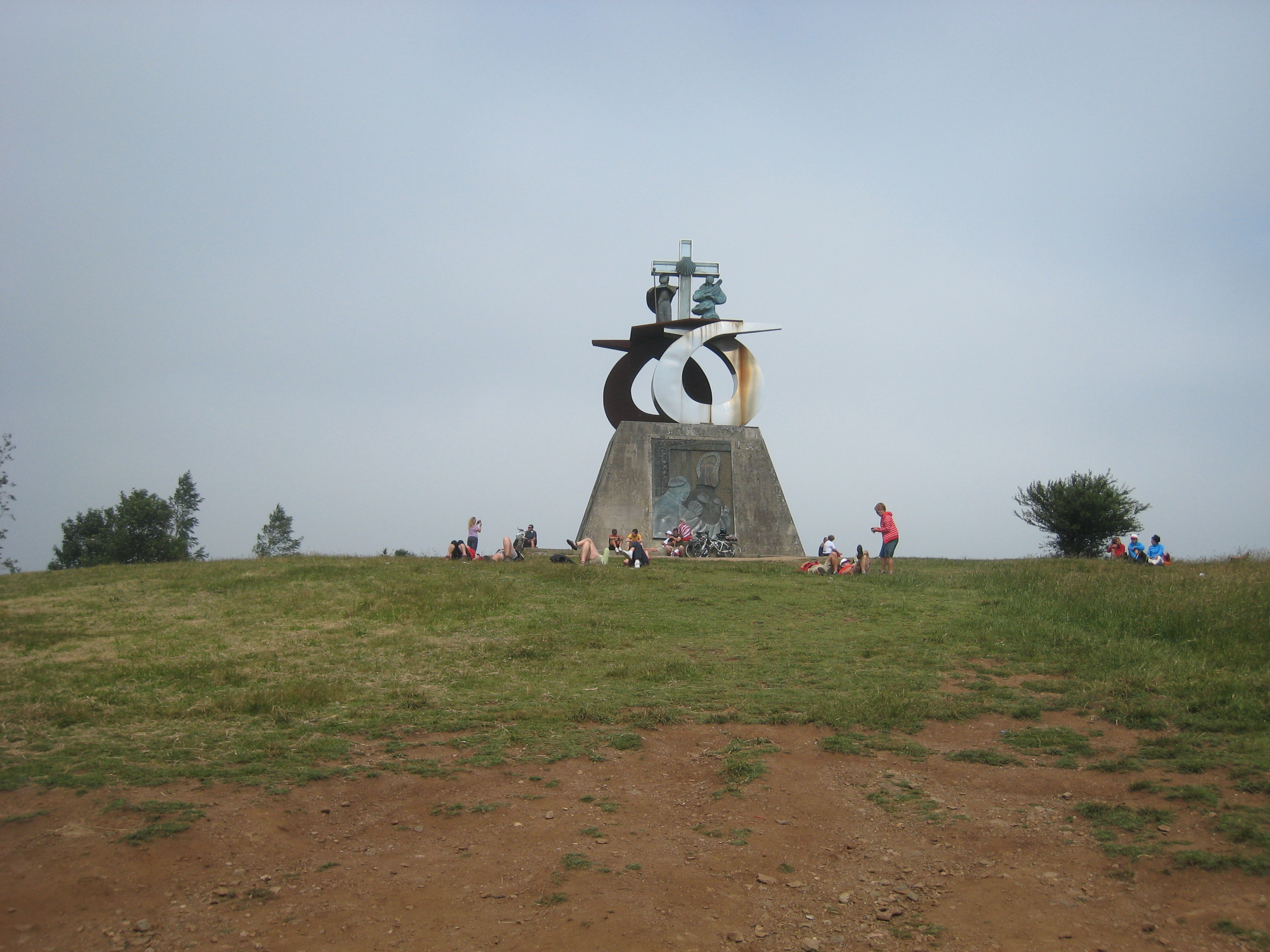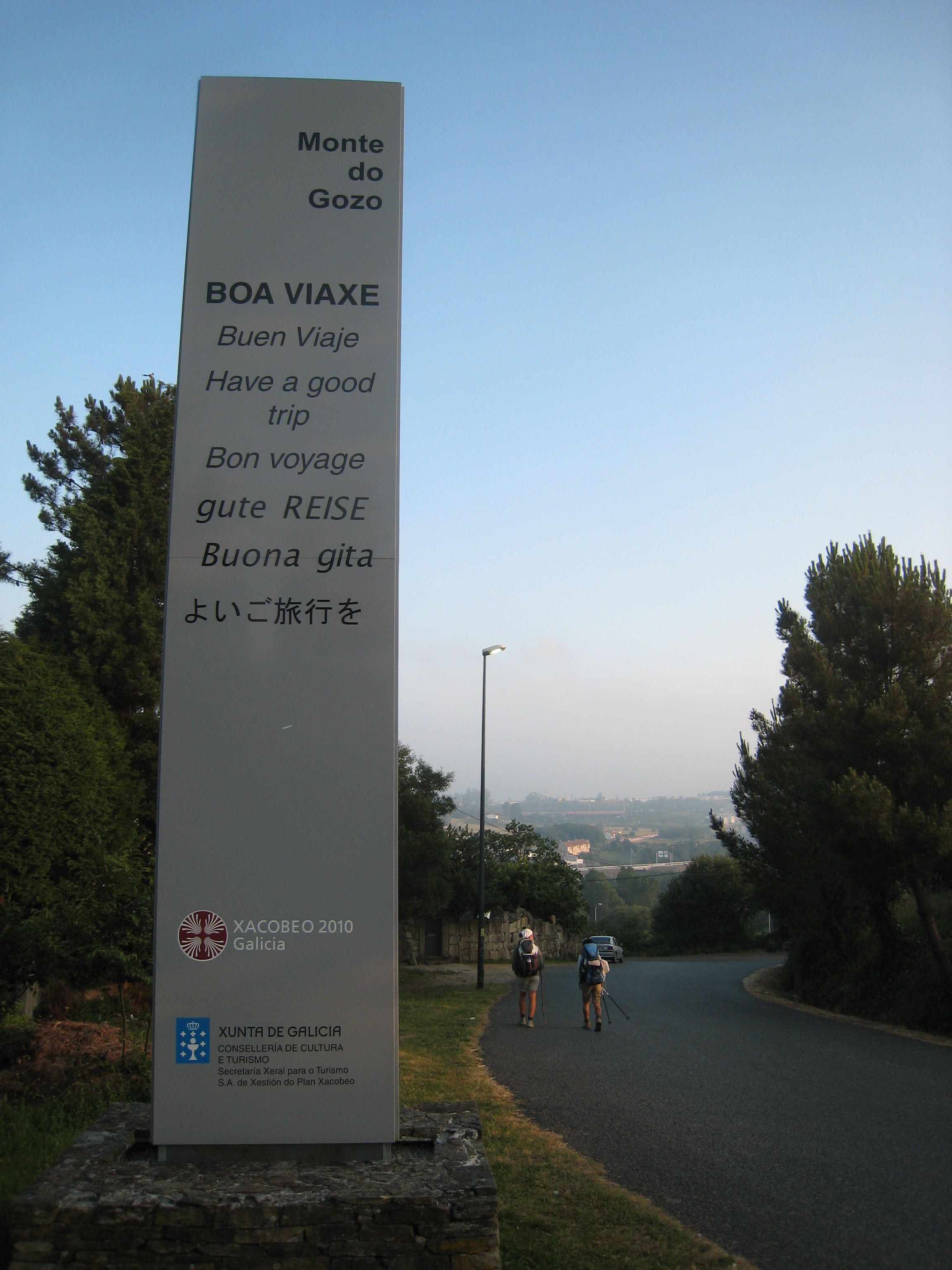 アルベルゲで朝食(3€)を済ませ、Arzua(アルスーア)を7時20分に出発する。今日も多少のアップダウンのある畑、林間と道路上の単調な巡礼路だ。O(オ) Pedrouzo(ペドローソ)で昼食を済ます。ここからサンチャゴまで20Km程だ。国道A-54にぶつかるAmarelle(アコルーニャ)付近に、ホタテ貝をぶら下げた杖のデザインBorne d'entrée à santiago-Camino Frances(石碑)があり写真を撮る。今夜の宿Labacolla(ラバコジャ)に15時に着いた。Iglesia de Lavacolla(教会)の前近くにHostalが集中しており、すごい賑わいだ。Hostalに泊まろうと思っていたら、居合わせた人が交渉してくれ、空部屋があるといわれたが、今夜は祭りのためやかましいということだった。そこで、友人で巡礼先輩のYさんが泊まったHotelに行くことにする。巡礼路からそれて道路をしばらく行き、右に入ったところに小奇麗なPazo Xanxordo(Hotel)はあったが、そこも満室だった。親切なオーナがMonte(モンテ) do(ド) Gozo(コソ)のAlbergue municipale(アルベルゲ)に空があることを確認してもらい、非常に疲れていたが道路を歩くと3Km程ということなのでそこに行くことにした。巡礼路に合流して少し行ったところに、「歓びの丘」にMonumento do Monte do Gozo(記念碑)があった。眼下に今までに見た中で最大級のアルベルゲ群が見えた。そこでフランス人の3人組みと、涼子さんに再会する。19時過ぎに近くのレストランで夕食(7€)を済ます。2010年6月27日(日) 曇