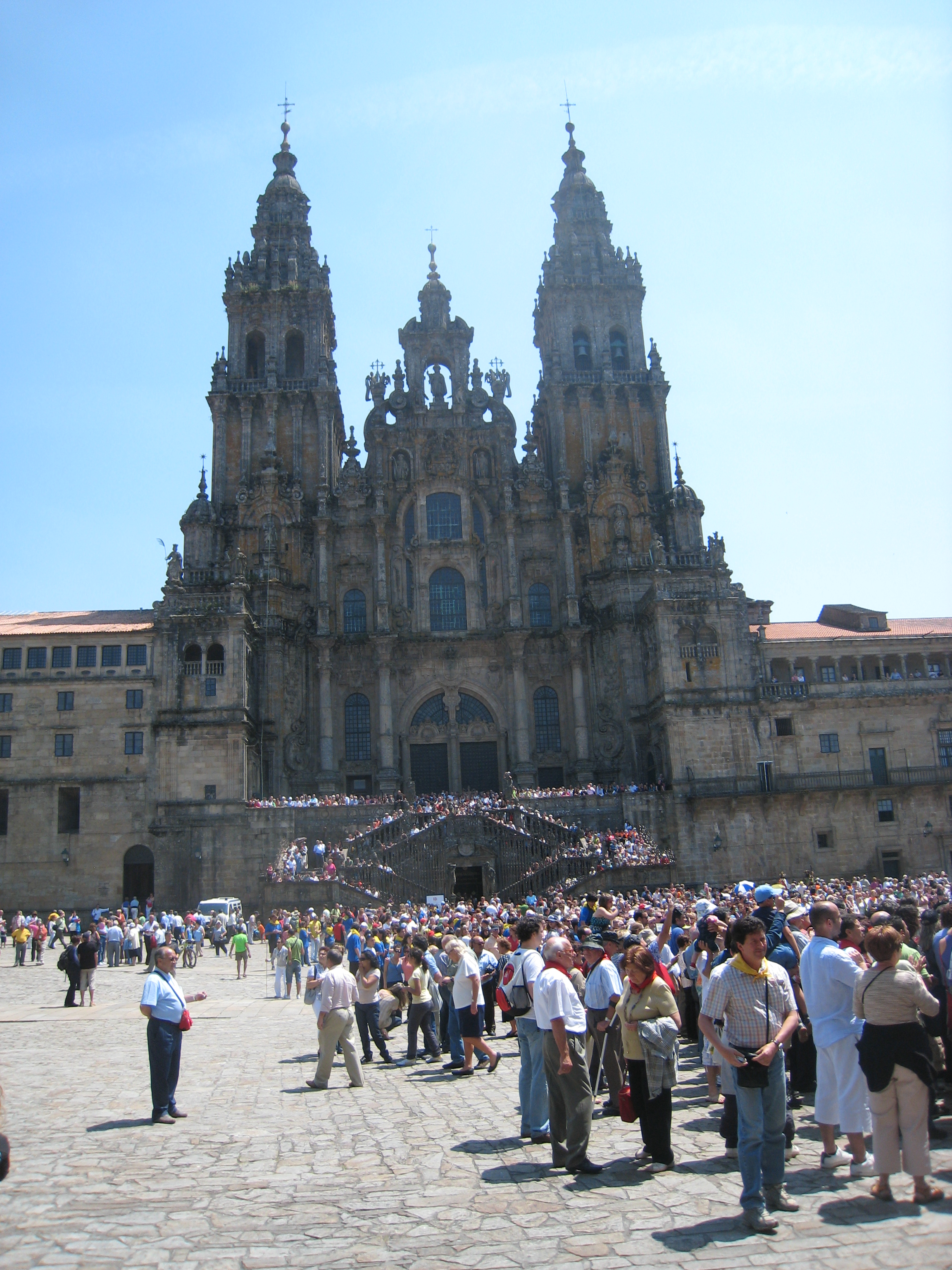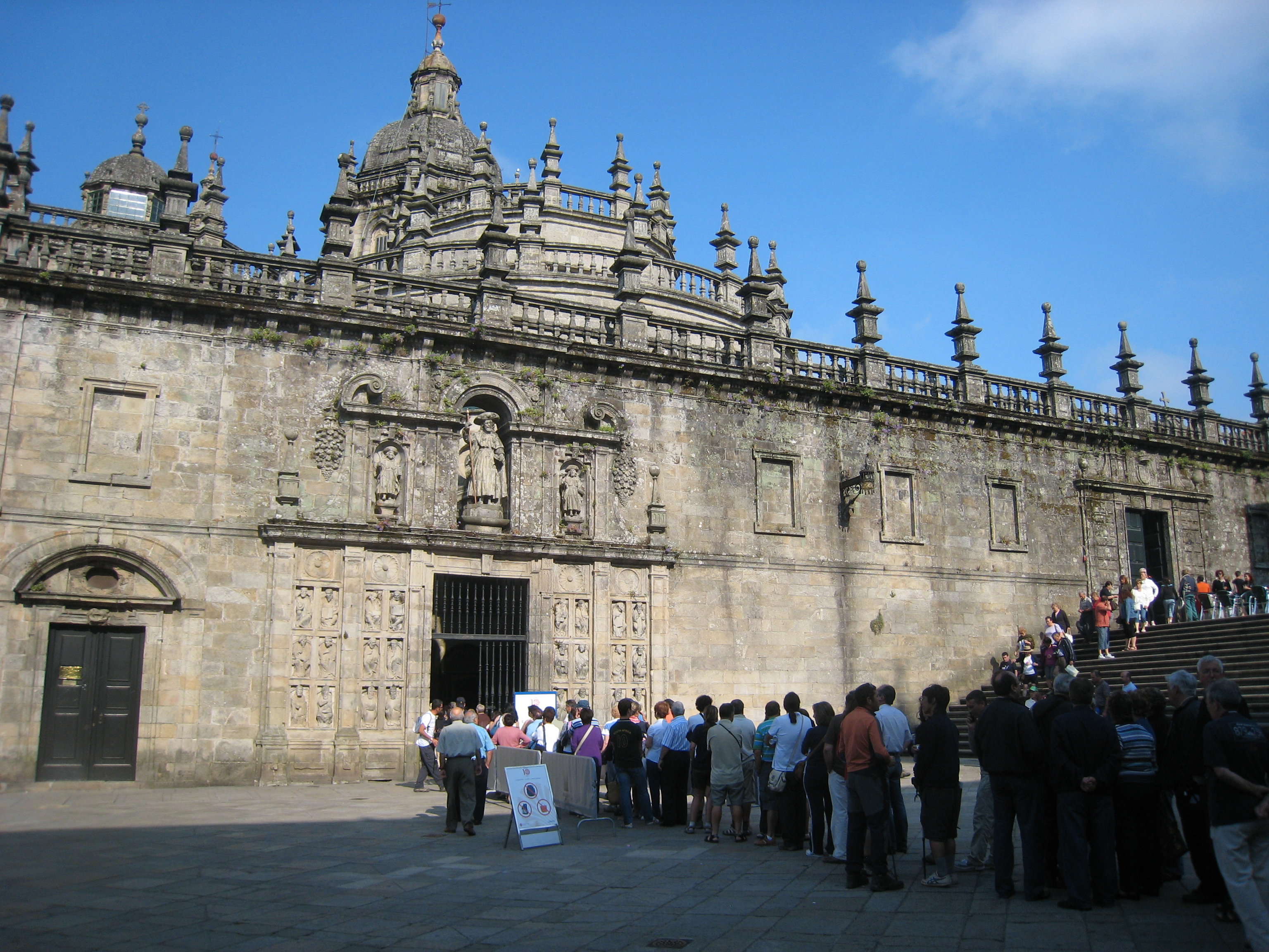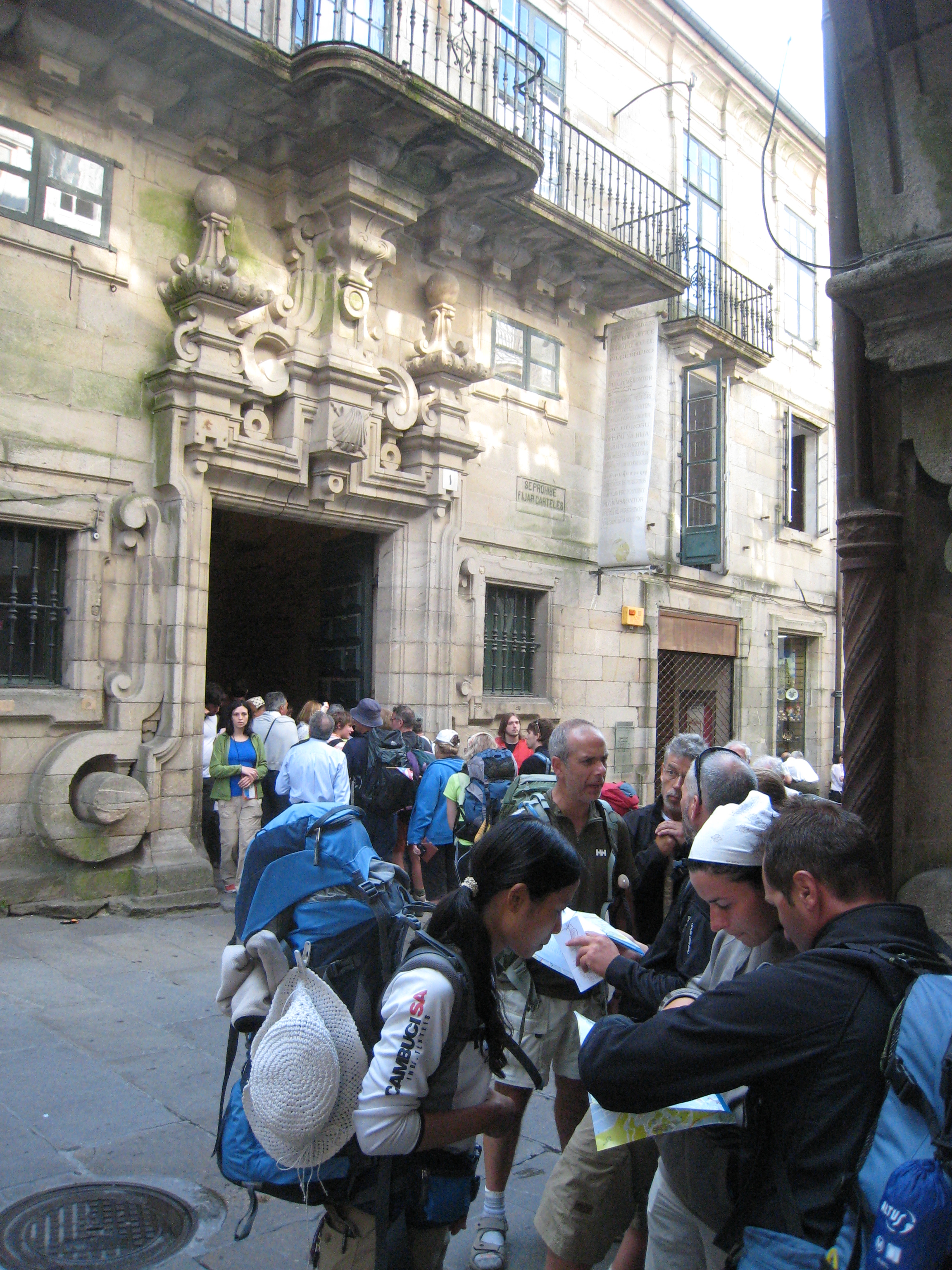 アルベルゲを7時30分に出発する。少し肌寒い中を、アルベルゲの建物群の中を下って行く。アルベルゲの入口付近の自動販売所で簡単な朝食を摂る。「よいご旅行を」の縦看板を左に見て坂道を下り、市街地を1時間程歩くと、眼下にカテドナルドの尖塔が見えた。さらにしばらく下り、アニマス礼拝堂横を抜けるとCatedral de Santiago de Compostela(大聖堂)前のPraza do Obradoiro(オブラドイロ広場)に8時50分に着く。巡礼者はSantiago(サンチャゴ) de(デ) Compostela(コンポステーラ)到着日を日曜日に合わせるが、まさにこの日が日曜日である。広場は観光客と相まって、大変な人だかりである。特に、今年は6月25日の聖ヤコブの日が日曜日に当たる年で、聖ヤコブ大祭の年にあたる(6年、5年、6年、11年の周期)。Praza da Quintana(キンタ-ナ広場)側にある開かずの扉「聖なる門」が年間を通して開かれる。次に開かれるのは11年後の2021年である。巡礼証明証書をもらうために、長い行列に加わった。入り口には巡礼の友とした杖が沢山積み上げられていた。機械的ではあったが、10時頃待望の巡礼証明書の発行を受けた。