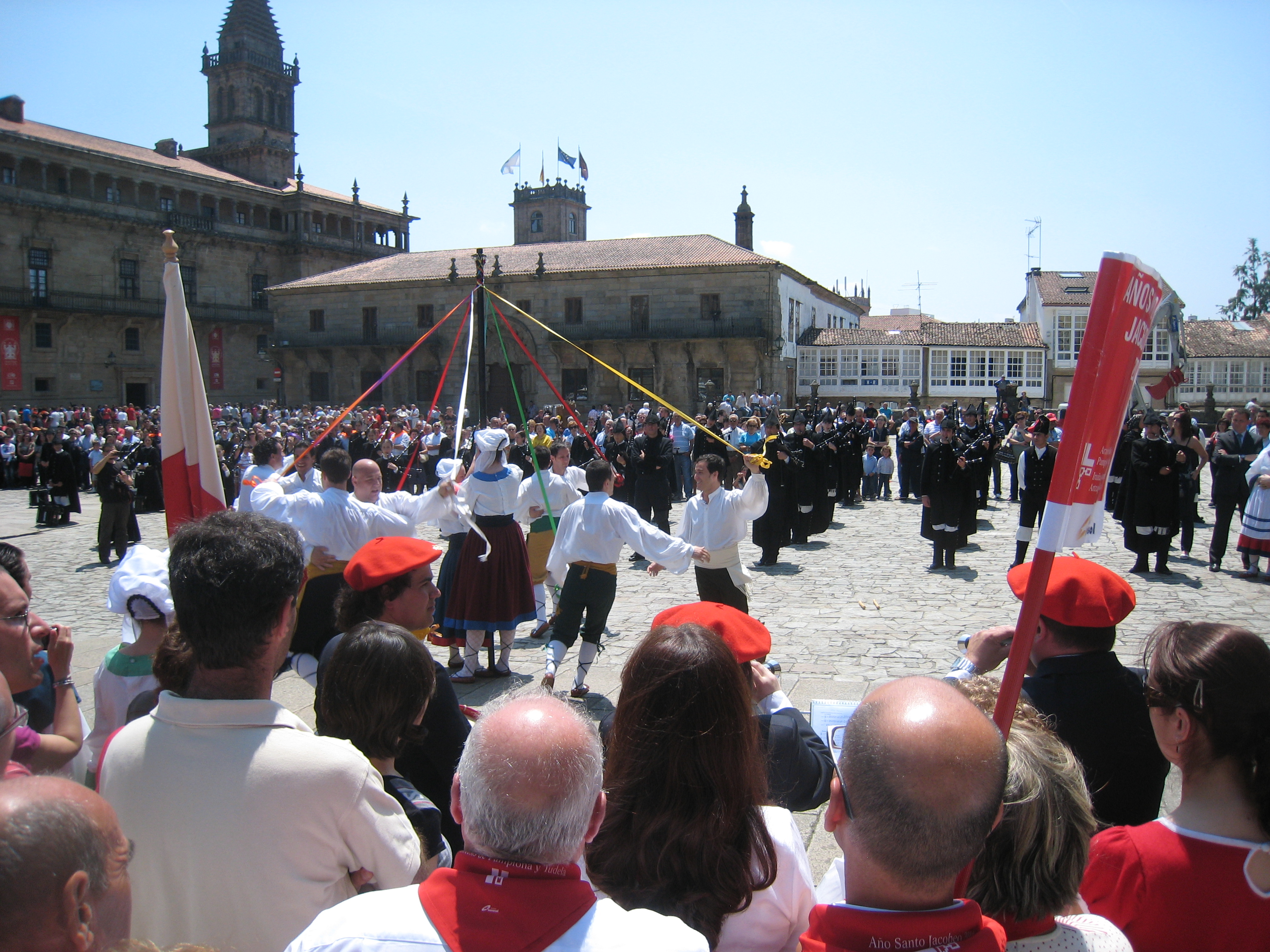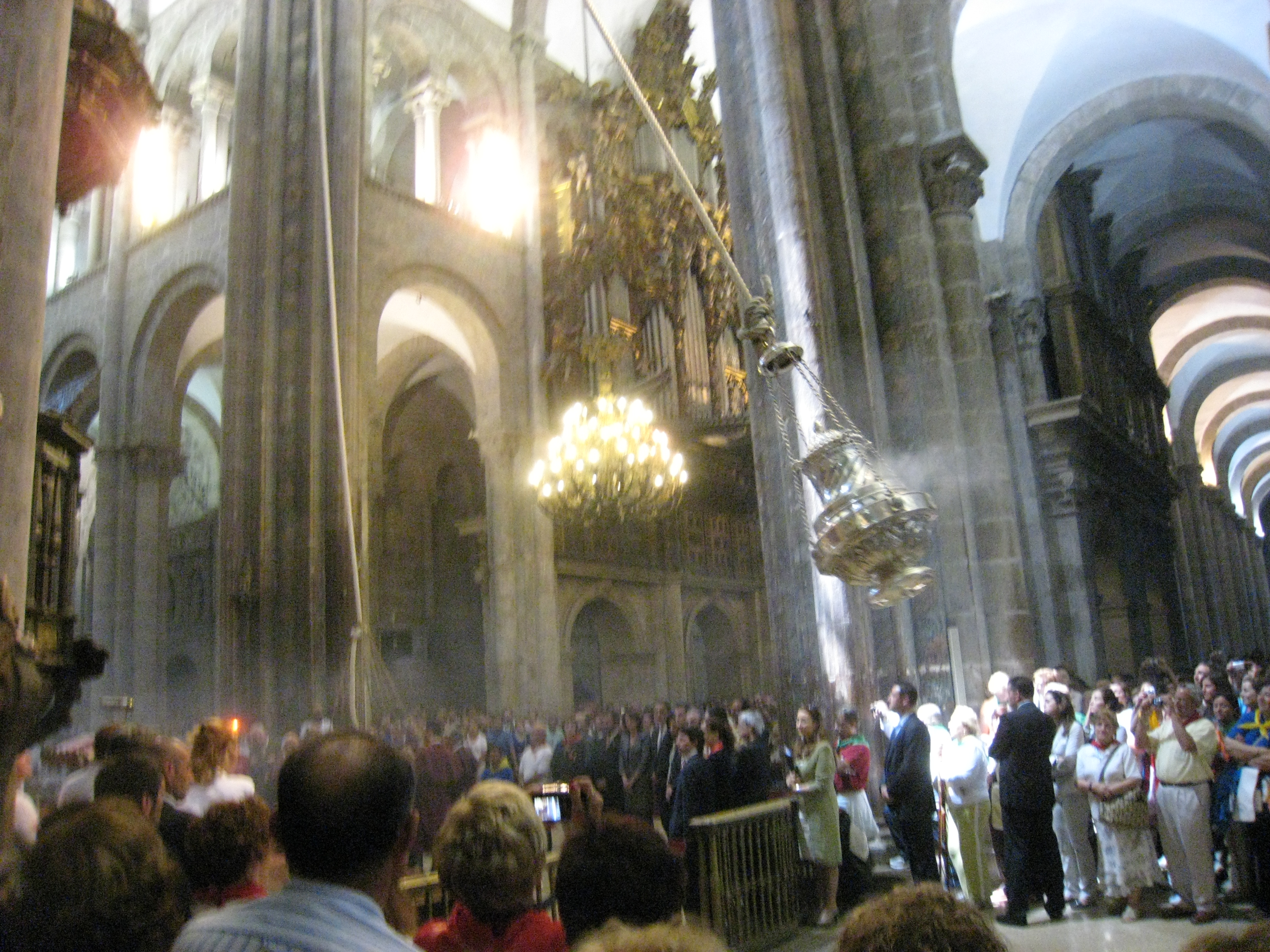 ミサが始まるまで、行列が出来ていた「聖なる門」に入らず、Arcebispado Santiago de Compostela(教会)前の行列も無視して時間を潰す。オブラドイロ広場でイベントが始まろうとしていた。11時頃、正面入口のファサードをくぐり、栄光の門を抜け、大聖堂の中へ入っていった。ミサは12時から始まり、ボタフメイロ(吊香炉)でクライマックスに達し、13時30分に終了した。