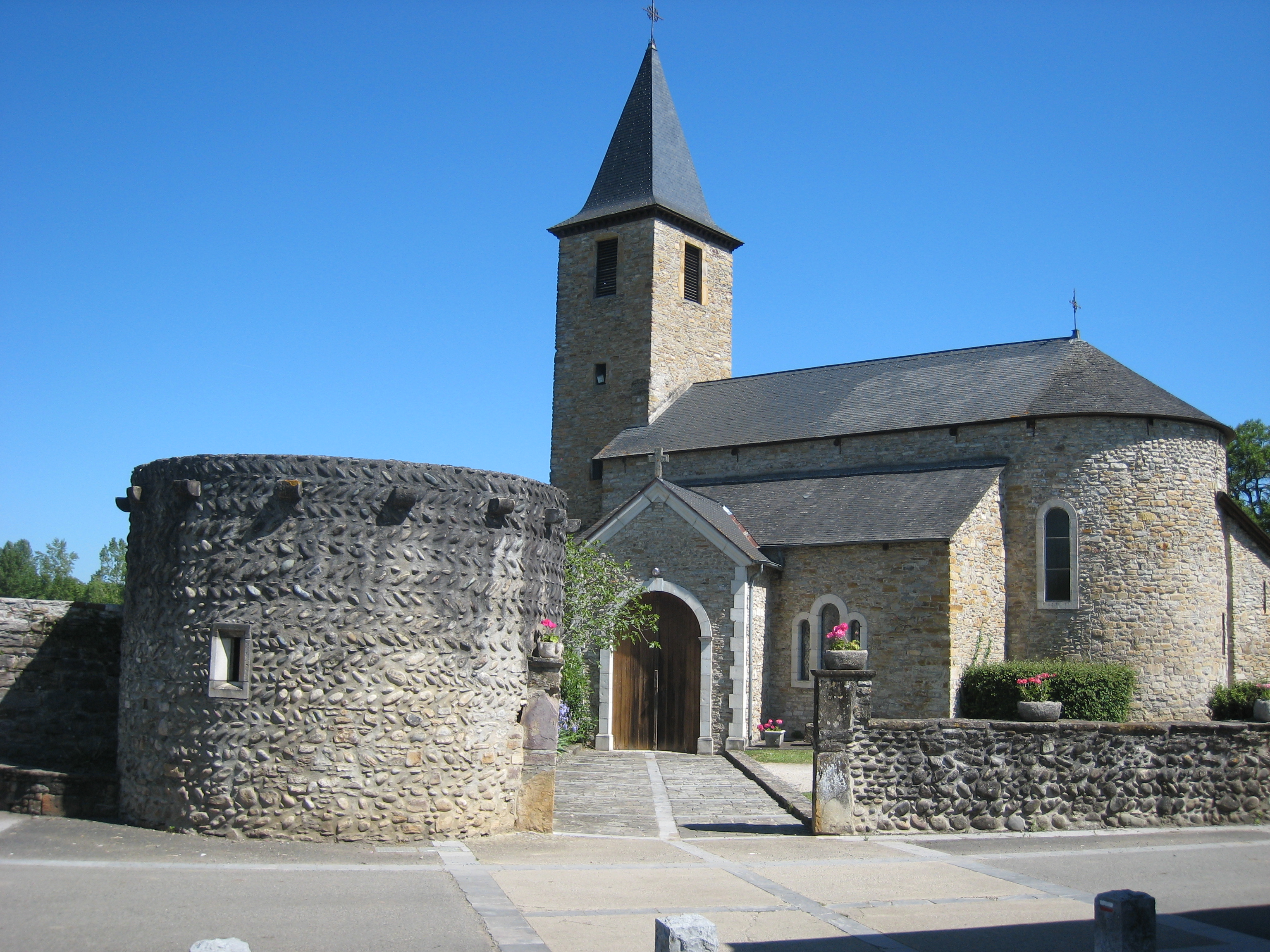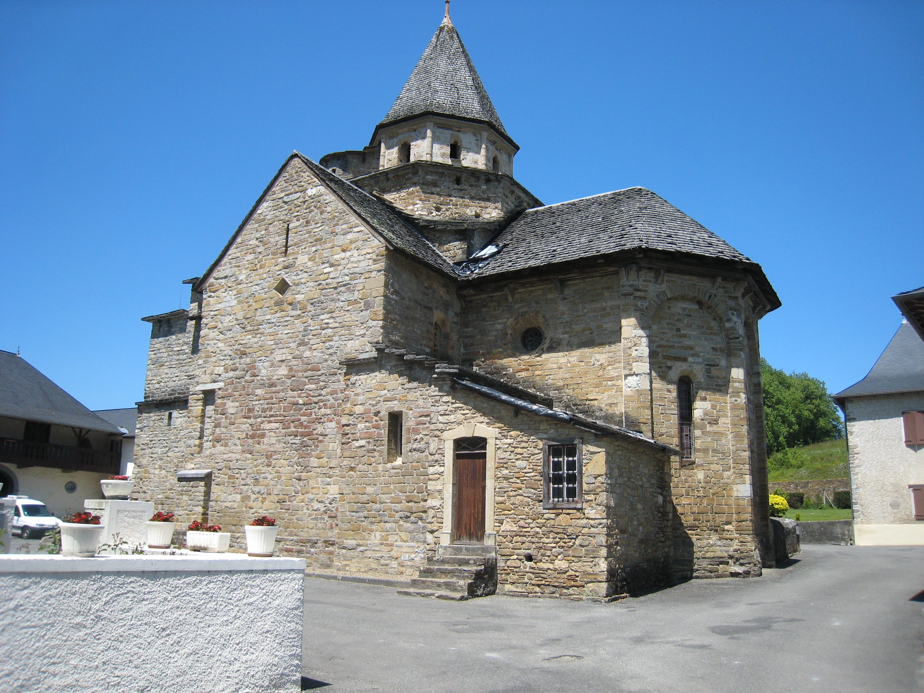 出発時の約束どおり、娘はJaca(ハカ)経由、私はSt(サン) Jean(ジャン) Pied(ピエ) de(ド) Port(ポル)経由に、Oloron(オロロン)の教会前で8時30分別れた。Oloron(オロロン)を出てすぐのところで道を迷ったが、何とか道を尋ねながら巡礼路に戻した。平坦な畑と山道を強い日差しの中、黙々と歩く。Aren(アレン)のÉglise Saint Jean-Baptiste(教会)前で昼食を摂り、14時に今日の目的地L’Hôpital(ロピタル) Saint(サン) Blaise(ブレーズ)に着く。今日の宿はMairie(マリー)(支庁)で予約しなければならず、15時オープンなので教会近くのレストランでビールを飲んだり、教会の芝生で昼食を取ったりして時間を潰した。後で、このEglise de l'Hôpital Saint-Blaise(教会)が12世紀に建造されたロマネスク様式の聖堂で、世界遺産に登録されていることを知る。15時になりMairie(マリー)に行くとおじさん1人おり、ガイド本を見せながら宿泊の交渉を行うが通じない。そのうち車で教会の片隅につれていってもらう。なんとそこにツーリストオフィスがあり、女性が今夜のプレハブ小屋のような宿に案内してくれた。時間潰しのため、付近を散策するが、人家がほとんどなく閑散とした村だった。当然ここには店がなく、宿の自販機でコーヒを買い、パンのみの夕食となる。私一人の宿泊で、さみしい夜だった。2010年5月22日(土) 快晴