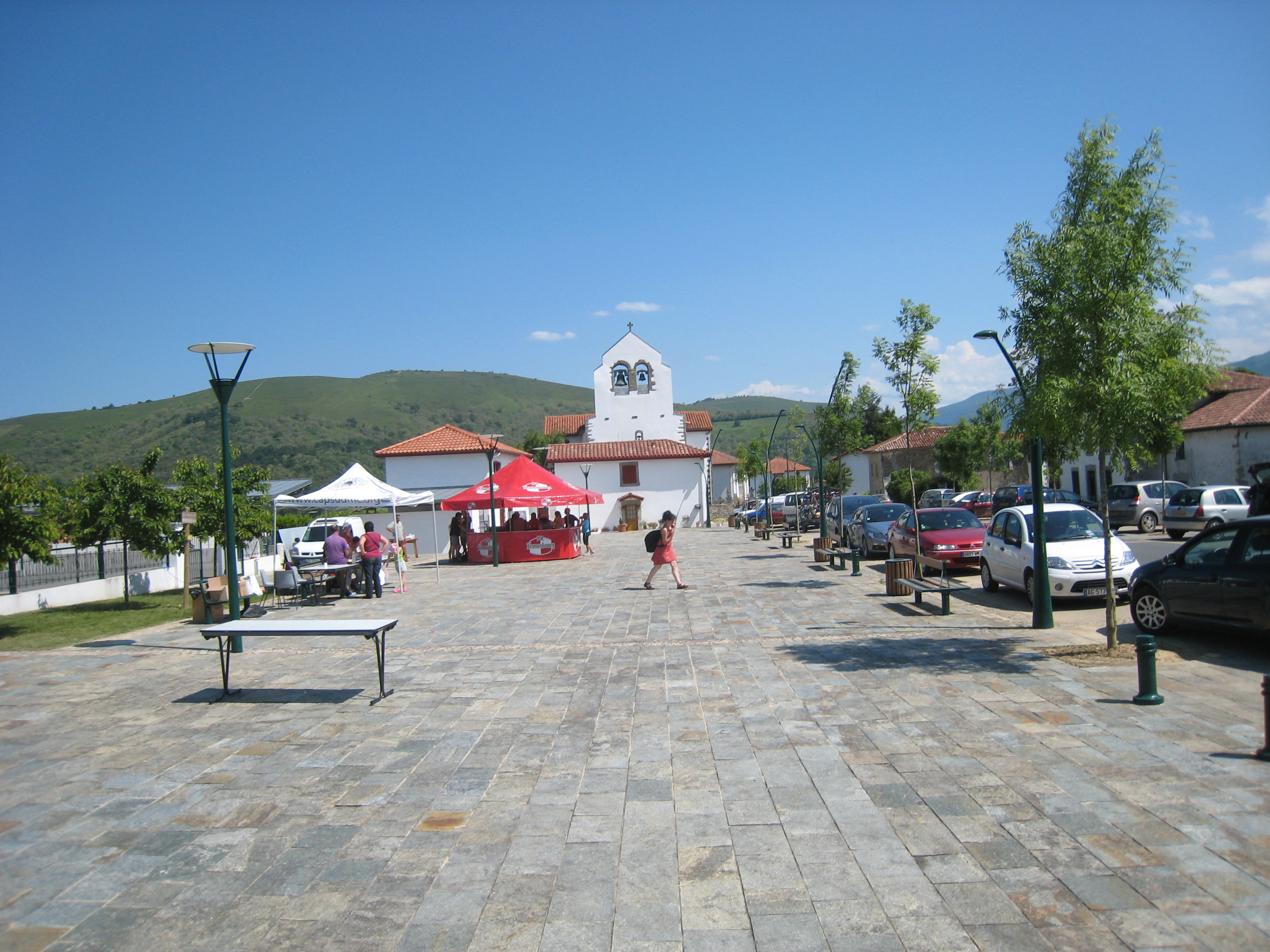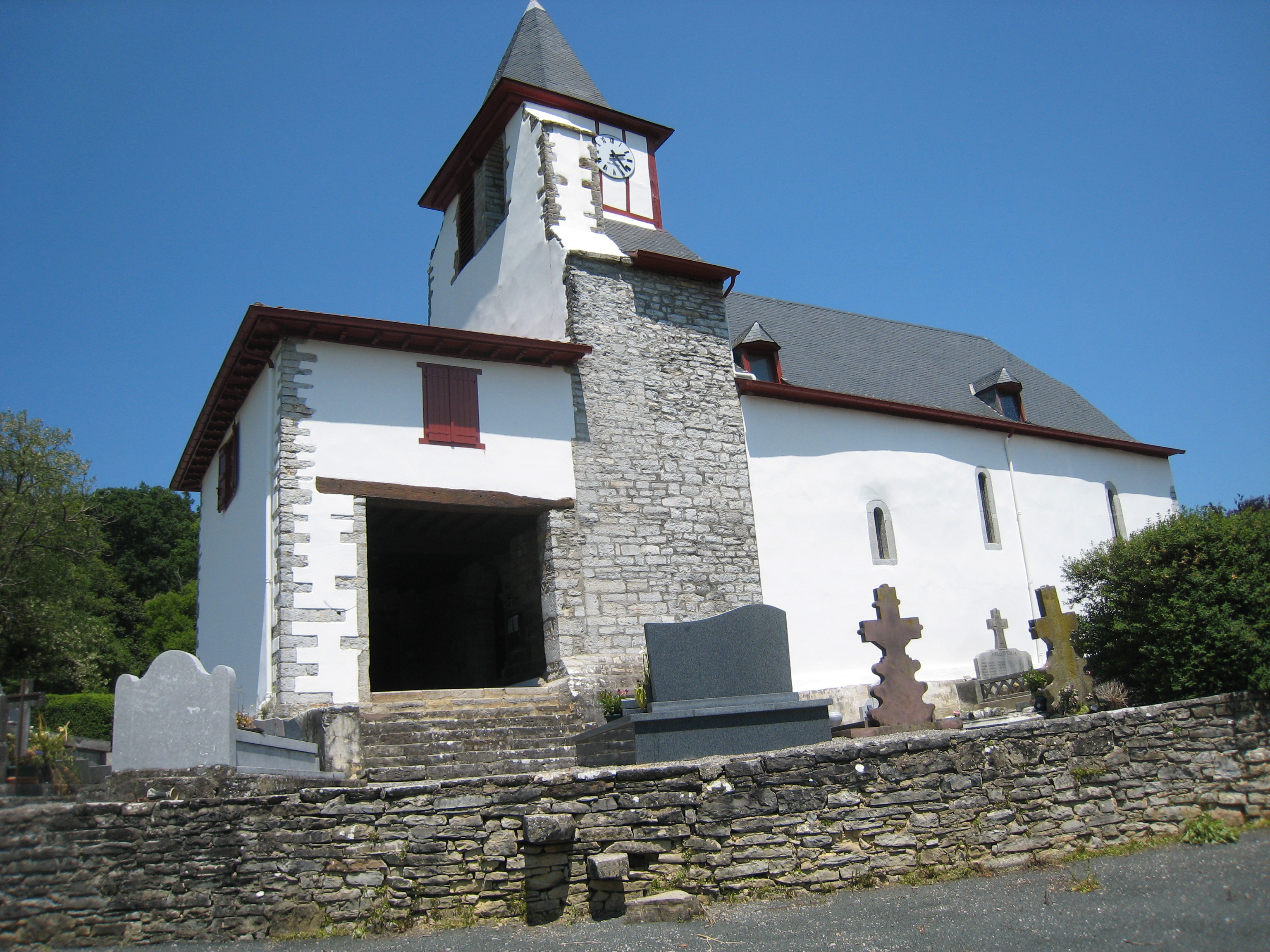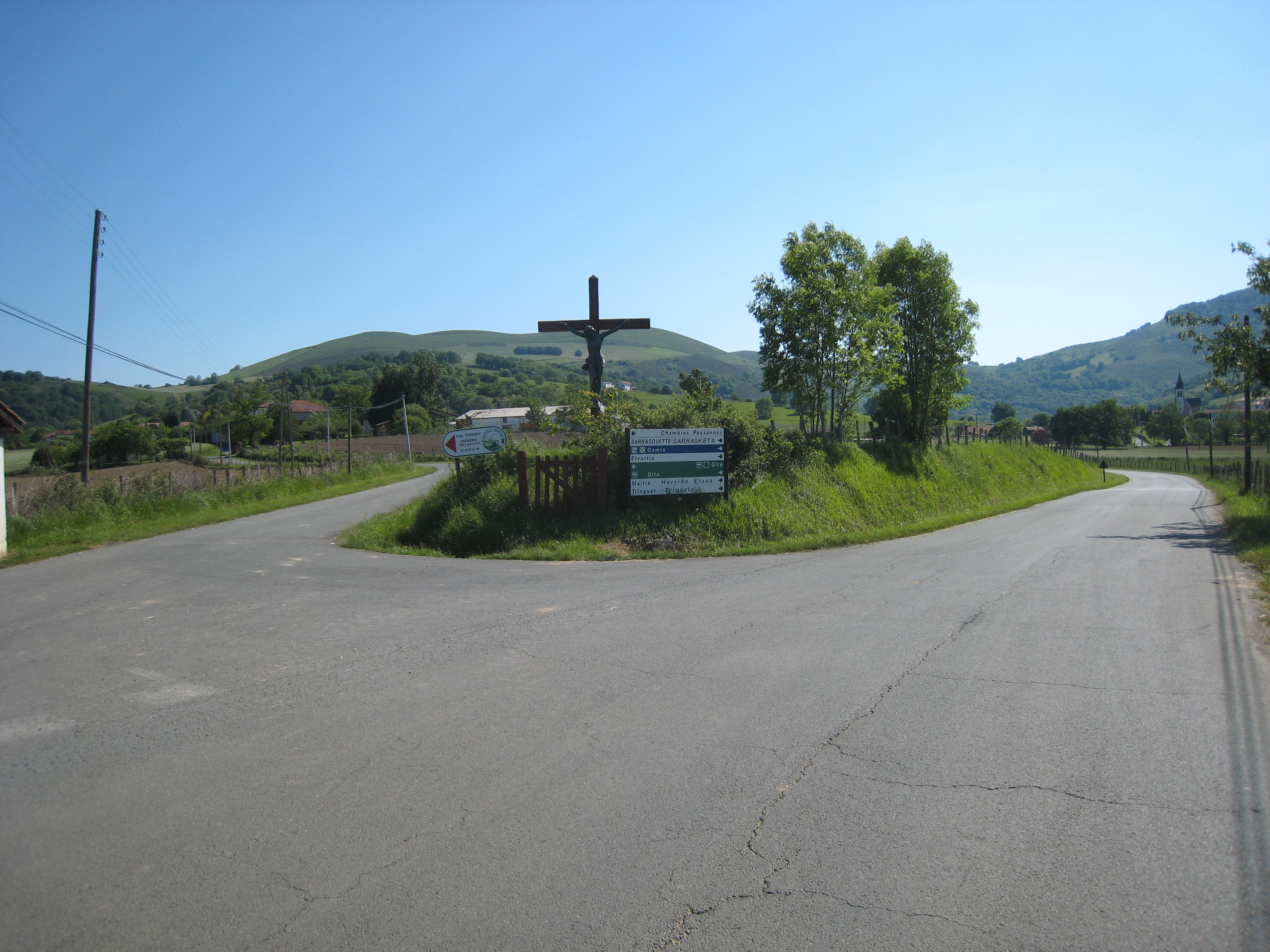 マダムの息子さんの用意した朝食を頂き、7時25分にスタートする。巡礼路まで戻り、7時45分にそこを出る。道中、放し飼いの牛、羊の大群、道路を移動中の牛群に出会う。Ordiarp(オルディアプ)の教会を10時に通過し、Napal(ナパル)峠を下った所で休憩した。そこを12時30分に出、Saint(サン) Just(ジュスト) Ibarre(イバール)のEglise Saint-Barthélemy(教会)に14時20分に着いた。今夜はここで宿泊する予定だったが、間違って通り過ぎてしまう。途中で子犬に足を連続してかまれた。次の集落をSaint(サン) Just(ジュスト) Ibarre(イバール)と思い込み、Eglise Saint-Barthélemy(教会)前でおじさんに、今夜泊まるGiteの場所を聞く。何とここは7Km離れたIbarrolle(イバロル)だという。明日通るところで、かなり疲れていたこともありがっくりきた。
