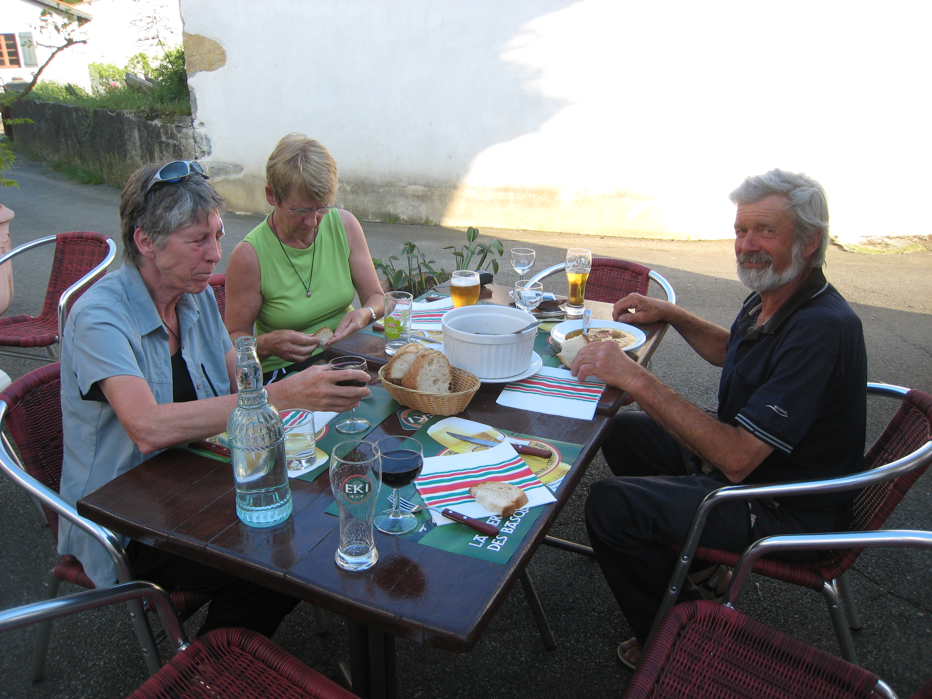 気を取り直して歩き始める。元来た道を引返せばよいのに、目的の場所を通り過ぎた認識がなくおじさん云われた方向に進む。時間的に着いてもいい頃に、3人連れに道をたずねるとLarceveau(ラルスヴォー) Arros(アロ) Cibits(シビ)だという。教会前の巡礼ボランティアらしき集団に聞くと、ここはどうもルピュイのルートらしい。Saint(サン) Just(ジュスト) Ibarre(イバール)までは8Kmと云われる。何が何だかわからなくなった。親切なおじさんがSaint(サン) Just(ジュスト) Ibarre(イバール)の宿まで送ってくれる。近くを散策すると、見覚えのあるGR78のマークと巡礼道標があるではないか。ここで教会の写真を撮ったので、確認すると写っていた。Giteは夕食がなかったので、ちかくのレストランで同宿のスイス人女性2人と馬連れのおじいさんとご一緒した。女性の一人はソンポルト越えで転倒して、顔を怪我していた。スイスの自宅からSantiago(サンチャゴ) de(デ) Compostela(コンポステーラ)まで巡礼し、今は自宅への帰りらしい。言葉が解らないこともあり、早々に退散した。2010年5月24日(月) 快晴