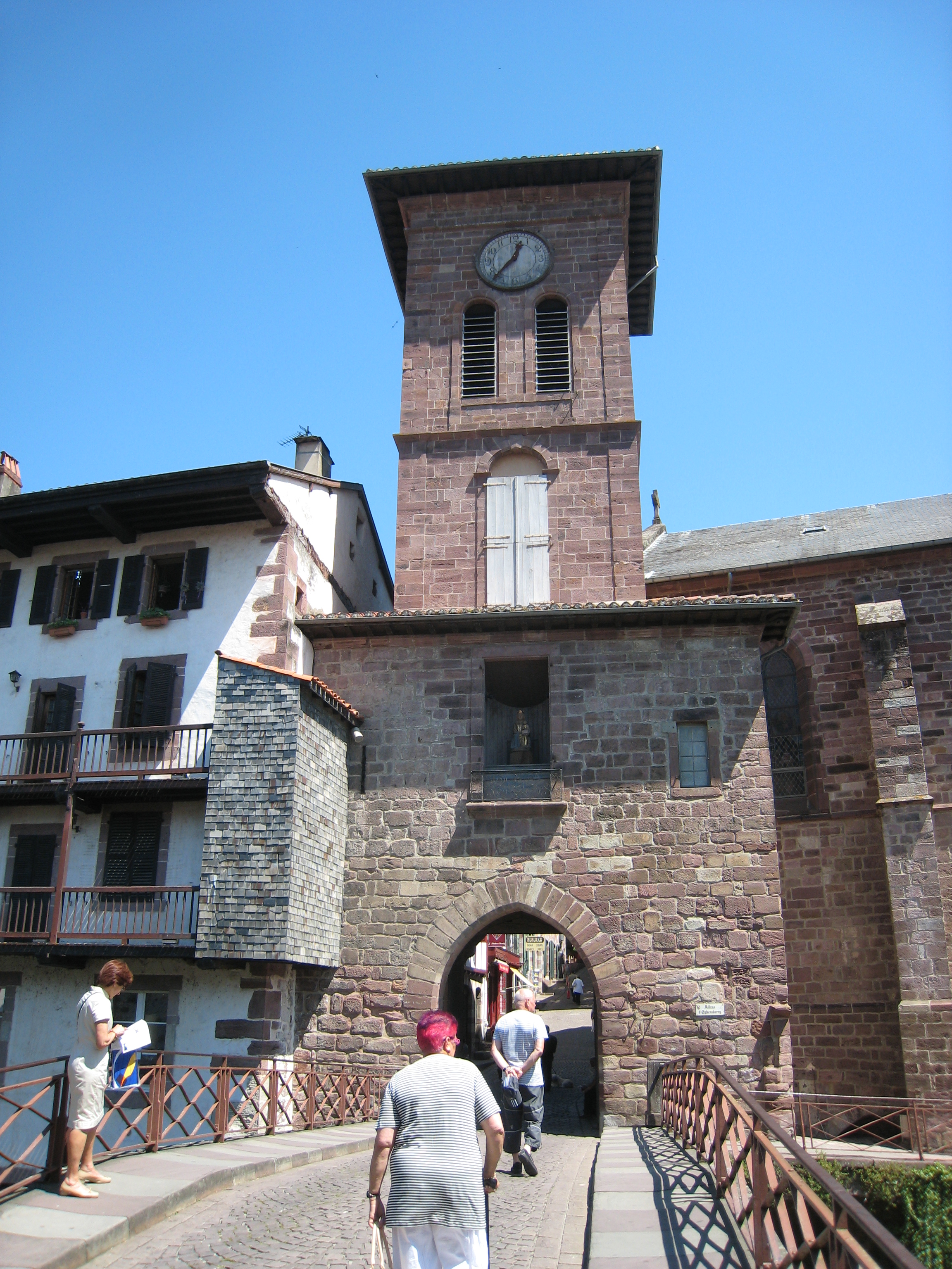 7時15分に出発。1時間程歩くと昨日道を尋ねた教会に来た。ここはIbarrolle(イバロル)で、勘違いした昨日の疑問が解けた。あのおじさんに教えられたとおり歩くと、必然的にLarceveau(ラルスヴォー) Arros(アロ) Cibits(シビ)に行くことになる(聞き間違い?)。気を取り直してスピードをあげる。急な坂道の山越えで、Gamia(ガミア)の峠を越え、ここから巡礼路をはずれ、友人で巡礼先輩のYさんが推奨したHotelに9時25分に立寄る。St(サン) Jean(ジャン) Pied(ピエ) de(ド) Port(ポル)が遥かかなたに望まれ、すばらしい景観だった。そこでクレデンシャルにスタンプをもらい、コーラを飲んで、眺めの良い道路を下った。ルピュイルートとの合流点Bussnarits(ブシュナリ)に10時45分に着く。St(サン) Jean(ジャン) Le(ル) Vieux(ヴュー)の教会に11時10分、St(サン) Jean(ジャン) Pied(ピエ) de(ド) Port(ポル)入り口のSt(サン)Jacques(ジャック)門に12時10分に着く。