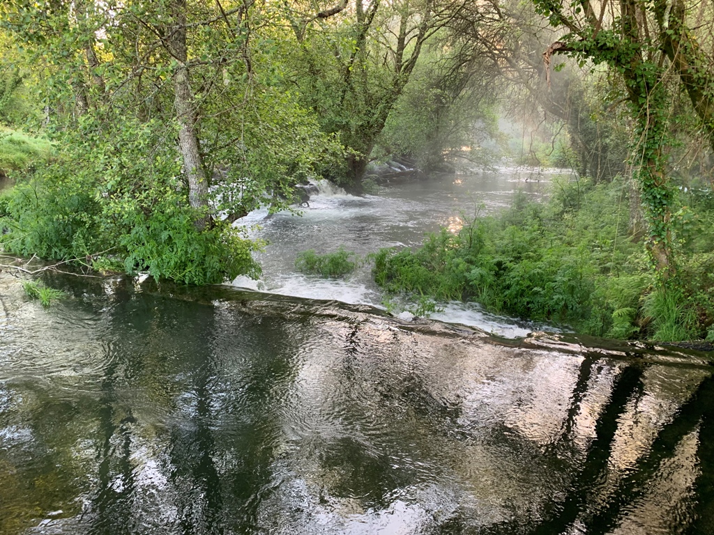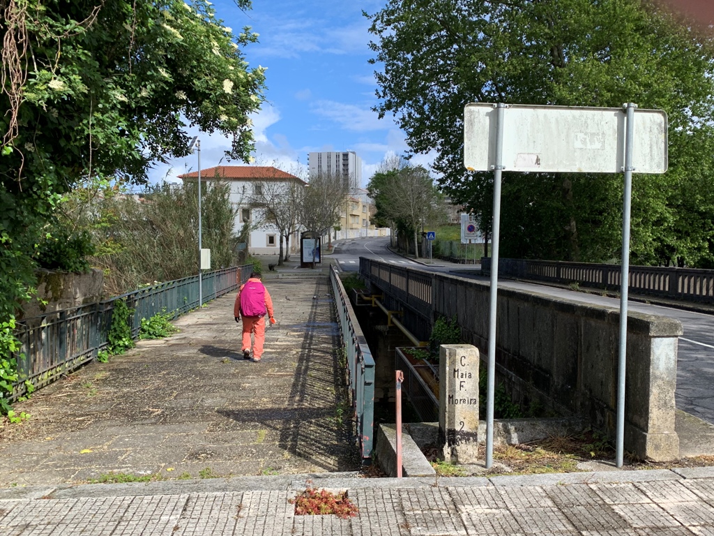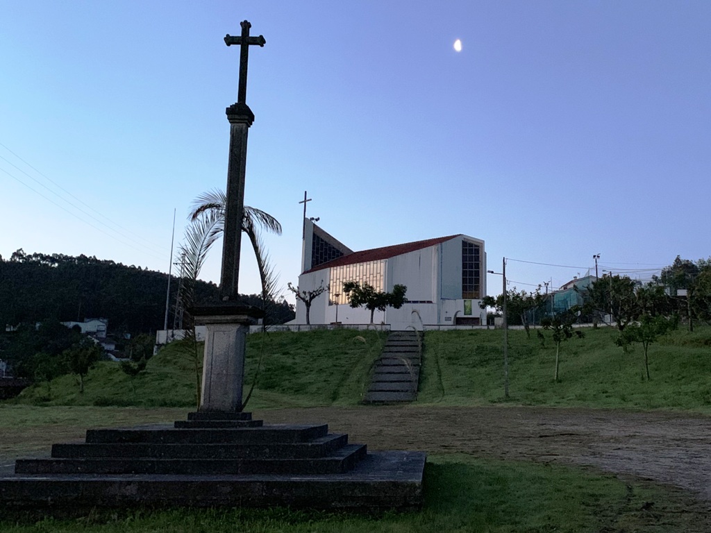 国道(N-204)を少し上って下りにかかり、暫く行くと十字架のある真新しいノサ・セニョ-ラ教会(Igreja Nossa Senhora de Fátima)がある。巡礼路はそこの階段を降りた広場を通り、農道へと繋がっている。ネイヴァ川(Rio Neiva)に架かるタバス橋(Ponte Das Tábuas)を渡る頃、ようやく太陽が畑越しに顔を見せる。