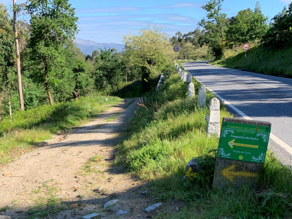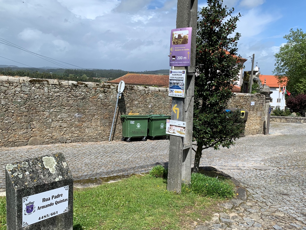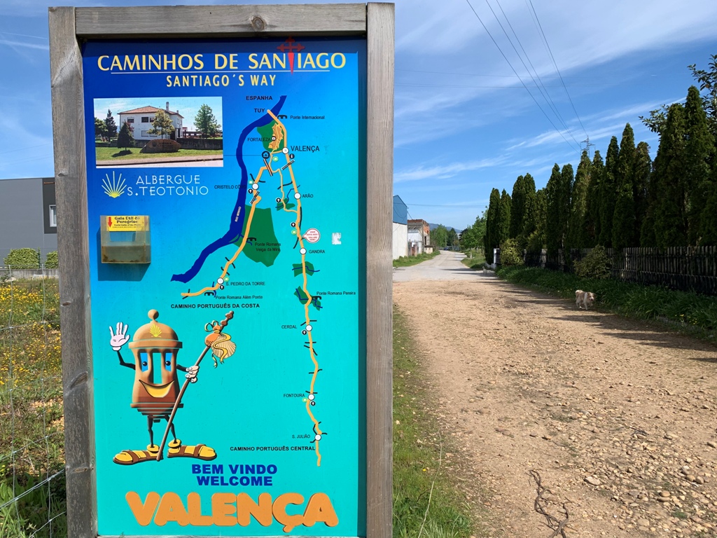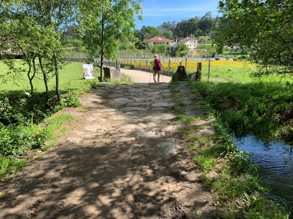 教会の裏手から山道に入り、20分程いくと視界が開け、ヴァレンサ(Valença)の町まで見通せる。急坂を下ると、再び山道となる。田んぼの畔みたいなところを出ると、チャペルと出くわす。40分程田舎道を行くと、まだ10時半というのに泊り客らしい人影が見えるアルベルゲ(Albergue Quinta Estrada Romana)がある。そこには各巡礼地までの距離が派手に表示されている。10分程で小さな川に架かる石橋(Ponte Pedreira)にかかり、傍には食事、宿泊の出来る建物がある。
