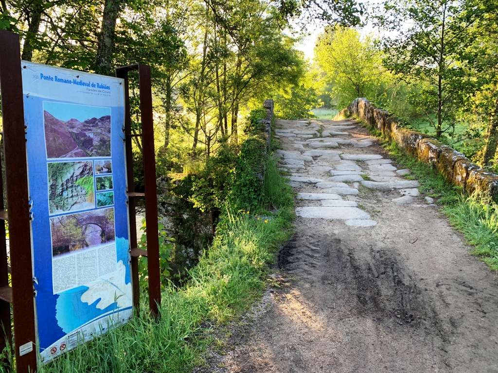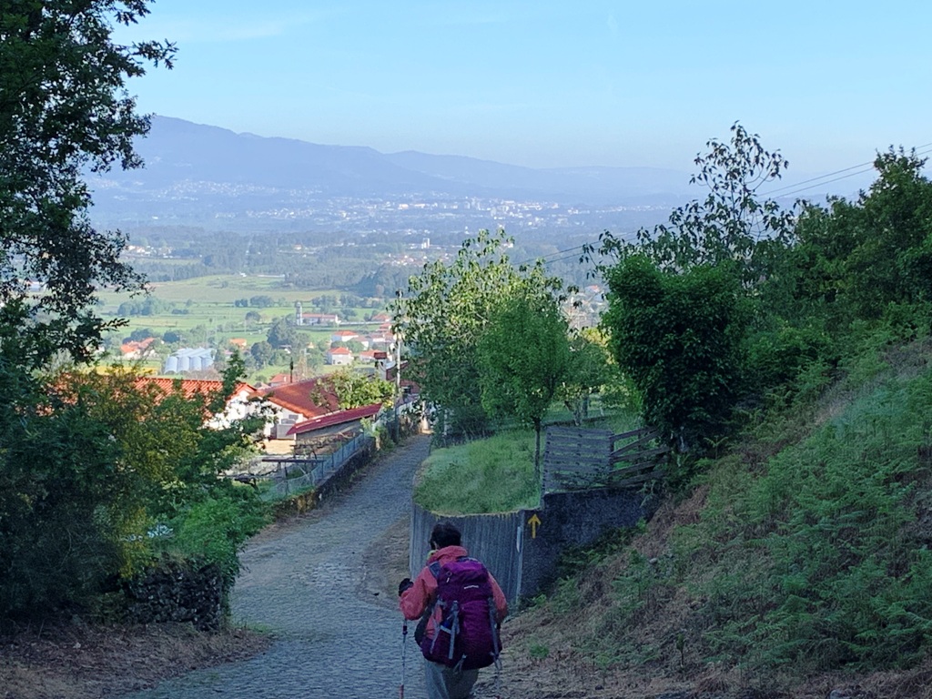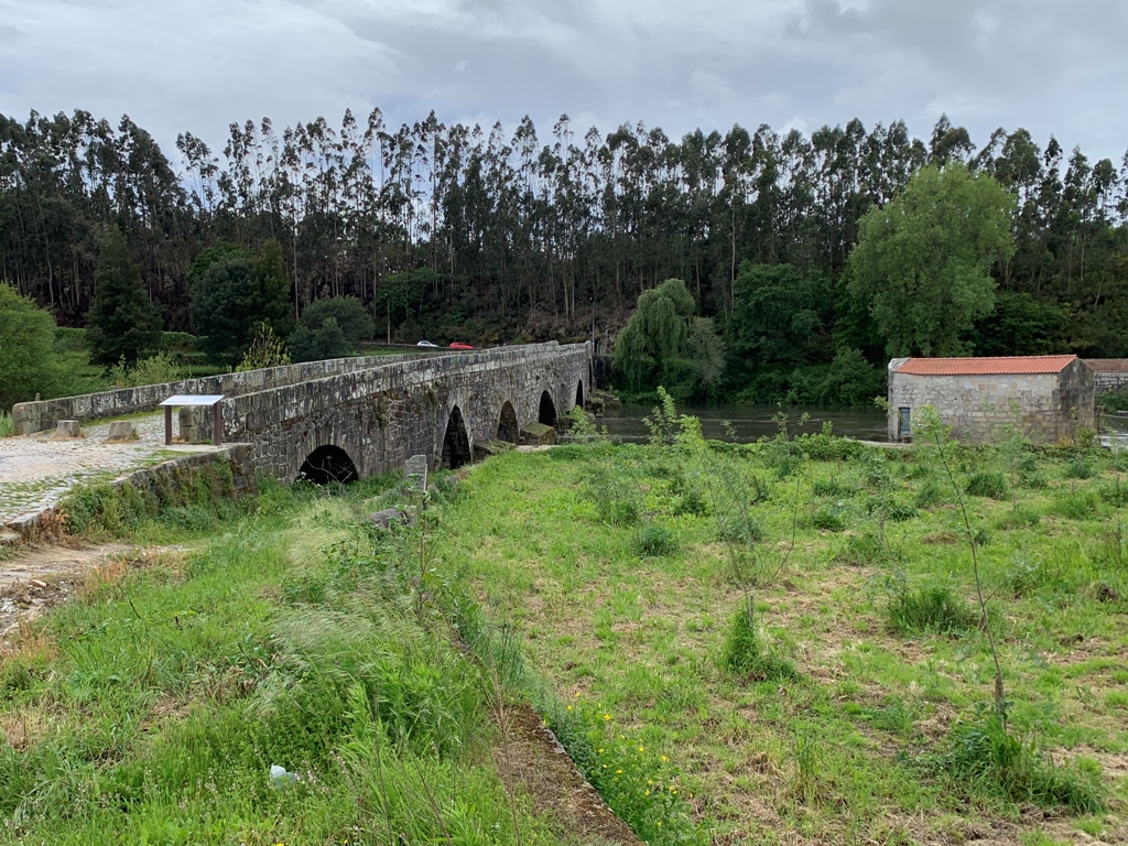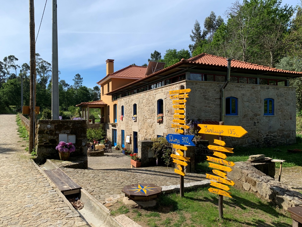 教会の裏手から山道に入り、20分程いくと視界が開け、ヴァレンサ(Valença)の町まで見通せる。急坂を下ると、再び山道となる。田んぼの畔みたいなところを出ると、チャペルと出くわす。40分程田舎道を行くと、まだ10時半というのに泊り客らしい人影が見えるアルベルゲ(Albergue Quinta Estrada Romana)がある。そこには各巡礼地までの距離が派手に表示されている。10分程で小さな川に架かる石橋(Ponte Pedreira)にかかり、傍には食事、宿泊の出来る建物がある。