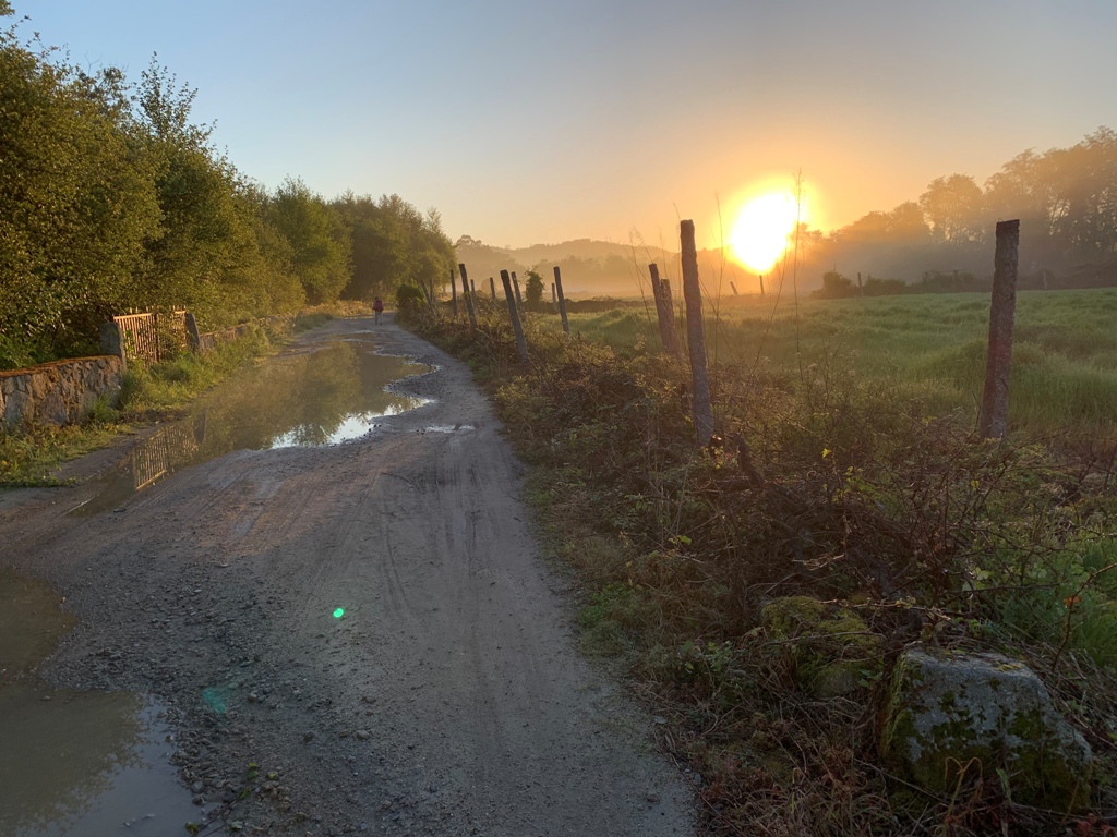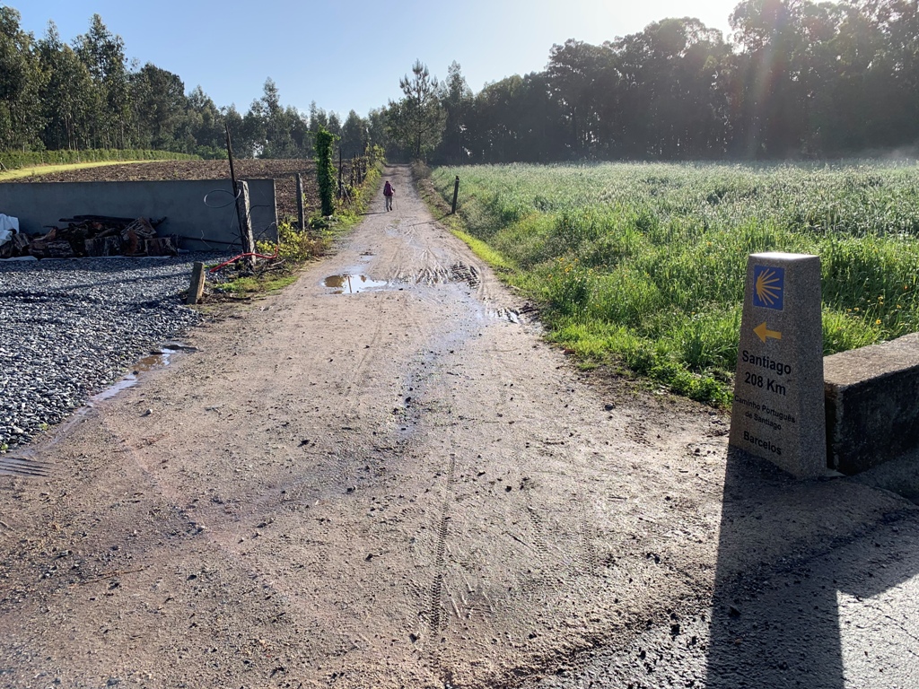 ここは公営のアルベルゲだったので、二人で10€箱に入れる。7時半頃の日の出とともに出発する。ここにきて初めて巡礼路らしい道となる。田んぼ道は昨夜の雨で水たまりが出来ている。林越しに太陽が顔を覗かせる。1時間程歩いたところで、サンチャゴまで208Kmの道標を見つける。暫くのどかな巡礼路を進むと、民家密集地に入る。ここがペードラ・フラーダ(Pedra Furada)だ。国道(N-306)に出ると小さなペードラ・フラーダ教会(Igreja Paroquial de Pedra Furada)がある。ここも扉は閉まったままだ。国道(N-306)を30分程進み、ノサ・センホラチャペル(Capela de Nossa Senhora da Guia)の先を左折して林の中に入る。住宅街を下り高速道路(A-11)下を抜けると、バルセロス(Barcelos)の表示ある。あぜ道を直進すると、小さな尖塔のあるカトリック教会(Igreja Paroquial de Carvalhal)に着く。近くにサンチャゴまで199Kmの道標を見つける。時々ひっそり祀られた祠、交差点の十字架、形ばかりの教会に佇む老人の姿を見る。このあたりから都市に近づきつつ景色になり、墓の横を過ぎると国道(N-205)に出る。