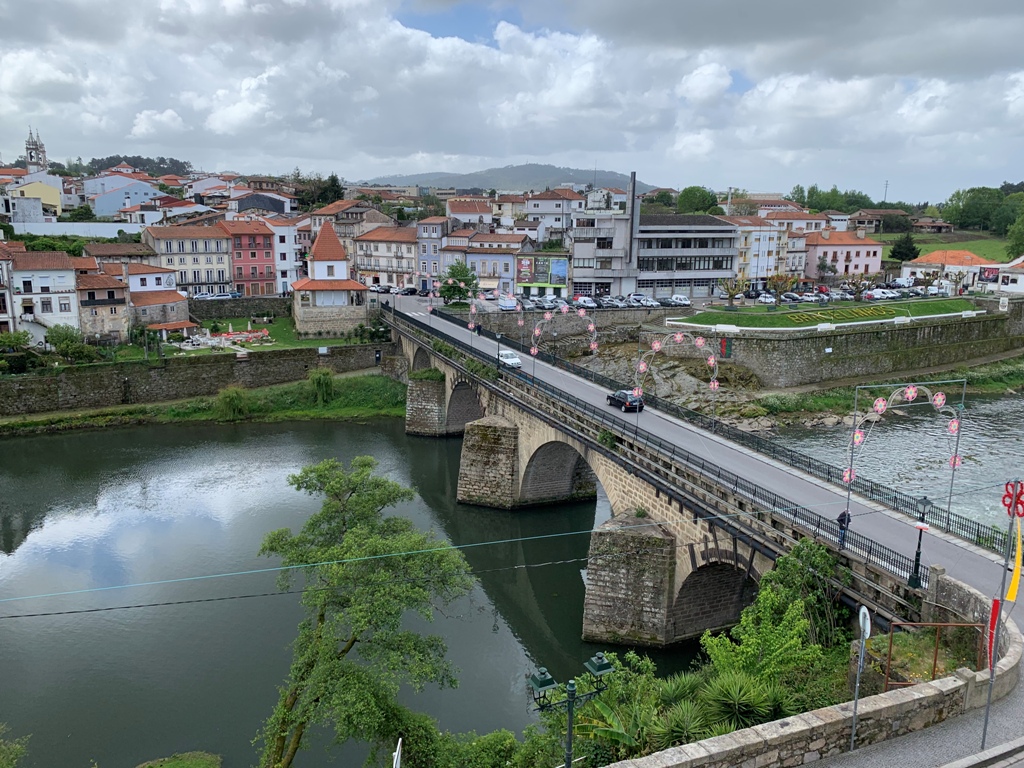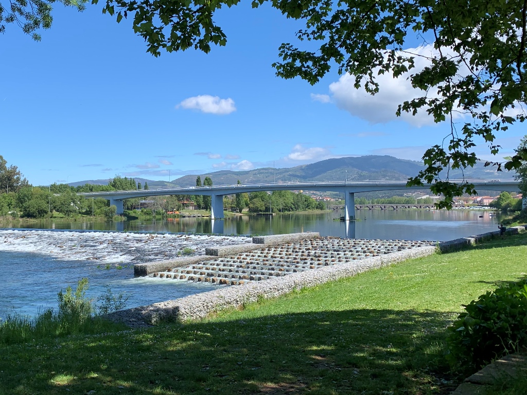 葡萄畑といくつかの集落を過ぎると、壁に手書きのPonte de Lima 1Kmの表示が目につく。2分程行くとローベラ川(Rio Trovela)に架かる小さな橋がある。さらに暫く進むとリマ川(Rio Rima)に架かる長い橋が見えてくる。橋を過ぎ、リマ川面した緑地帯を教会(Igreja de Nossa Sra. da Guia)、ホテル(INLIMA Hotel & Spa)、博物館(Igreja de Nossa Sra. da Guia)等の建物を経て、やがて