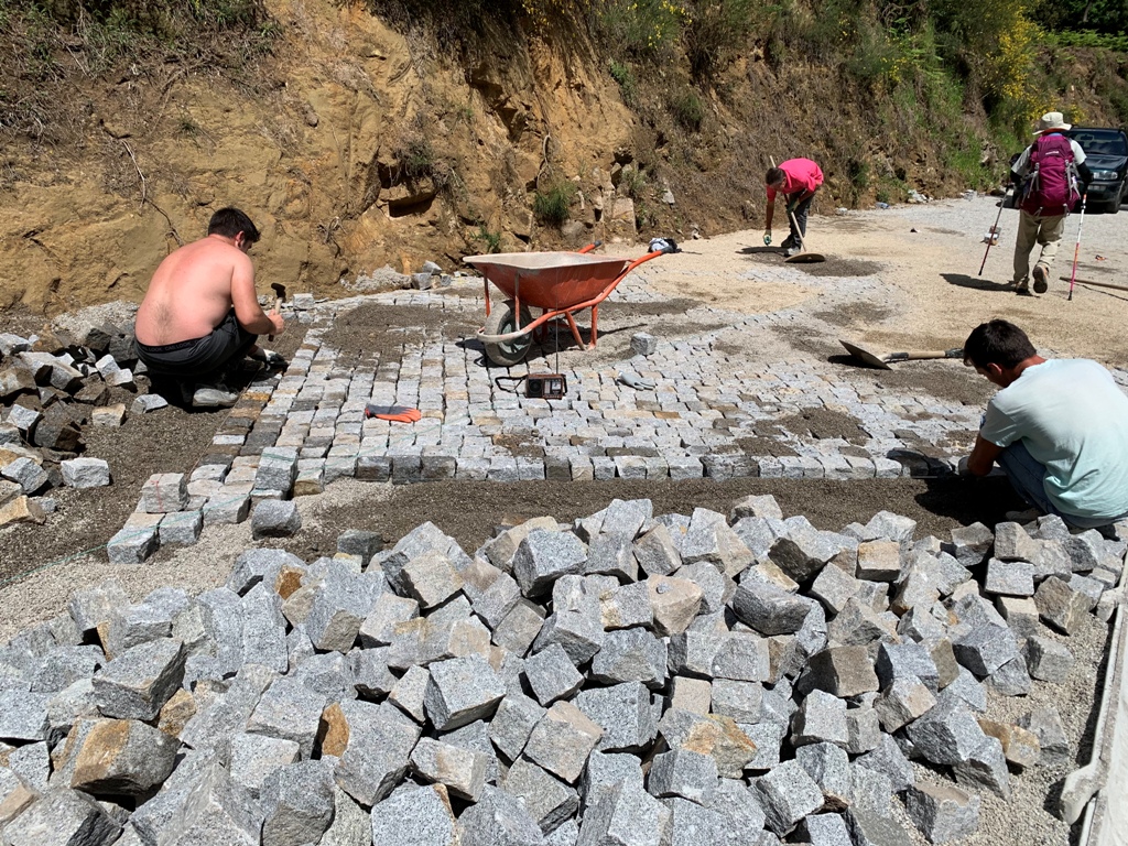 遠くにサッカ-場を見て、30分程歩くと線路にぶつかる。矢印はかなり迂回するようになっていたが、迂回してきた巡礼者に線路を横断するよう見張りまでしてくれる。無事線路横断し、暫く進むと石畳の新設工事の現場に出くわす。今でも石畳を作っているのだと、新たな認識をする。タメル(Tamel)の標識から上り坂になり、山間の道路を上り切る付近に教会がある。そのパロクアル教会(Igreija Paroquial São Pedro Fins)横の階段を上ると、新しいアルベルゲ(Albergue de S. Pedro Fins - Tamel - Barcelos)がある。アルベルゲ前の芝生広場でのんびりしていると、受付の係員からパン販売車が来ていることを教えられ、アルベルゲで既に買っていたが更に購入する。このアルベルゲには簡単な食べ物と飲み物を備えている。すぐ前の17時から食事出来るレストラン(Restaurante 2000)で夕食を摂る。