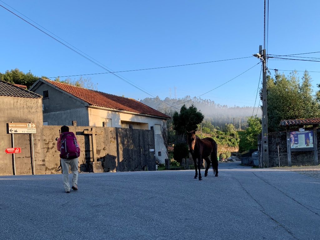 国道(N-204)を横断して狭い住宅地の路地を歩いていると、道路上の馬と出くわす。パンを一切れ与えると、何と私たちに付いてくるではないか。それから20分程、付かず離れずついてきた。地元の人らしき人に、ようやく追い返してもらう。そこから林の中を進み、サン・セバスチャチャペル(Capela de São Sebastião)のある十字路で国道(N-204)を再び横断し、葡萄畑の中を進む。すると巡礼者がたむろする花で囲まれたホタテのついたLugar do Corgo Casa Fernandaと名前の案内板がある家があった。後で確認すると、ユ-スホステルだった。再々度国道(N-204)を横断すると、15分程のところに教会のような建物の議会(Junta de Freguesia de Vitorino dos Piães)がある。巡礼路は国道(N-204)に沿って続いている。そこから山道になり、民家には花が沢山植えられている。道沿いには白いサトイモ?科と思われる大きな花が群生している。国道(N-203)に出ると、ファッシャ(Facha)の表示があり、Ponte de Limaまで10.4Km、2時間6分の細かい数字表記のところを左折して、急坂の山道となる。そこをスピ-ドを出して走る自転車にびっくりする。20分程歩いて道路に出て、すぐ左折するところにPonte de Limaまで9Km、1時間49分の細かな表示をしている。そこから先Ponte de Limaまで同様の表示が沢山ある。スナックバ-(Bogani Desperta Mariaestina)で朝食休憩とする。