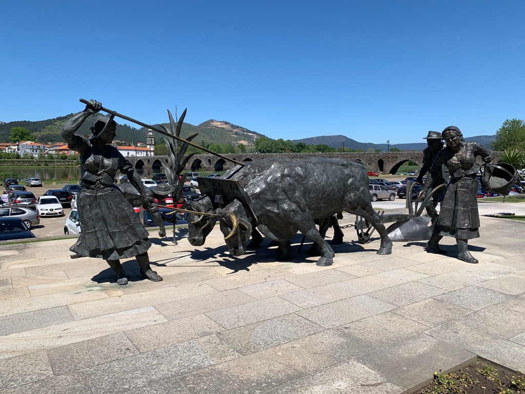 ポンテ・デ・リマ市街地に入ると、ブロンズのモニュメント2体がまず目につく。河原には沢山の車が駐車し、大勢の観光客で賑わっている。背景に