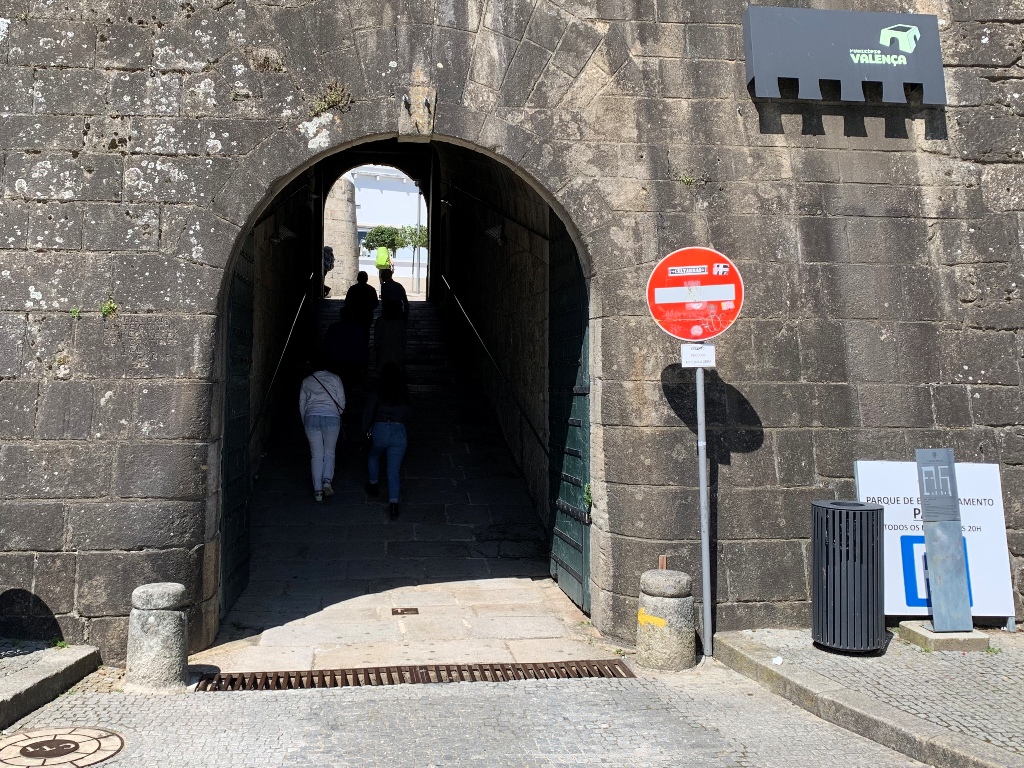 ヴァレンサ駅を出て通りに戻り、スペイン通りに入る交差点から左の坂道を登ると城塞下のトンネル(Portas do Sol)にぶつかる。そこを抜けると、周囲を要塞(Fortaleza)に囲まれた商店街、飲食店が林立し、2つの教会がある