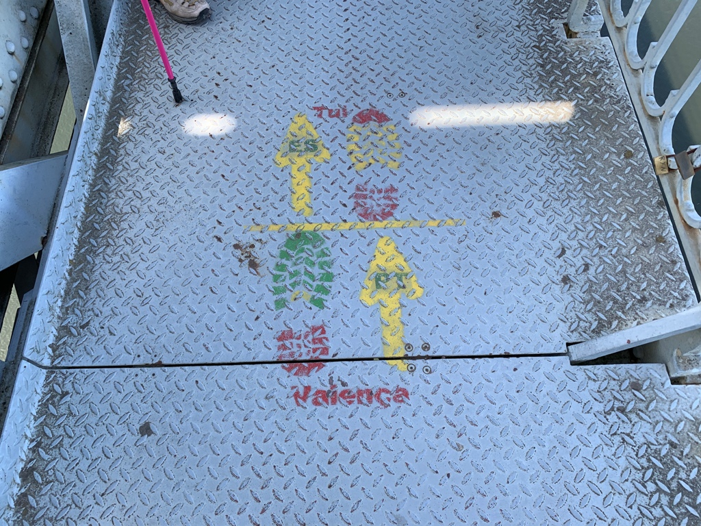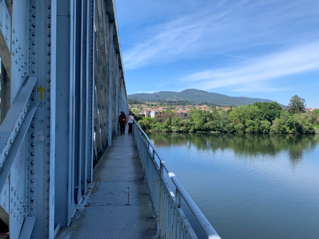 城壁下のトンネルを抜け、石畳の道を暫く下ると、ミ-ニョ川(Rio Minho)に架かる国際橋(Ponte Rodo-Ferroviária de Valença)に出る。国際橋の歩道橋を渡っていると、中間点にヴァレンサ(Valença)とトゥイ(Tui)の境界線の足跡と矢印がある。ここがポルトガルとスペインの国境だ。