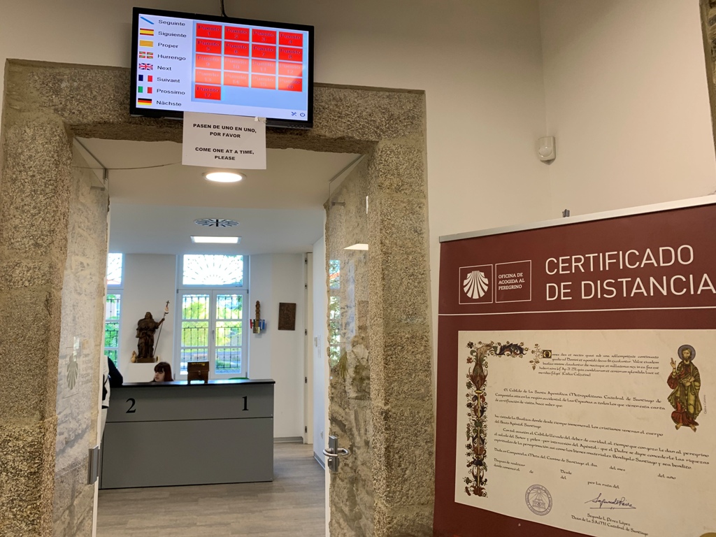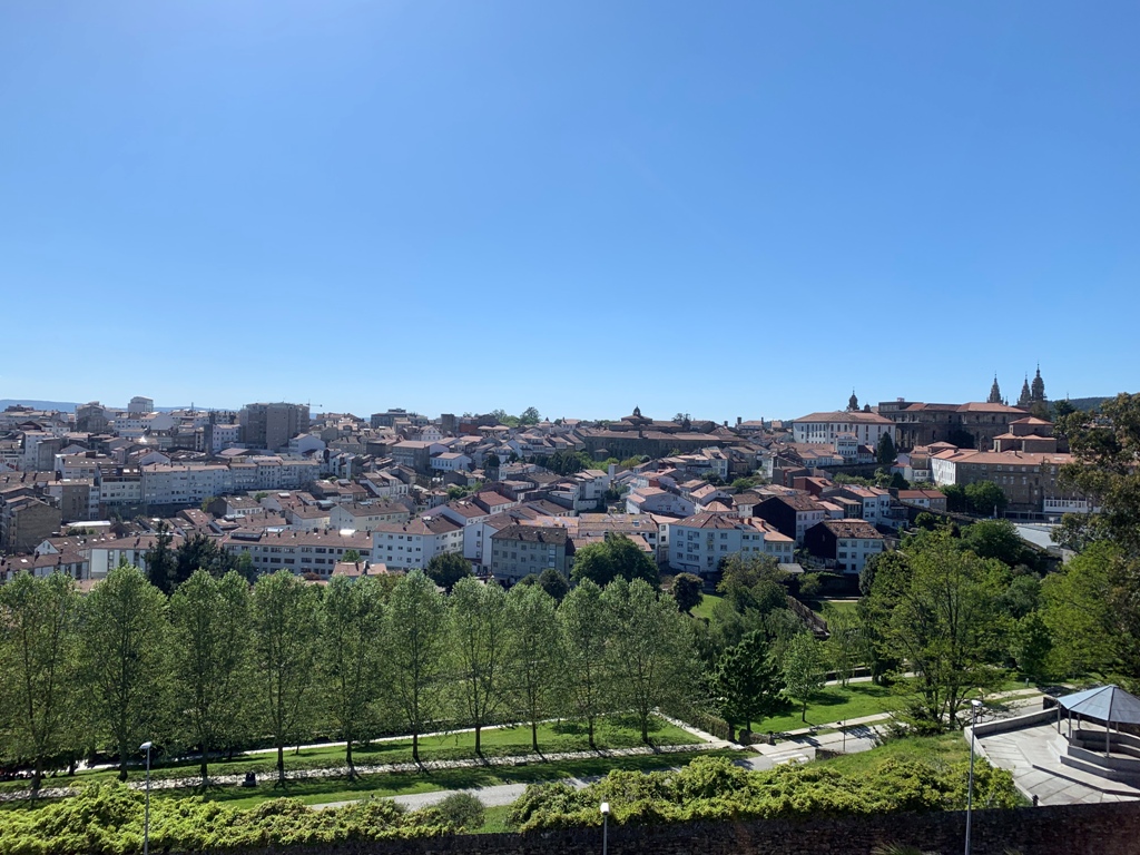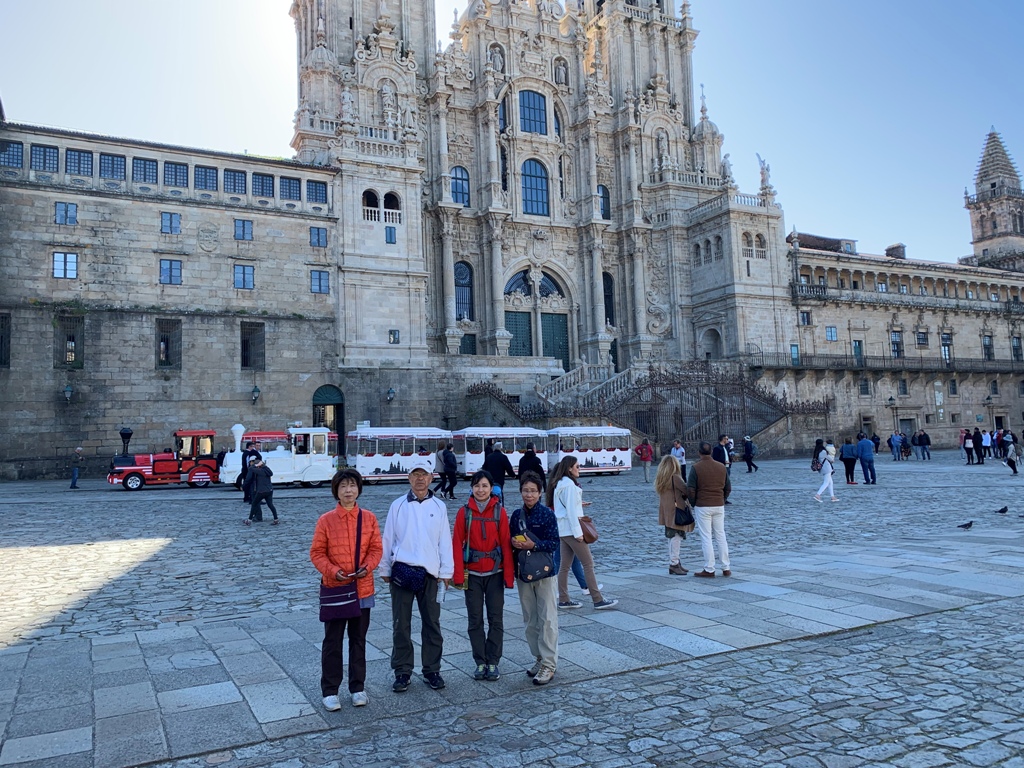 アルベルゲを7時前に出発し、高台からサンチャゴの市街地を写真に収める。そこから、昨日もらえなかった巡礼証明書を発行してもらうために、昨日の巡礼証明書発行窓口に向かい、7時半頃に到着する。期待に反して早朝から行列が出来ていた。2時間程待ってようやく巡礼証明書をもらう。そこから再び大聖堂に向かい、10時半頃ポルトに移動する娘とサンチャゴ大聖堂(Catedral do Santiago)前で別れる。私たちは、昨日打ち合わせした高台にあるカミーノ・フランセ(Camino Frances)のモンテ・ド・ゴゾ(Monte do Gozo)に行くことにする。私は、今日を含めて4日間あるので、当初フィステラ(Fisterra)とレオン(Leon)を計画していたが、交通の便が悪いので、ビ-ゴ(Vigo)経由ポルト(Porto)に計画変更する。明日のビ-ゴまでの切符を買うため、モンテ・ド・ゴゾへ行く途中にある昨日寄ったサンチャゴ・バスタ-ミナル(Estacion de Autobuses)に向かう。生憎切符売り場窓口は閉まっていた。何とかフィステラに行けないかバスの便を確認すると、距離的には90Km程だが停車駅が多く2時間半程要する。日曜日は便数が少なく、今からだと12時発で、帰りの便は16時45分になる。フィステラでは2時間程しかなく、岬まで往復2時間かかるので、滞在時間を殆ど取れない。また、サンチャゴ着が19時を超えてしまい、今夜の宿をパラドール(Parador de Santiago)に予約しているのでまずい。この時点でフィステラに行くことを諦める。この駅にカフェがあったので、取敢えず腹ごしらえをする。窓からタクシ-乗場が見えたので、参考のため値段を聞きにいく。要領を得ないが、名刺を貰い、値段は片道90€、往復120€だと理解する。カフェに戻り、皆に相談すると、二つ返事で行くことに決定する。