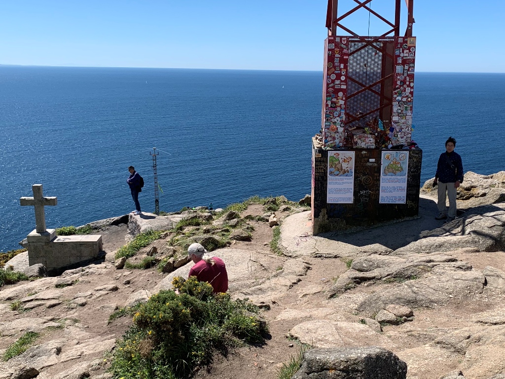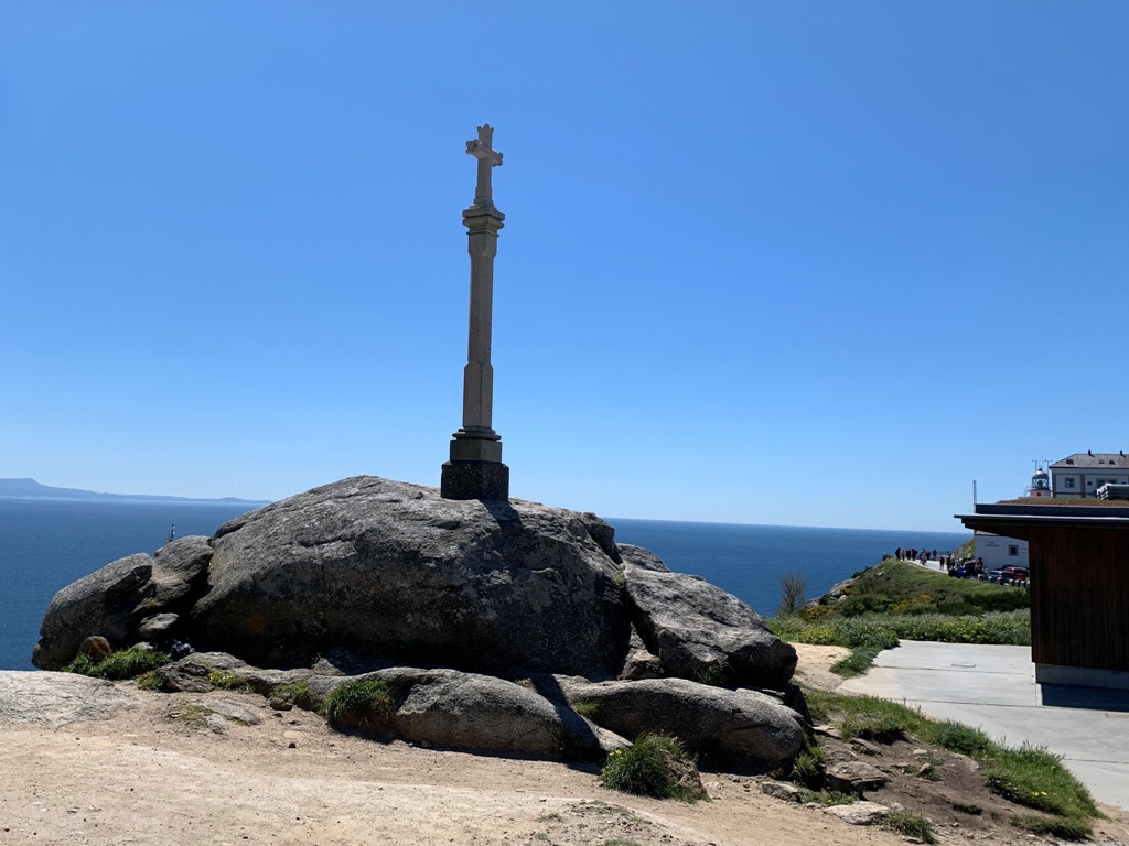 タクシ-は鉄道のサンチャゴ駅横を通り、暫くポルトガルの道で通った道路から左に逸れた。1時間半程たった12時47分に、フィステラの岬の駐車場に着く。道中、巡礼者を時々見かけたがまばらだった。タクシ-を待たせて、岬の突端まで散策する。定番の灯台を背景に0Km道標の記念写真を撮る。岬の最先端まで下りると、大西洋の青さと海向こうの陸地が眼前広がる。私は9年前にサンチャゴから3日間かけて歩いてきたが、あの当時と何にも変わっていない。運転手をあまりまた待たせては悪いので、50分程で駐車場に戻る。最後に十字架の写真を取り、フィステラ岬を後にする。