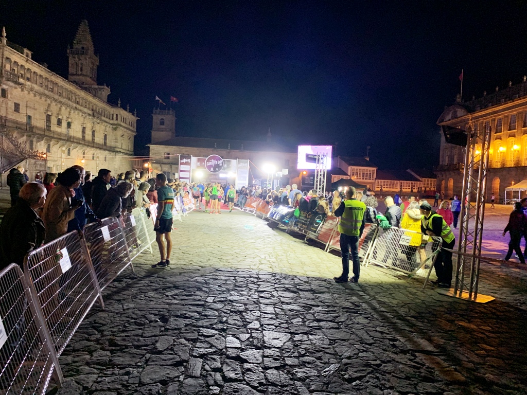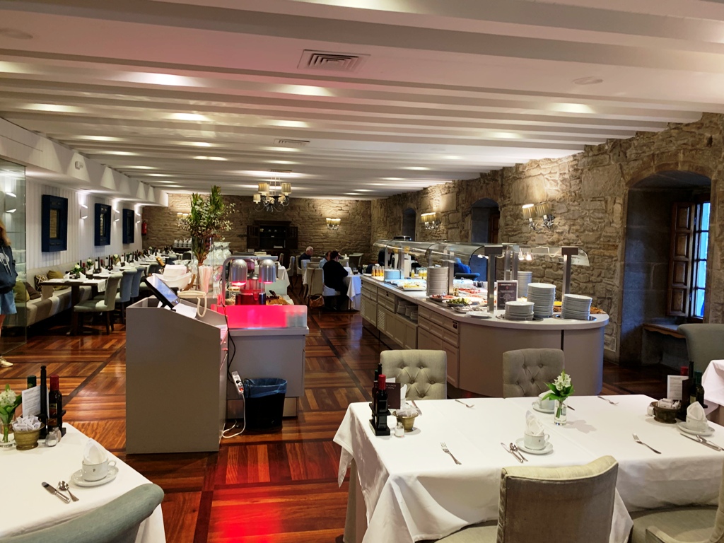 昼食を摂ってなかったので、運転手にパン屋に寄ってもらうことにする。13時30分頃出発する。フィステラの町の海岸線を通り一軒のパン屋に寄るが、菓子パンばかりで直ぐに店を出る。さらに捜してくれるが、諦めてサンチャゴに直行する。タクシ-の運転手は英語が全く解らないので、こちらの要望が正確に通じない。 パラドール(Parador de Santiago)前に14時50分に着く。9年前に朝食を振舞われたホテルで、まさかこのホテルに泊まることになるとは思いもしなかった。友達夫婦は、明日朝早くサンチャゴ空港に行くので、このタクシ-を予約する。パラドール横のカフェテリアで遅い昼食を摂る。17時半にパラド-ルを出て、公園近くのス-パ-で買物をする。ディナ-は20時半頃から始まり、1時間程パラドールの料理とスペインワインを堪能する。隣席は日本人の団体客が占めて、大変賑わっていた。22時過ぎ、オブライド広場(Praza do Obradoiro)に出ると、マラソンのゴ-ル地点に、大勢の人がたむろしていた。先頭ランナ-のゴ-ルを暫く観戦して、パラドールに帰る。(ビ-ゴ観光)