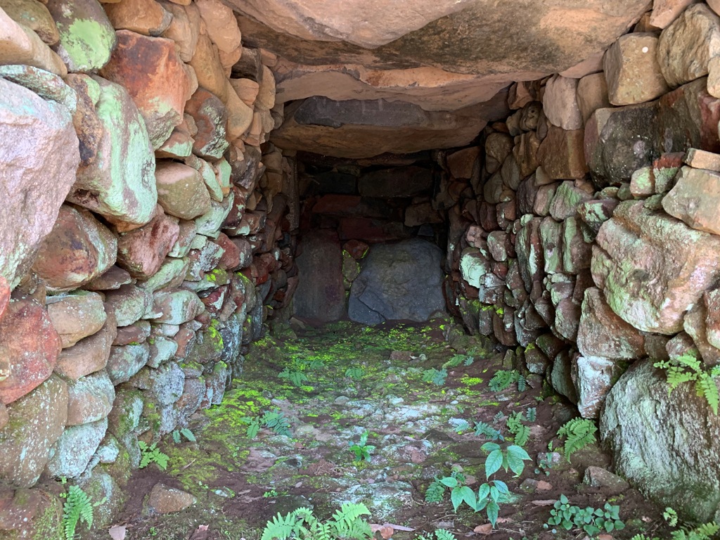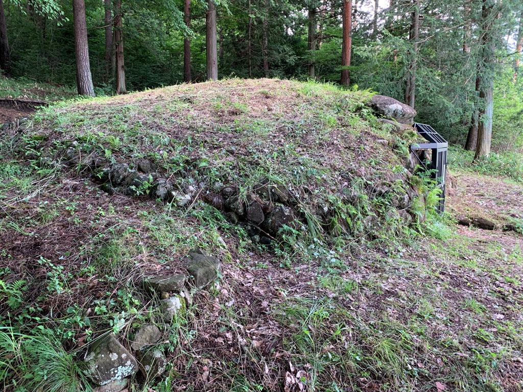 (概要) 唐櫃石古墳は昭和49年に発掘調査が行われ、墳径は直径12mほどで、その周りに周溝が掘られている円墳。墳丘正面の石積に特徴がある。石室は奥行5.7m、幅1.7mの横穴式石室で、石室内はベンガラで赤く彩色してある県内でも数少ない古墳である。(案内板転記) 古墳内にヒカリゴケが自生している。 (アクセス) 国道20号出早信号から上の原小学校東側の住宅地に進む。その一角にヒカリゴケの道標があり、その路地を入る。 ➠ Map