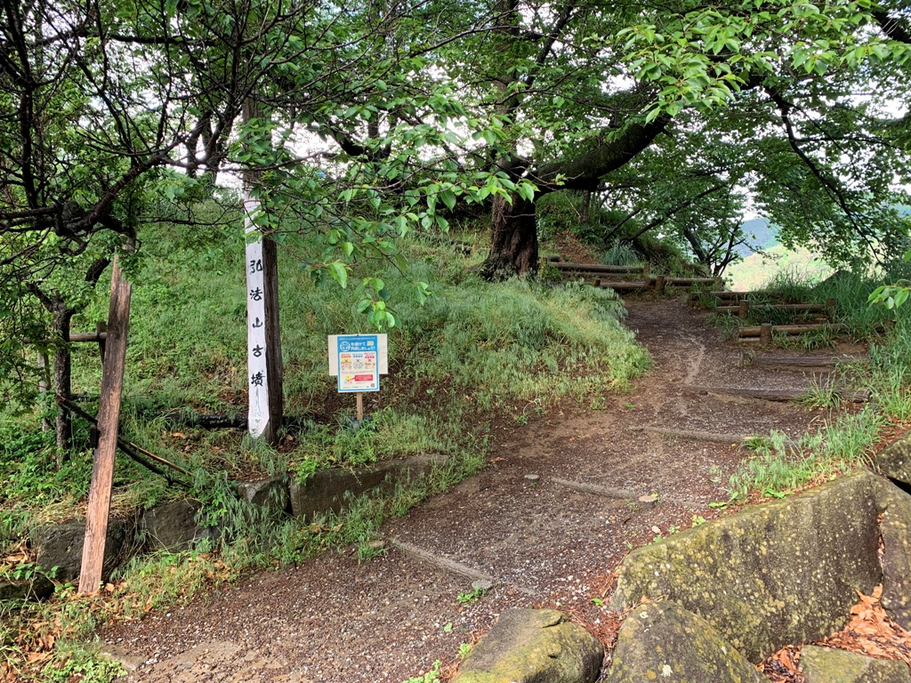 国道19号高宮交番信号から出川方面に向かう。並柳信号を越え、あさのラ-メン店を右折して暫く進むと弘法山駐車場がある。道標のところの階段を上り、5分程で墳丘上に着く。そこから松本市街と北アルプスの絶景が広がる。古墳の周囲には沢山の桜が植えられ、桜の名称としても知られる。