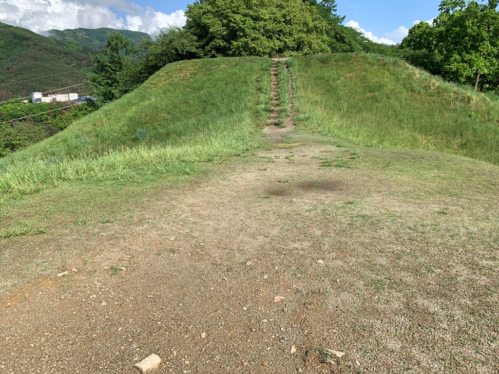 古墳は、ふもとから頂上までの高さ約60mの丘陵突端に前方部を北に向けて築造されています。墳頂からの視界は東から北、そして西方と200度以上に広がり、遠く北アルプスの連峰が一望できます。まさに国見ヶ丘で、被葬者がこのような景勝の地を選んだのは故なきこととは思えません。古墳から望むことができる当時の推定水田面積は北に70ha、西に40haとずば抜けて広い。