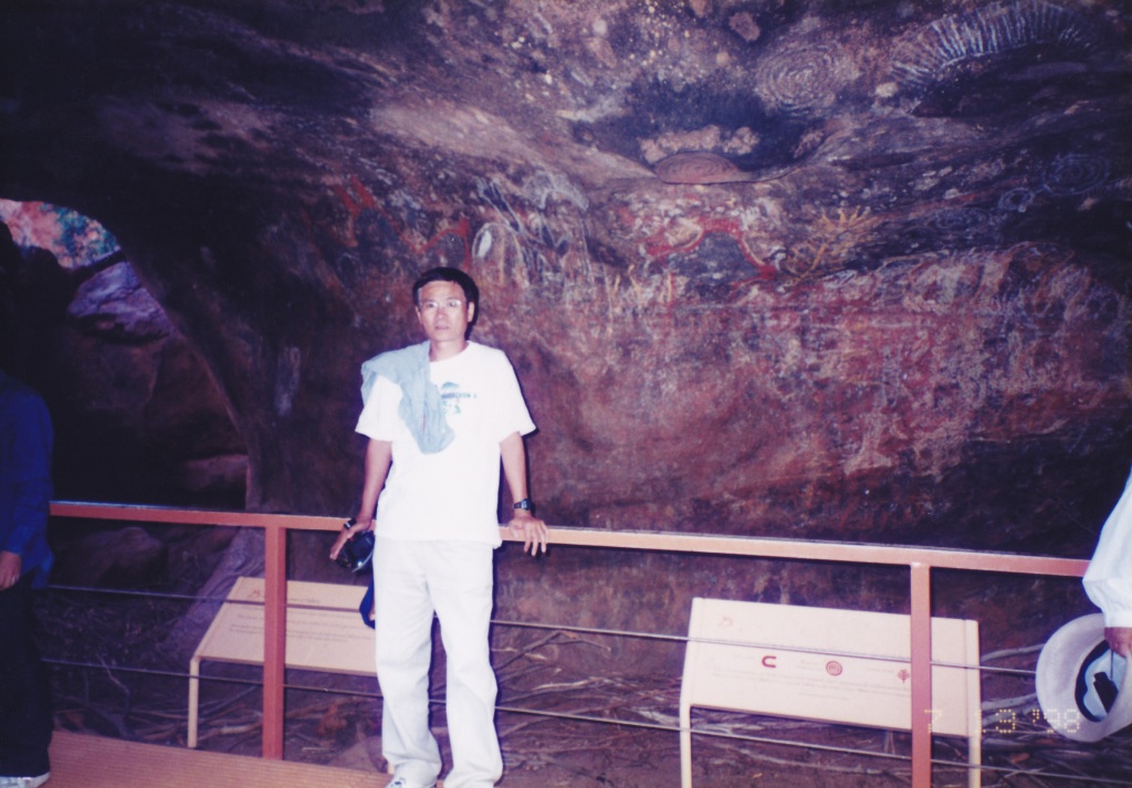 に行き、オルガ渓谷を散策する。次にメインのエアーズロック_ウルル(Uluru )の観光だ。エアーズロック登山口を時計回りに進み、天井にアポリジニの動物等の壁画が描かれている小さな洞窟と小さな池があるカンジュ渓谷(Kantju gorge)に行った。エアーズロックが夕日に染まっていく光景を見るため、サンセット・ビューイングエリアへと向かう。真っ赤に彩色されていく岩山にしばし見とれる。こんなに赤く染まるのは、年に数えるしかないらしい。夕食は今夜の宿アウトバッグ・パイオニア・ホテルアンドロッジ(Outback Pioneer Hotel & Lodge)で本ツアー参加者と共にする。ワルパ渓谷を歩く2.6Kmのワルパ散策路があり、