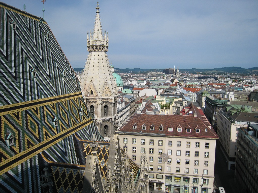 Walk from the hotel to Otto Wagner Pavilion, Baroque Karlskirche.The interior of the church was marble, and the frescoes on the ceiling and the gorgeous altar were impressive.Then we arrive at St. Stephen's Temple around 9 o'clock.Take a walk through the temple and go up to the lower north tower.I could see the mosaic-patterned roof and the cityscape of Vienna.Have lunch near the National Opera.