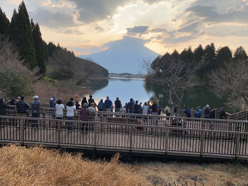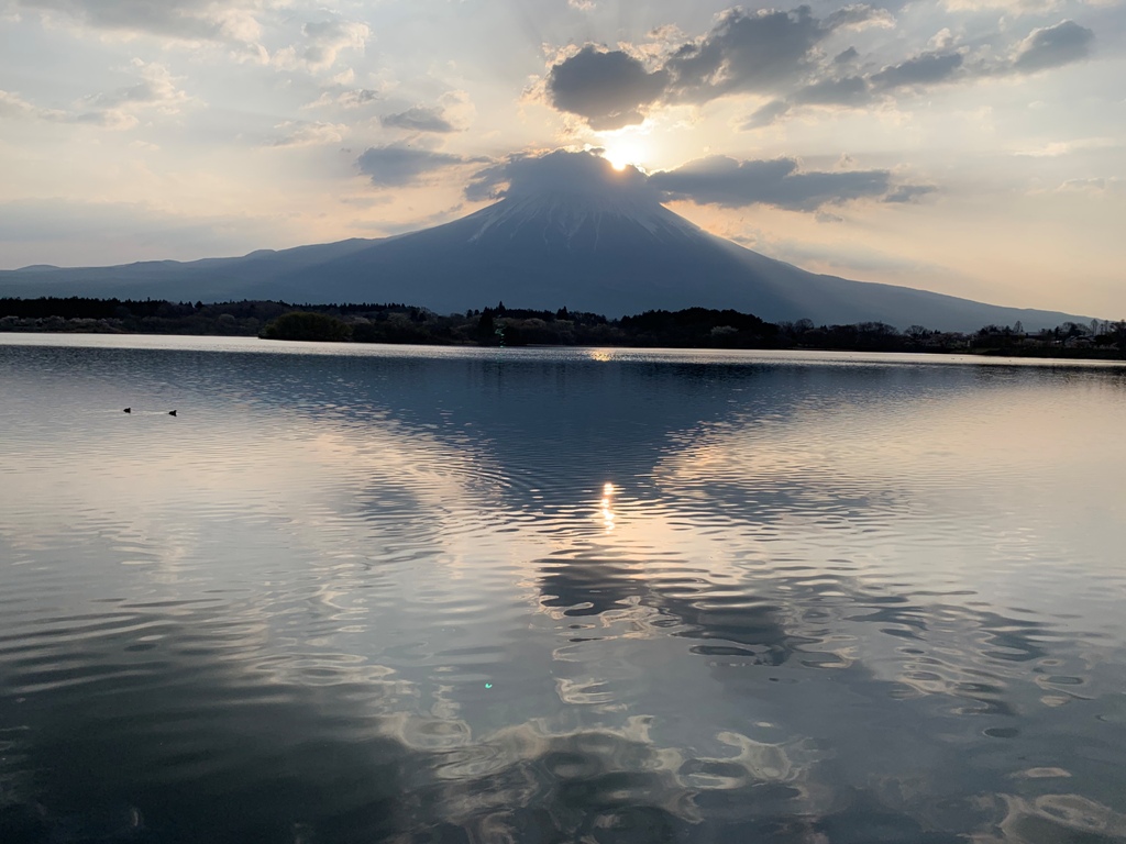 朝目覚めて外を見ると、田貫湖の背後に、頂上付近に雲を纏った富士山が裾野を広げている。直ぐに支度をして、国民休暇村富士下の展望デッキに下りる。6時前だというのに、そこは大勢の素人カメラマンで占拠されていた。そこの案内板に逆さ富士、ダイヤモンド富士についての説明があった。それによると、「毎年4月の20日前後と8月の20日前後に、富士山の頂からのぼる太陽が、ダイヤモンドのように輝いて見えます。空気の澄んでいる4月が、より美しいといわれます」と明記している。今日はまさにその日に近く、大勢の人が集まっているゆえんだ。残念ながら頂上付近だけ雲がかかり、その現象はみられなかった。急いでそこを離れ、田貫湖の奥の方に向かう。すると、ダイヤモンド富士は駄目だったが、はっきりとした逆さ富士を見ることが出来た。しかも、満開の桜越しに、逆さ富士を写真に収めることが出来た。長者山田貫神社まで足を延ばし、1時間程で国民休暇村富士に戻る。