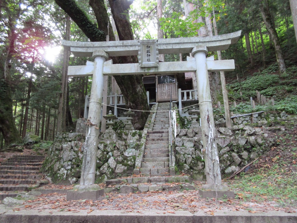 次に、東山街道を更に登って神坂神社に向かう。途中暮白の滝を見て、鬱蒼とした大木の中に佇む神坂神社にお参りする。