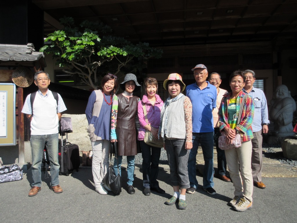 7時の朝食後、車2台で昼神温泉入口付近の名物朝市に出かける。この時期松茸が旬で、沢山並んでいた。湯元ホテル阿知川玄関で記念写真を撮り、9時に出発する。