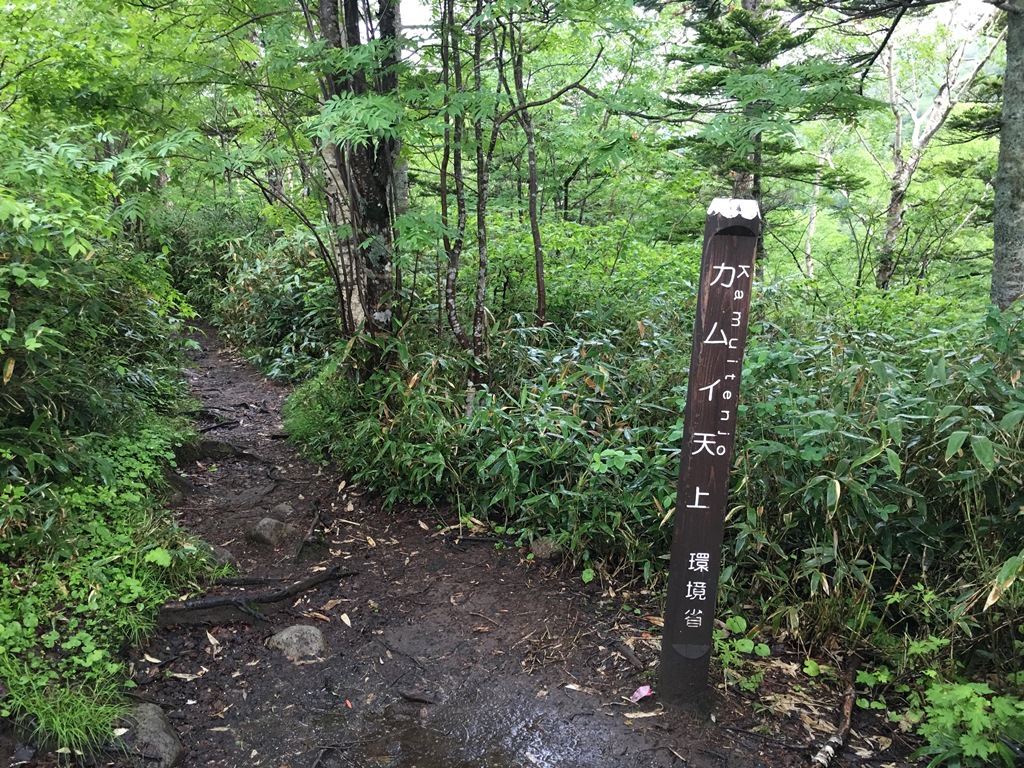 天気予報どおり曇ながら、雨は完全にあがっていた。トムラウシ短縮コ-ス登山口まで車で行き、そこを3時40分に出発する。トムラウシ山は標高2,141mで決して高くないが、ここから山頂までの標高差1,181m、距離9.2Kmあり、結構ハ-ドな登山だ。カムイ天上までは泥んこ状態の登山道を、スリップと登山靴の浸水に気をつけながら、ジグザグ歩行を余儀なくされる。熊笹を中心とした低灌木帯で覆われている。25分で温泉コ-ス分岐を通過し、1時間10分でカムイ天上に達する。トムラウシ短縮コ-ス登山口から温泉コ-ス分岐まで1.1Km、カムイ天上は通過点で前トム平まで6.6Kmの長丁場だ。