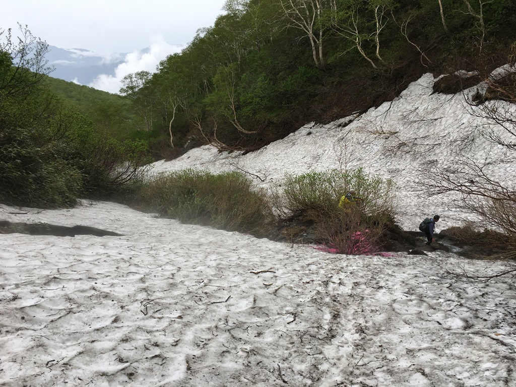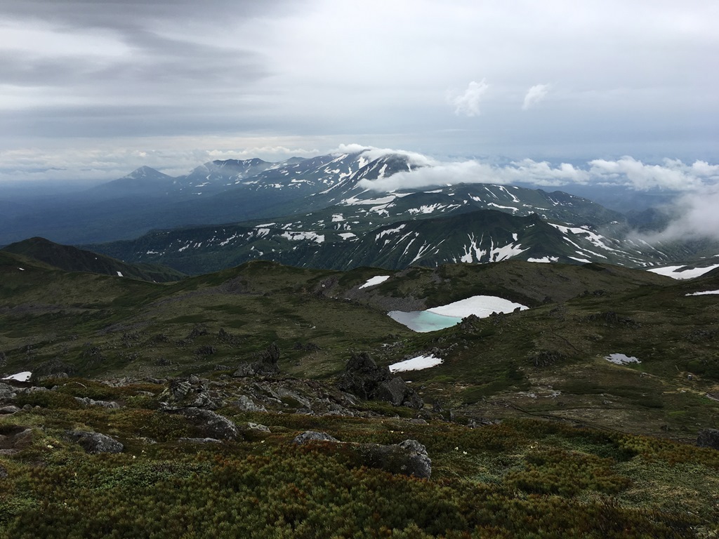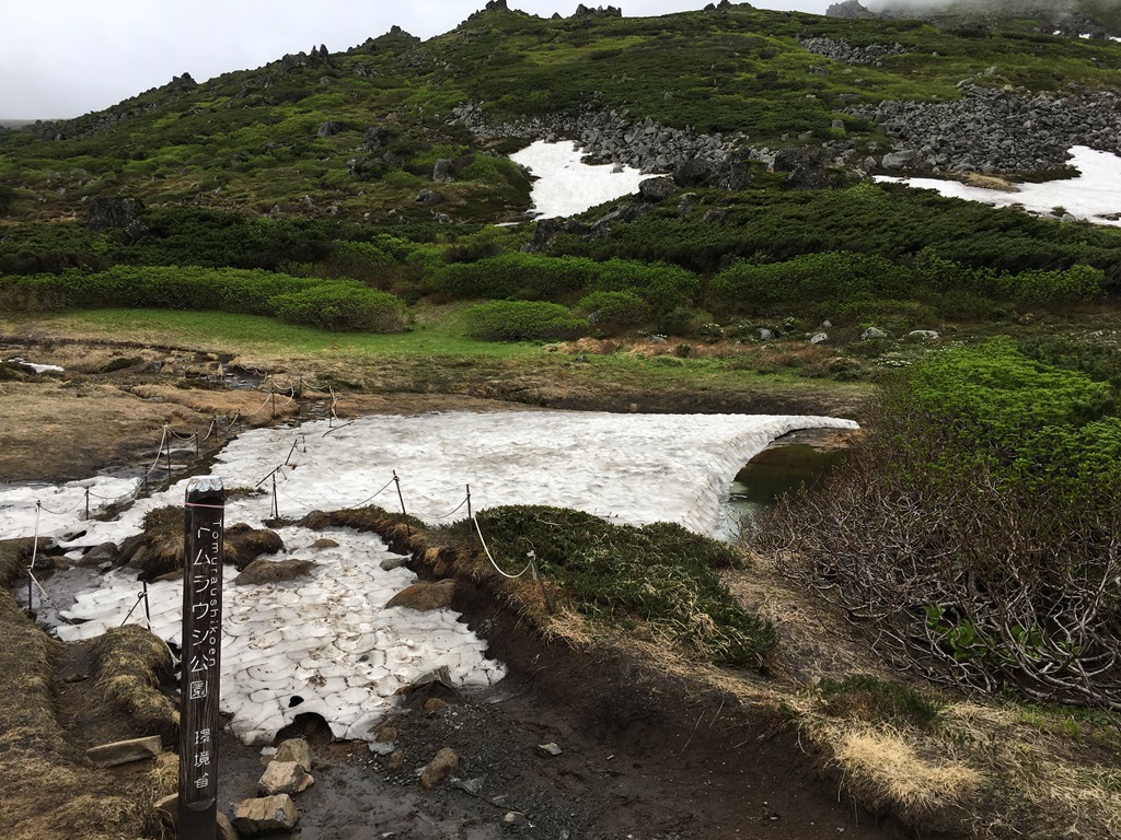 カムイ天上から泥んこの登山道と、木道の単調な上りとなる。そこから下りが続き、その先に急勾配の雪渓が現れる。そこを下りきるとコマドリ沢分岐まで歩き易い雪の巻道となる。ペンキとテ-プで表示があるため迷うことはない。コマドリ沢まで下り、沢は難なく渡れた。そこから本登山一番の長い雪渓の上りとなる。アイゼンは無くても良さそうだが、登り易くするためアイゼンを装着した。雪渓上部の前トム平取付標識から前トム平まで砂礫帯の急登となる。ロ-プで区画されているので、安心して歩ける。私は35分で何とか前トム平につくが、息のあがりで体力低下を全身で感じる。連れに引返すかといわれるが、その選択はない。視界が開けるが、ガスッて近回りしか見えない。ここから先山頂まで、残すところ2.6Kmだ。はい松とガレ場のゆるやかな稜線を暫く進むと、急な岩場にぶつかる。そこを上りきると、トムラウシ公園の池と点在する雪渓群が眼下に広がる。トムラウシ公園内はロ-プで通路を指定されているが、雪渓と小川の横断のため外れざるを得ない。この付近から早時期の高山植物が群落する。特にシャクナゲの可憐な白い小さな花が目を癒す。ここのシャクナゲは地を這って低木で可愛い。他にチングルマ、エゾツツジ、エゾノツガザクラ、エゾノハクサンイチゲ、チシマノキンバイソウ等に出会う。ゆるやかな開けた登山道を1時間程かけて進むと十勝岳分岐だ。そこから急登の岩場となるが、山頂まで後わずかで多少余裕が生まれる。それでも40分を要し、山頂に着くまで非常に長く感じる。10時33分登頂で、トムラウシ短縮コ-ス登山口から7時間近くかかる。トムラウシ山頂(2,141m)はガスの中で何も見えない。