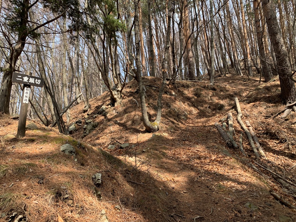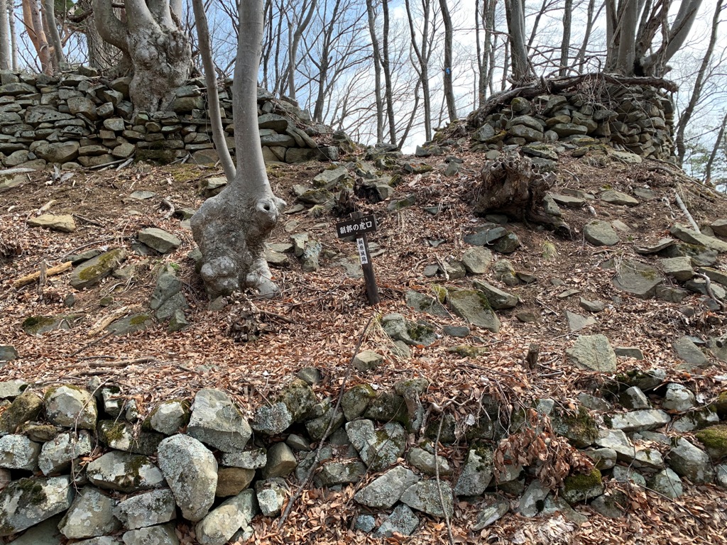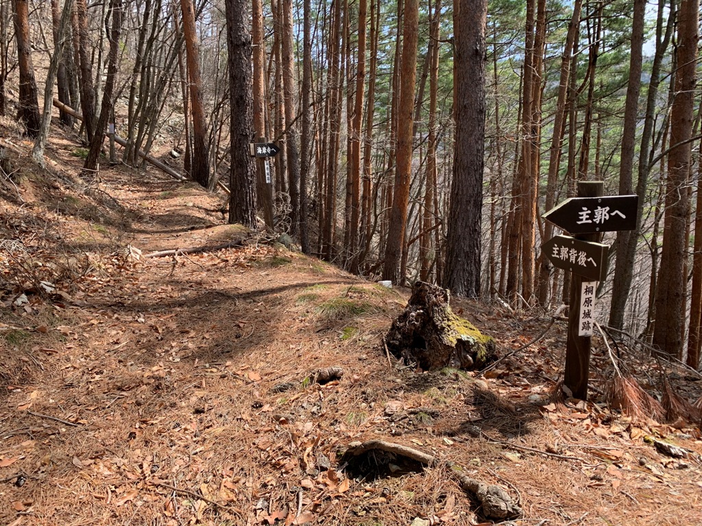 入山辺の追倉沢沿いに進むと、注連縄をした道祖神がある。その手前を斜めに行くと防獣柵がある。そこに桐原城の案内板があるので、防獣扉を開けて右方向に進む。道は整備されており、30分程で着く。帰路は海岸寺方向に下ったが、途中で落葉のため道を失い尾根伝いに下ることになる。防獣柵があるので防獣扉を見つけて外に出ると、民家の裏庭だった。民地を通り道路に出ると海岸寺跡があった。そこから、道路を5分程歩いて登り口に戻る。