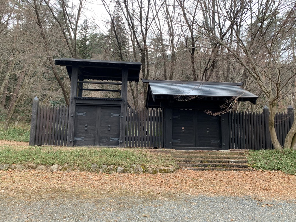 穂高しゃくなげ温泉前の山麓線を北へ900m程行くと案内標識がある。少し山側に入ると模擬門、櫓が目に入り、その前が駐車場になっている。そこから、車が通れる林道を暫く歩くと広場があり、そこが小岩嶽城址公園で主郭跡部分だ。