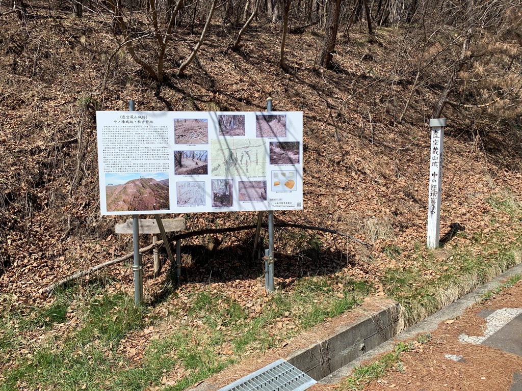 会田盆地の北にそびえる地域の象徴、虚空蔵山に築かれた山城です。筑北地方との境を分ける巨大な壁の役目を果たしています。山頂の峯ノ城、山腹にある秋吉砦や中ノ陣城など、いくつかの城が集まった城塞群と呼ぶべき構えです。(松本市HP転記)