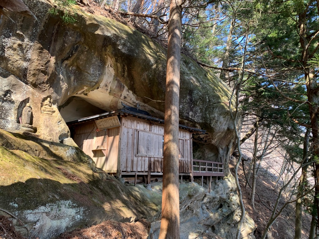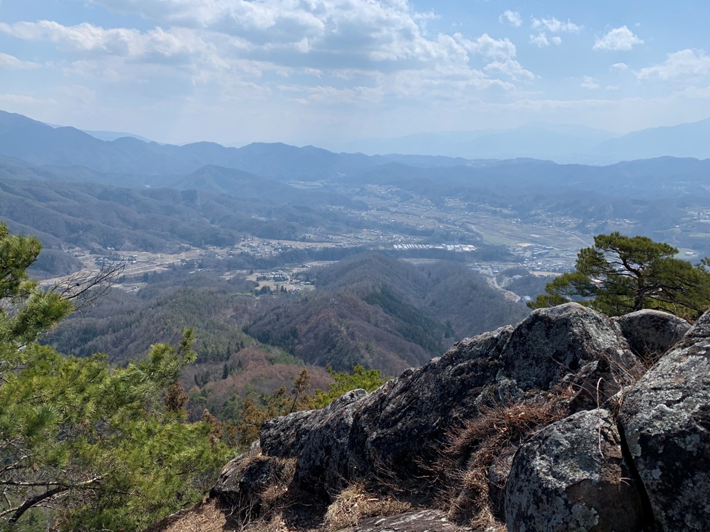 中ノ陣城跡はそこから500m程で、山道が整備されているので10分ぐらいで着く。峯ノ城跡は引返して行くのが通常だが、近くの尾根に取りつき直接登ることにする。同じ考えの人がいるのか、踏み跡が続いている。20分程で林道花川原線からの登山道にぶつかる。そこから峯ノ城跡は300mだ。峯ノ城跡は虚空蔵山の山頂に築城されていた。山頂から北アルプスの眺めがすばらしい。帰路は通常のコ-スの岩屋神社を経由して林道虚空蔵に下りる。そこから道路を歩いて中ノ陣城登り口まで戻る。