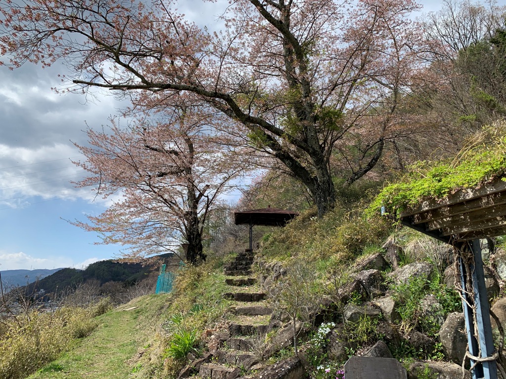 気を取り直して、向かって左側の山に向かう。東屋の先を左に入ったが、急坂のはっきりしない道で、途中で送電線方向に迷う。段丘状になっているのでそのまま進み、苦労はしたが30分程で目的の大和城主郭跡に着く。大和城跡には桜植樹記念碑があり、土塁がはっきり認められた。往路は道らしき踏み跡があったので、それを辿って行くと小さな祠二つと鳥居の所に出た。そこからも急坂の滑り易い踏み跡で苦戦して帰りつく。