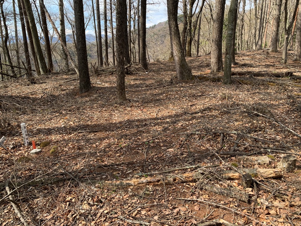 すぐ上に見える東屋をとおり小橋を渡ったところを左に進む。直進すると砂防堰堤の右に階段が続き、大和城への道と勘違いする。私は間違ってその道を辿り、大和山(1,120m)の三角点まで行ってしまう。表示がなければ、大見山まで行ってしまうところだった。途中の尾根上に郭らしき広場があったので、ついつい深追いをする。復路は高尾神社に下り、御社宮司跡に戻る。
